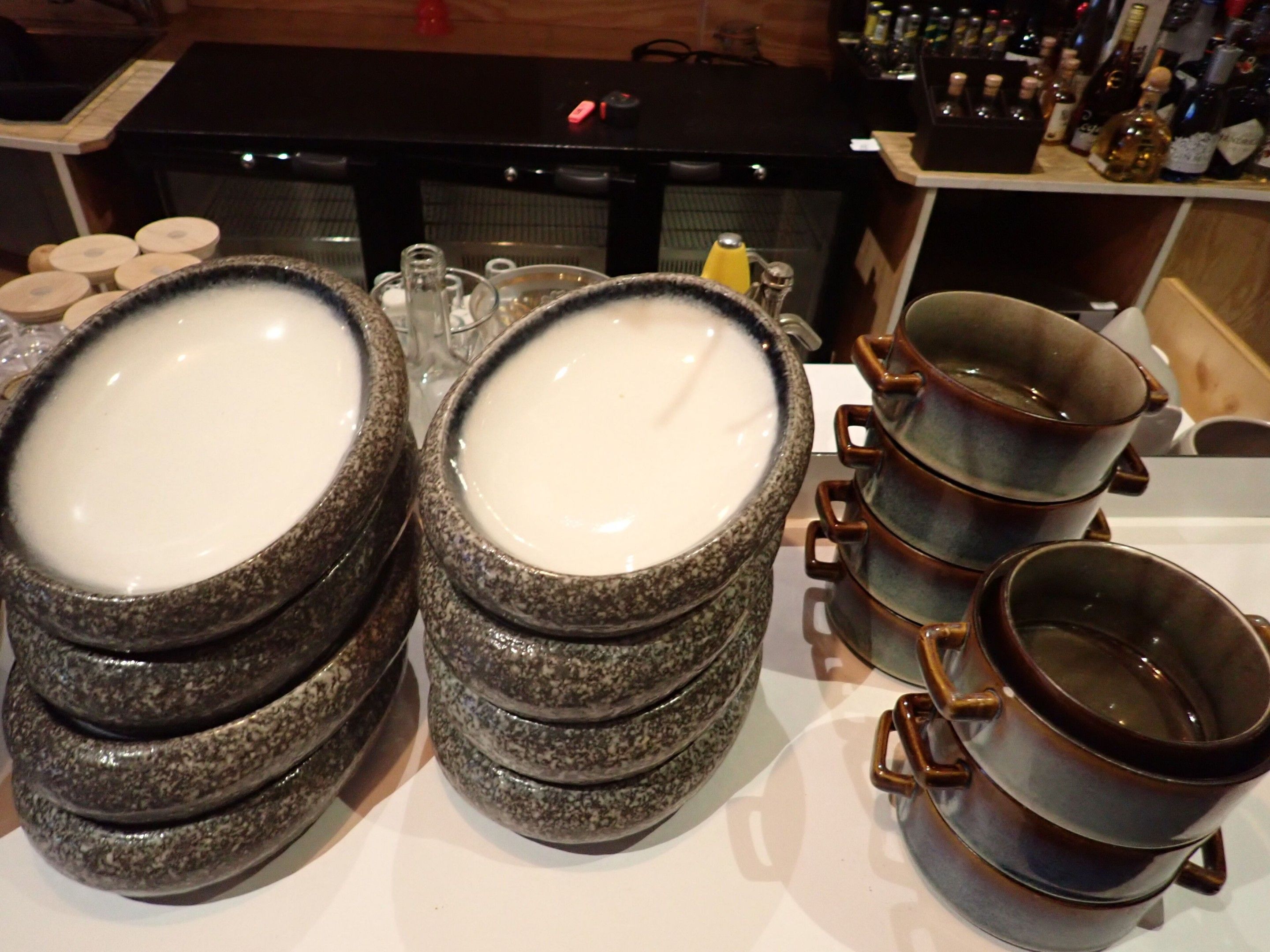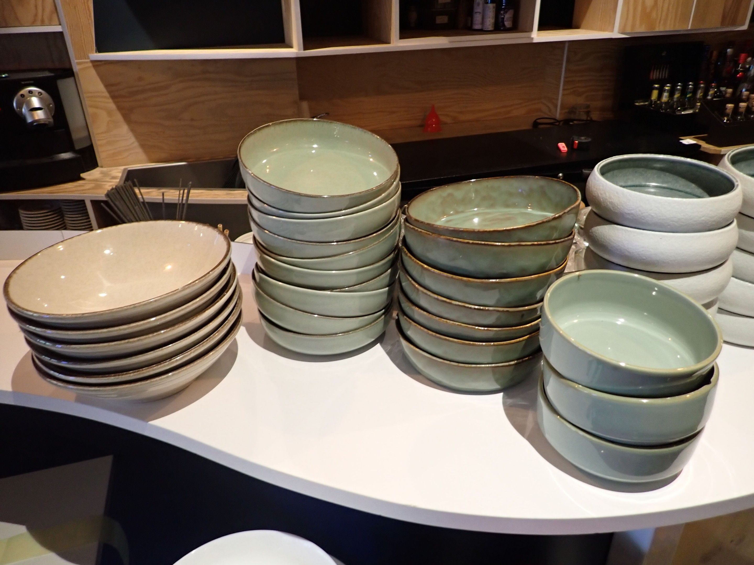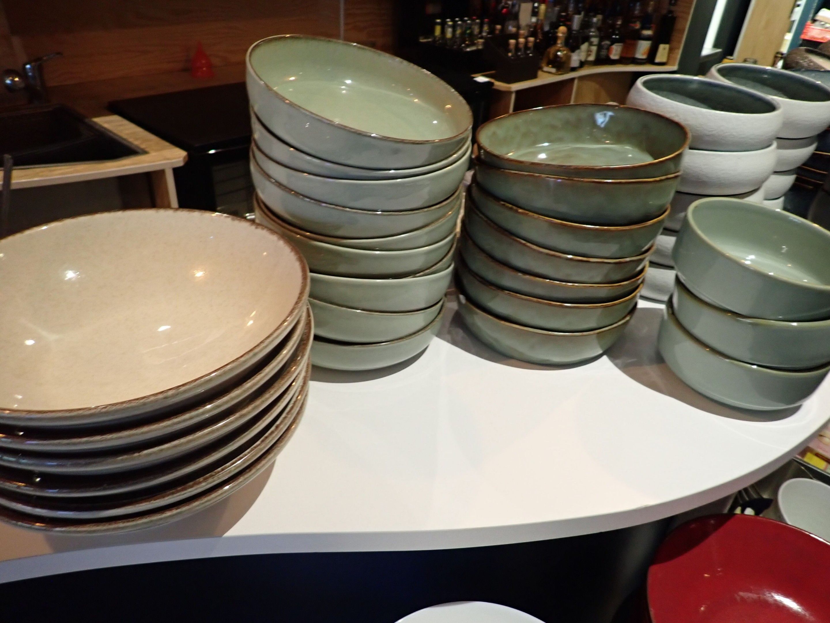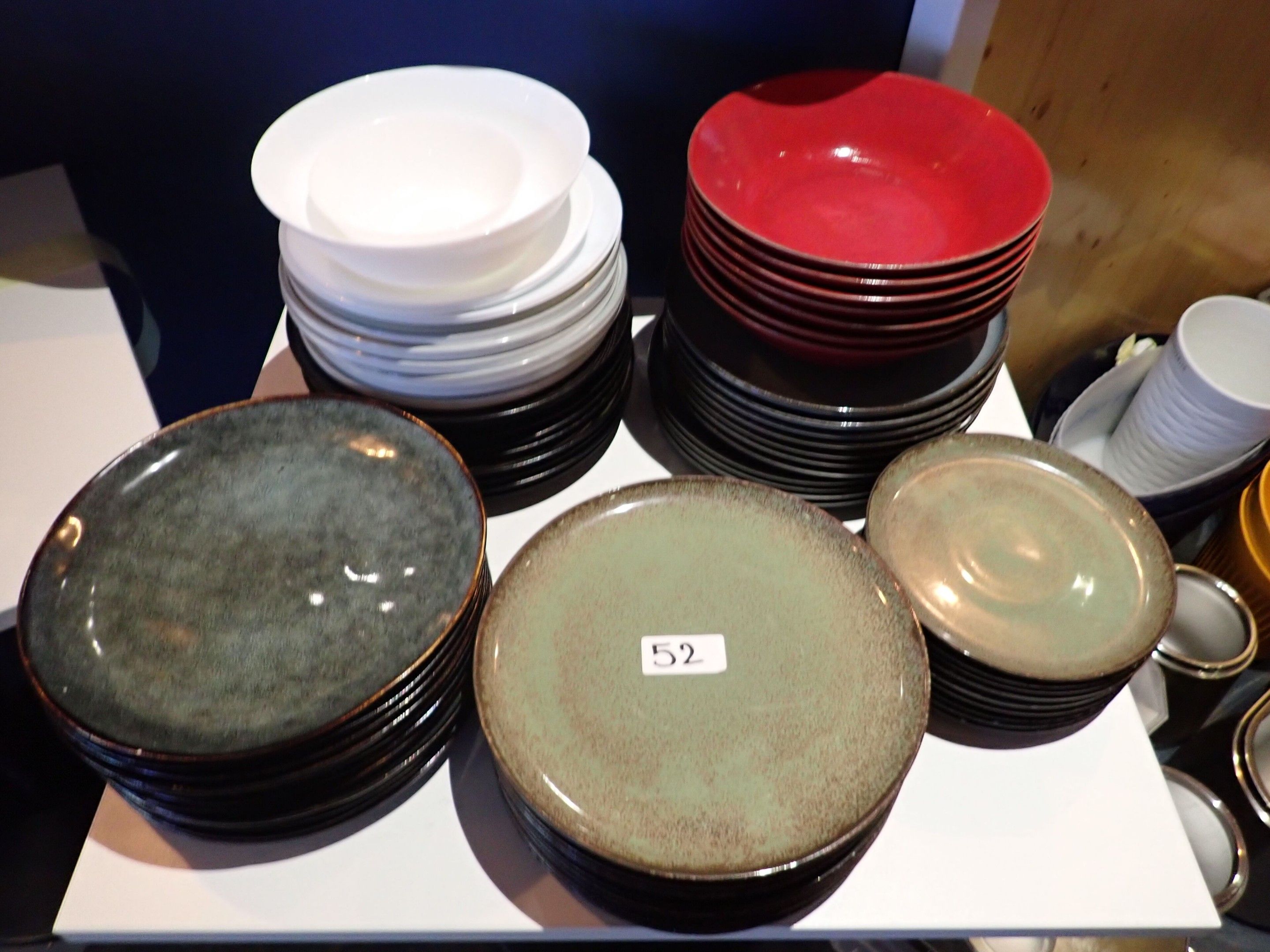 122 various plates, small plates, bowls modern black, gray, green, red, white, beige and 7 cassolettes blue, gray and brown, Judicial lot, Price 70