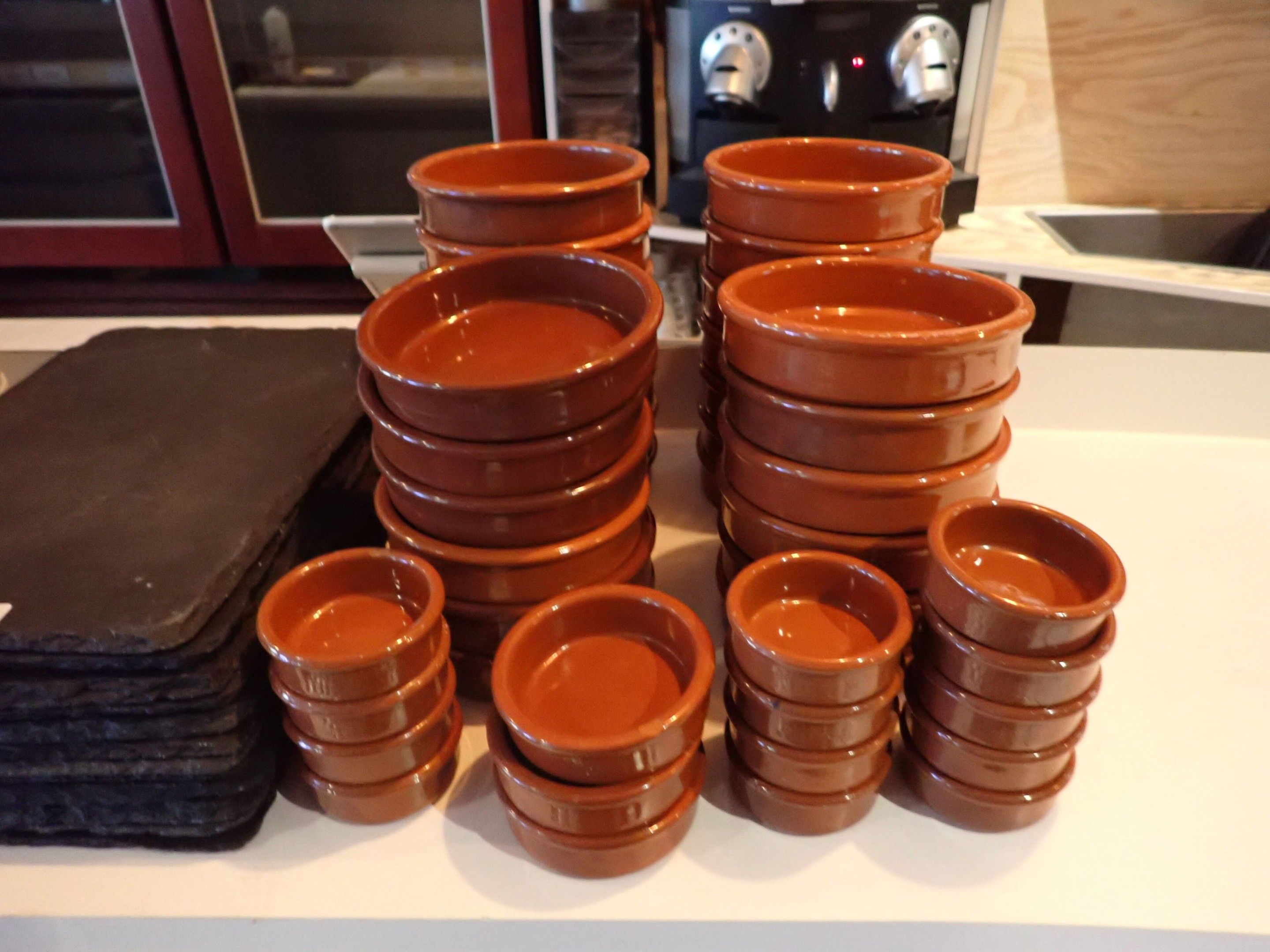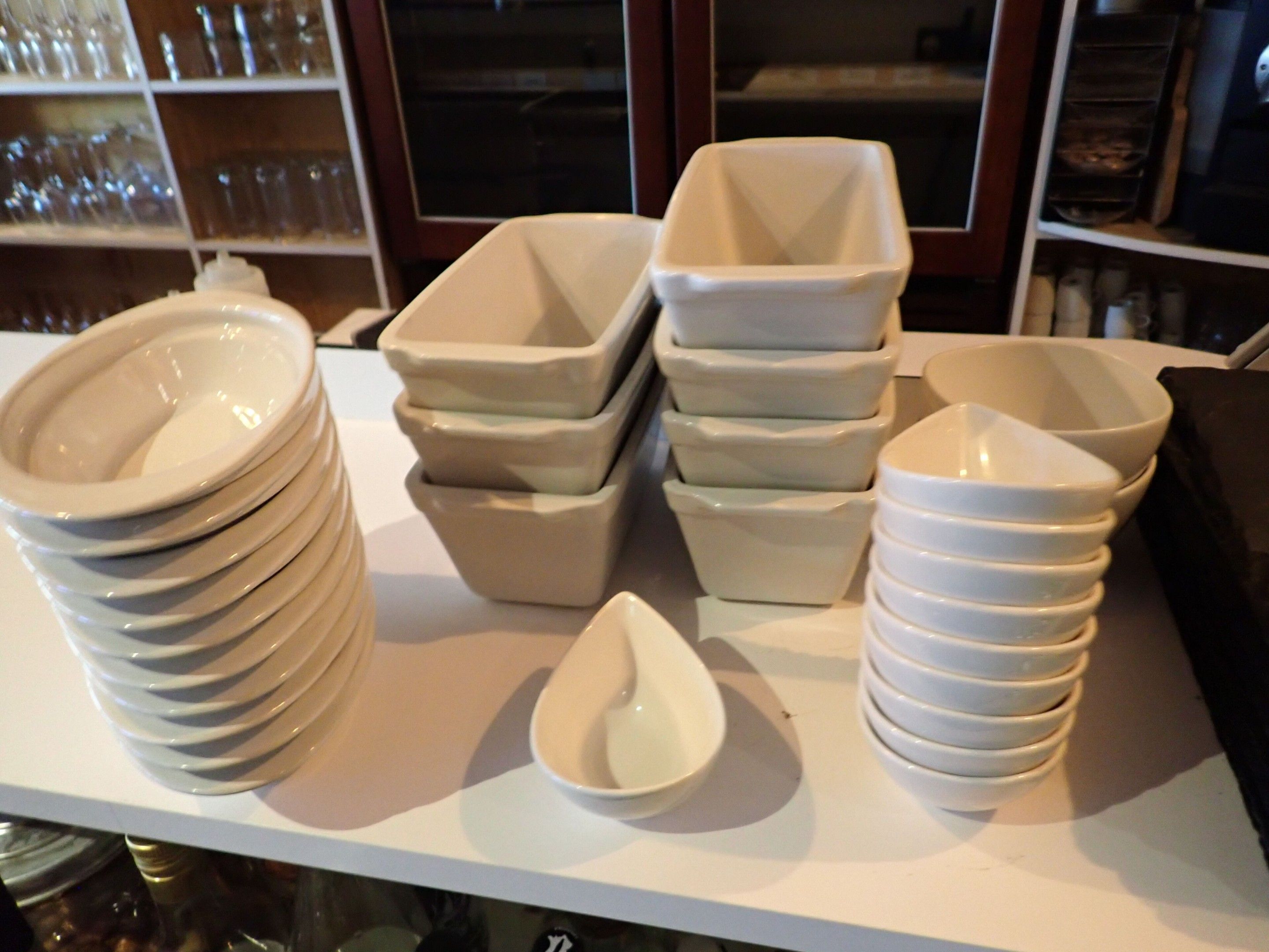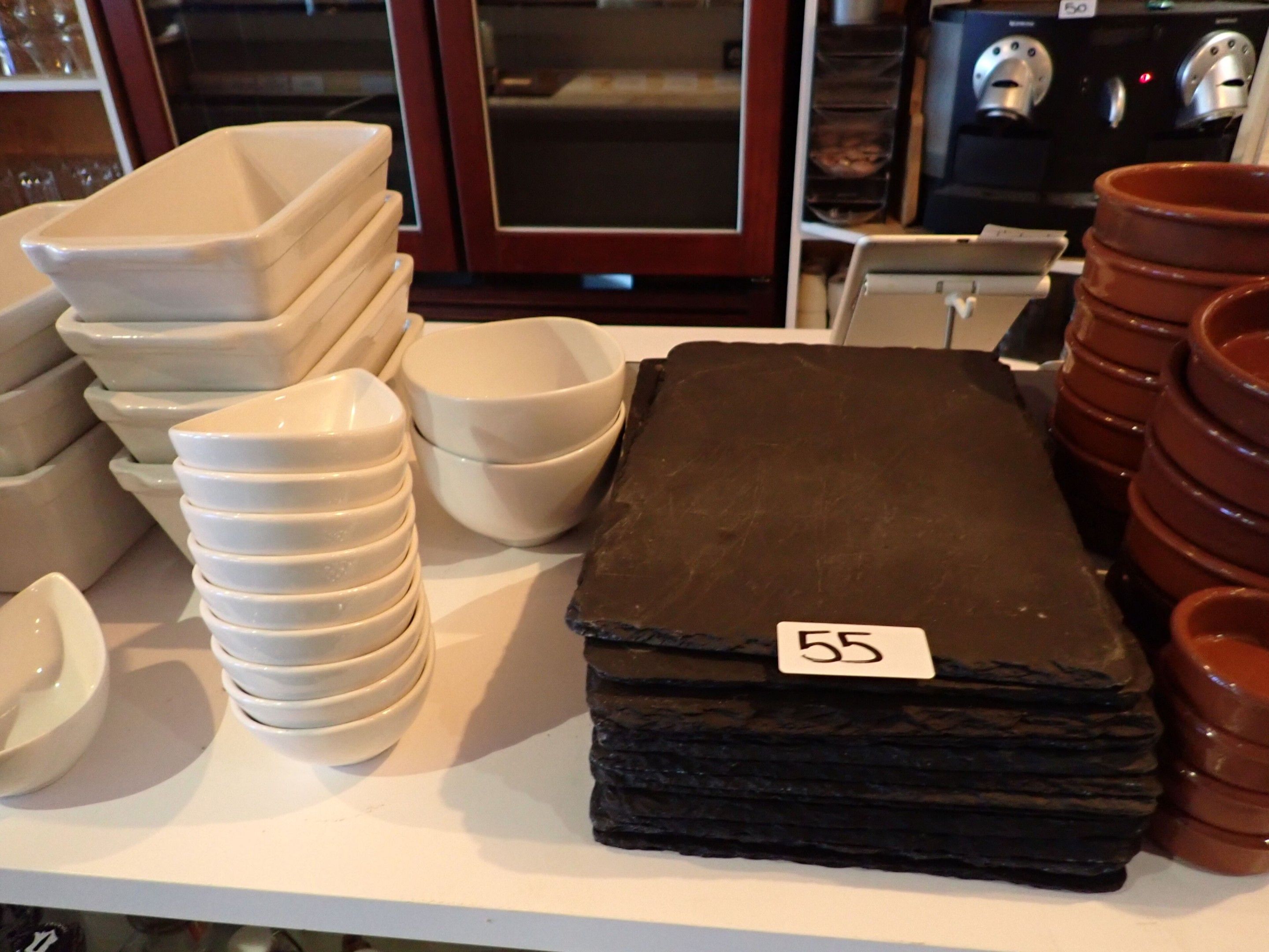 42 various ramekins, 12 slates, 7 rectangular terrines, 10 o…