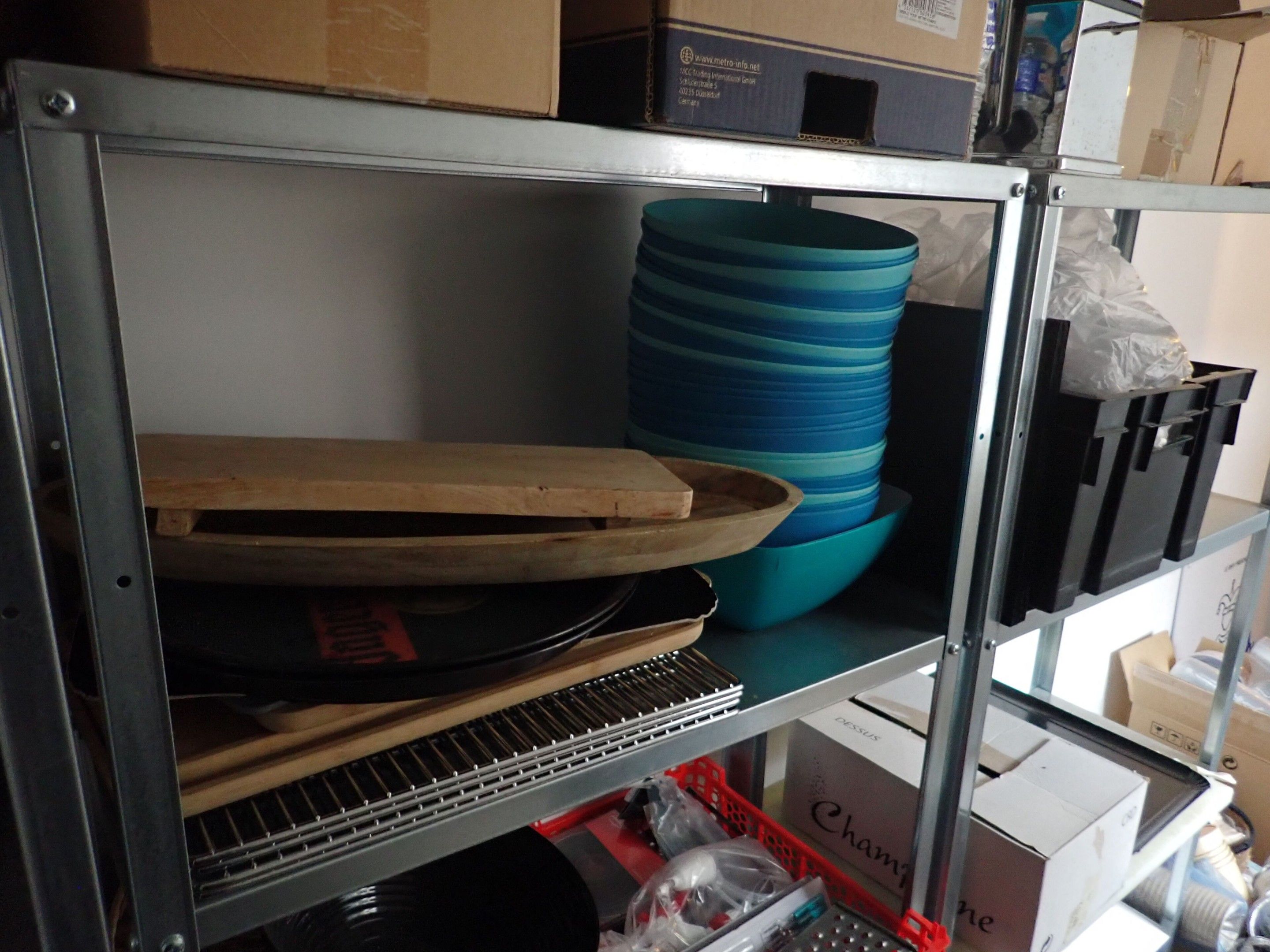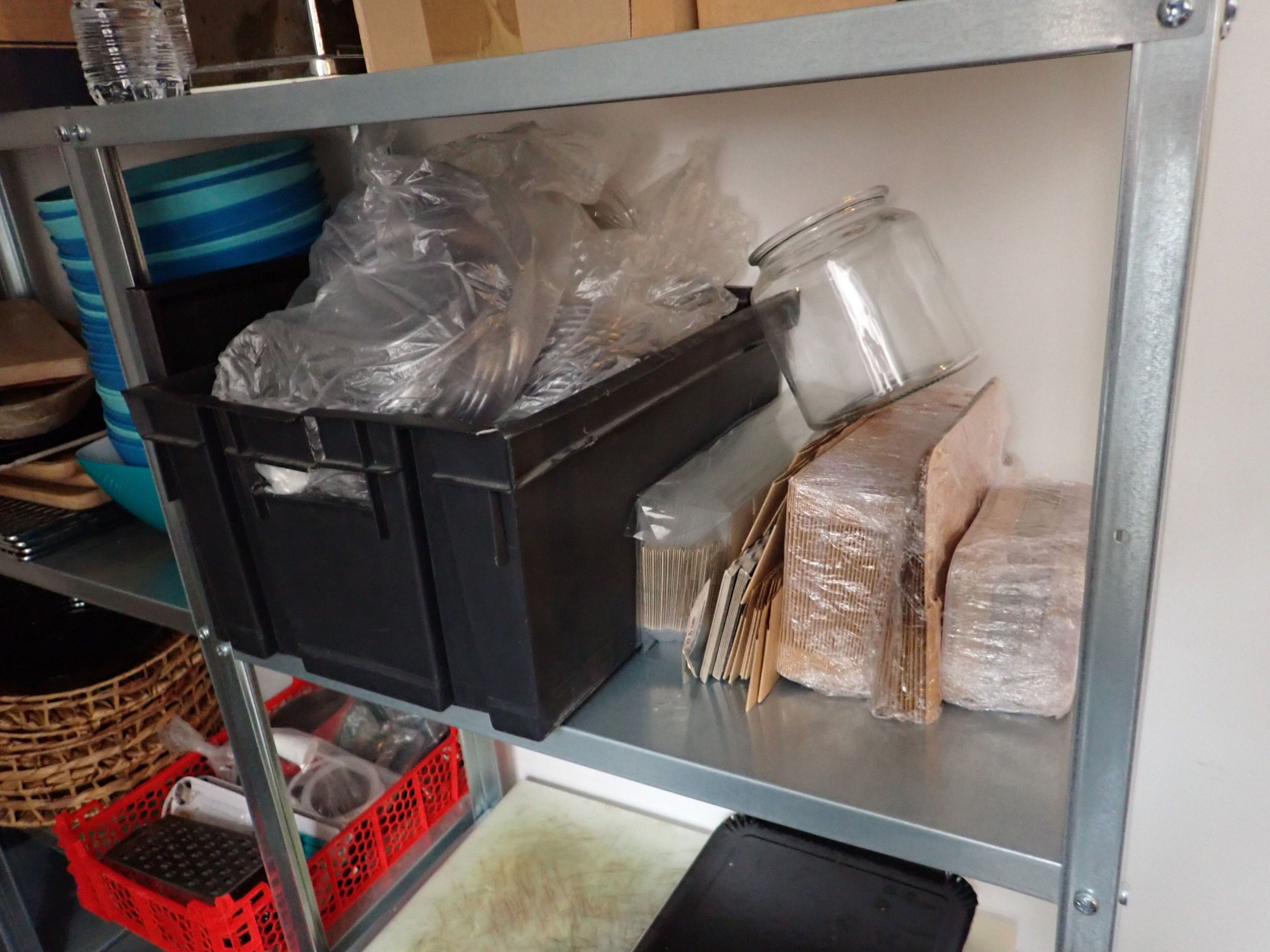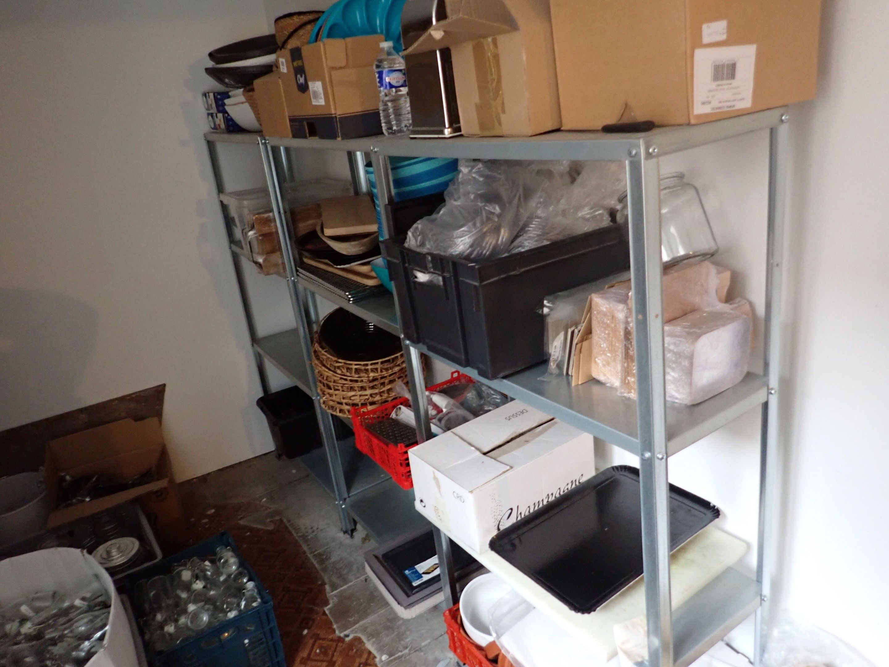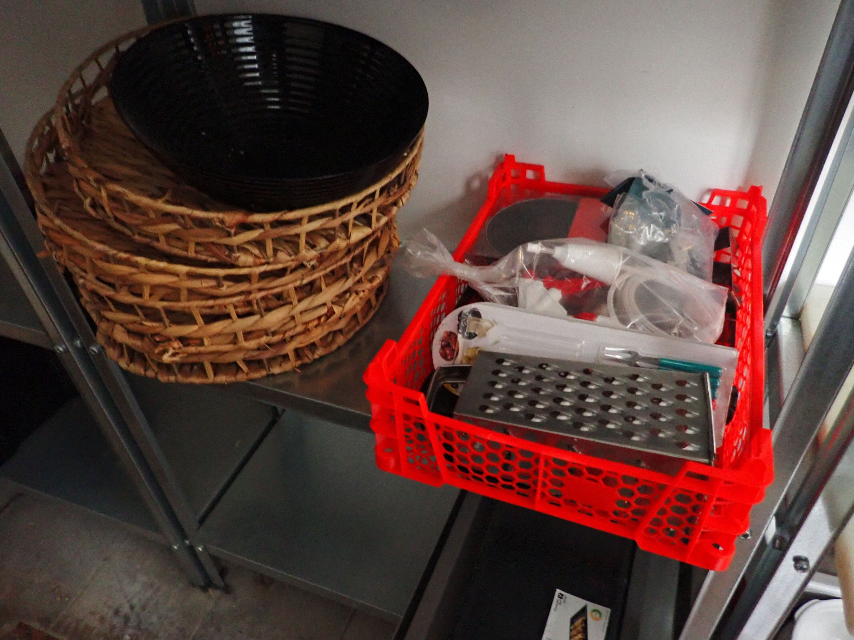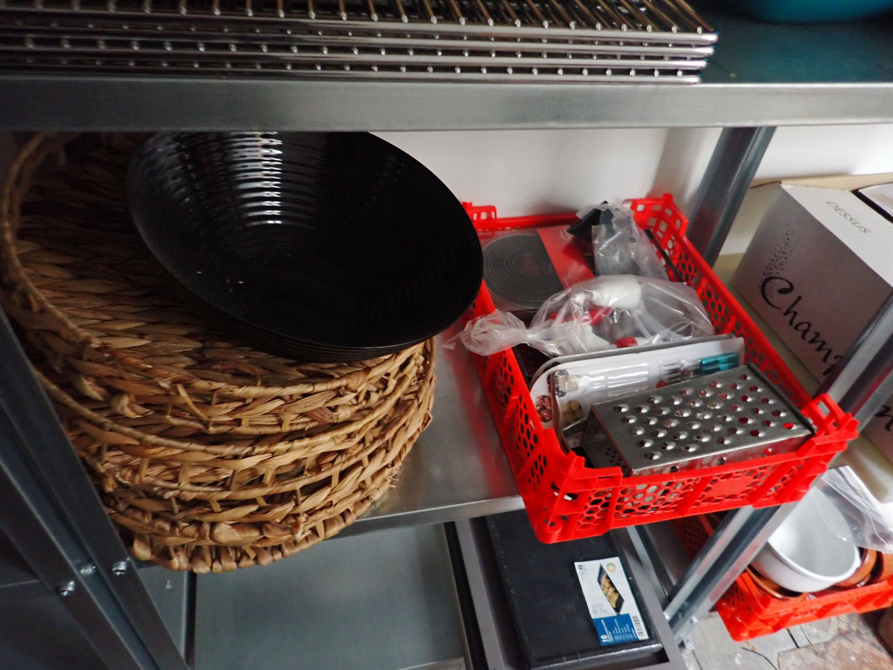 4 shelves 4 levels 70x29.5xh140 lined various emboitages, cassolettes sort pvc black, glass bottles with caps, 6 glass jars, circles, 3 cutting boards wood, water glasses DURALEX, salad bowls, tray polyester, baskets, grids, trays, 4 rattan trays, plates oysters pvc, kitchen utensils, ramekins, old stainless steel smoker HS, Judicial Lot, Price 40