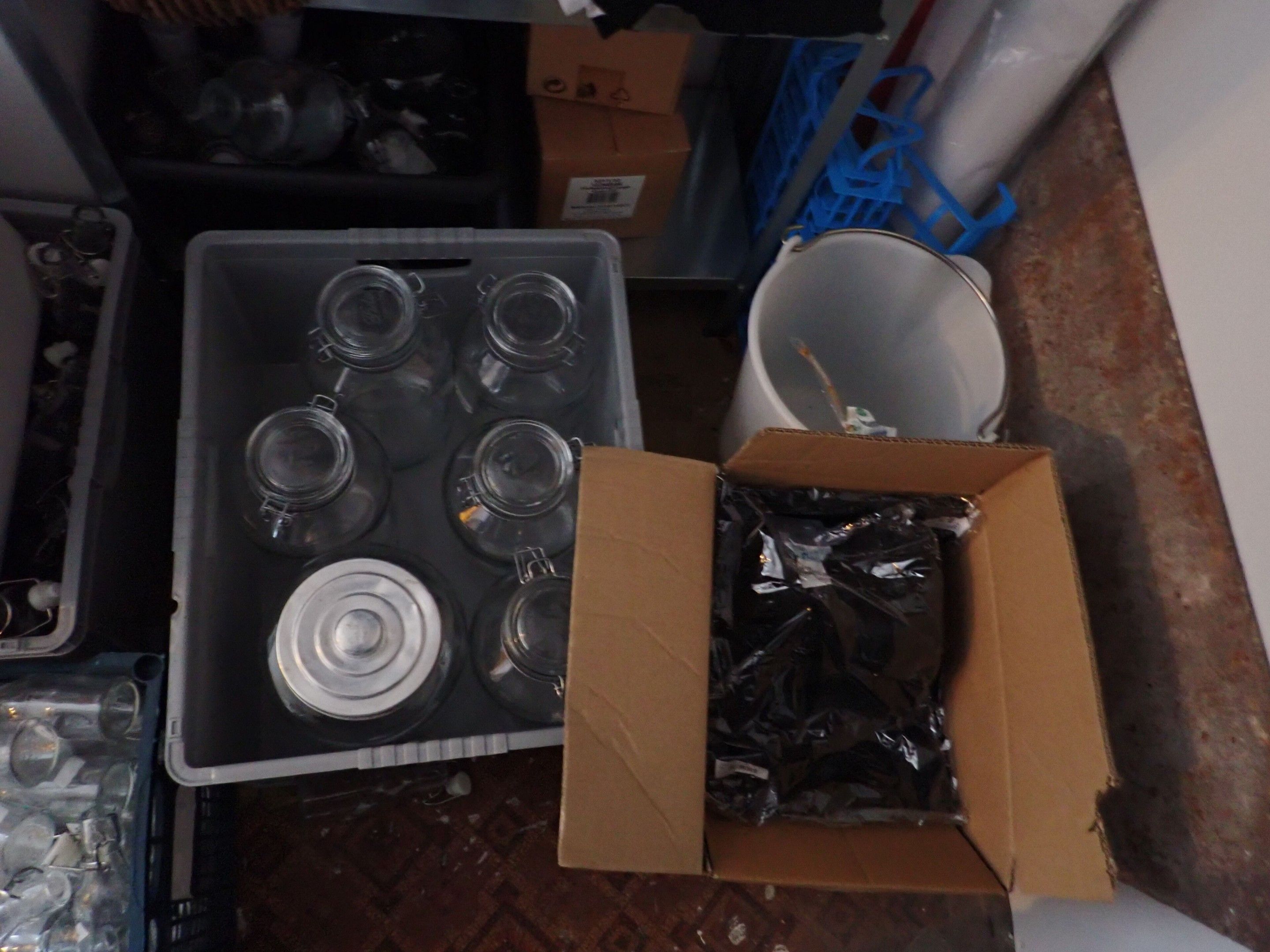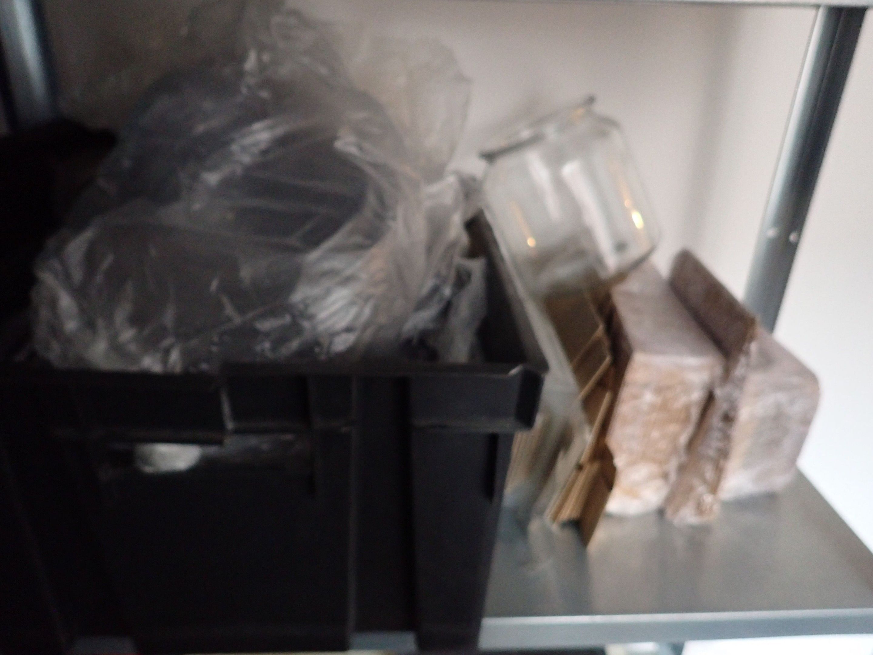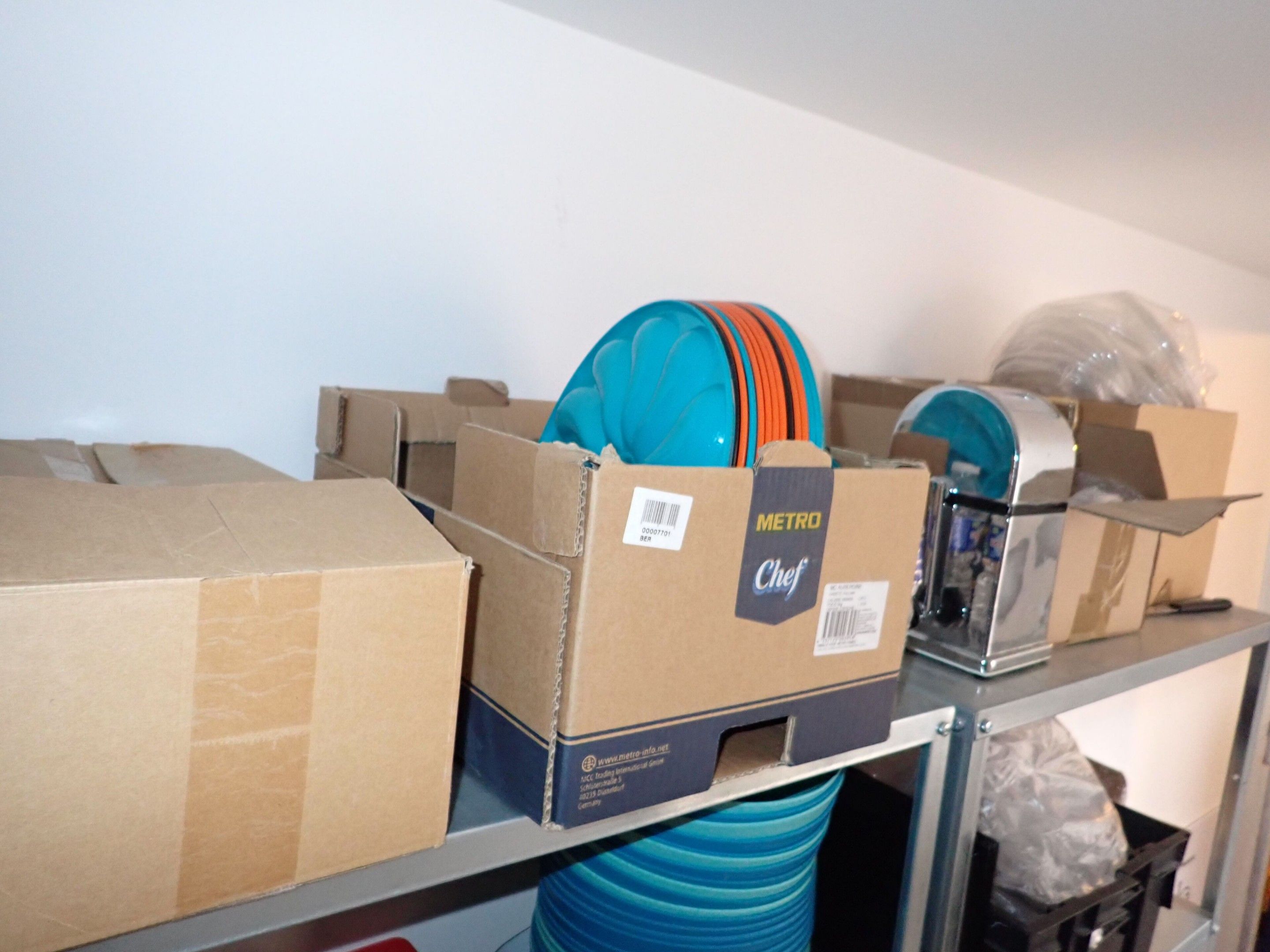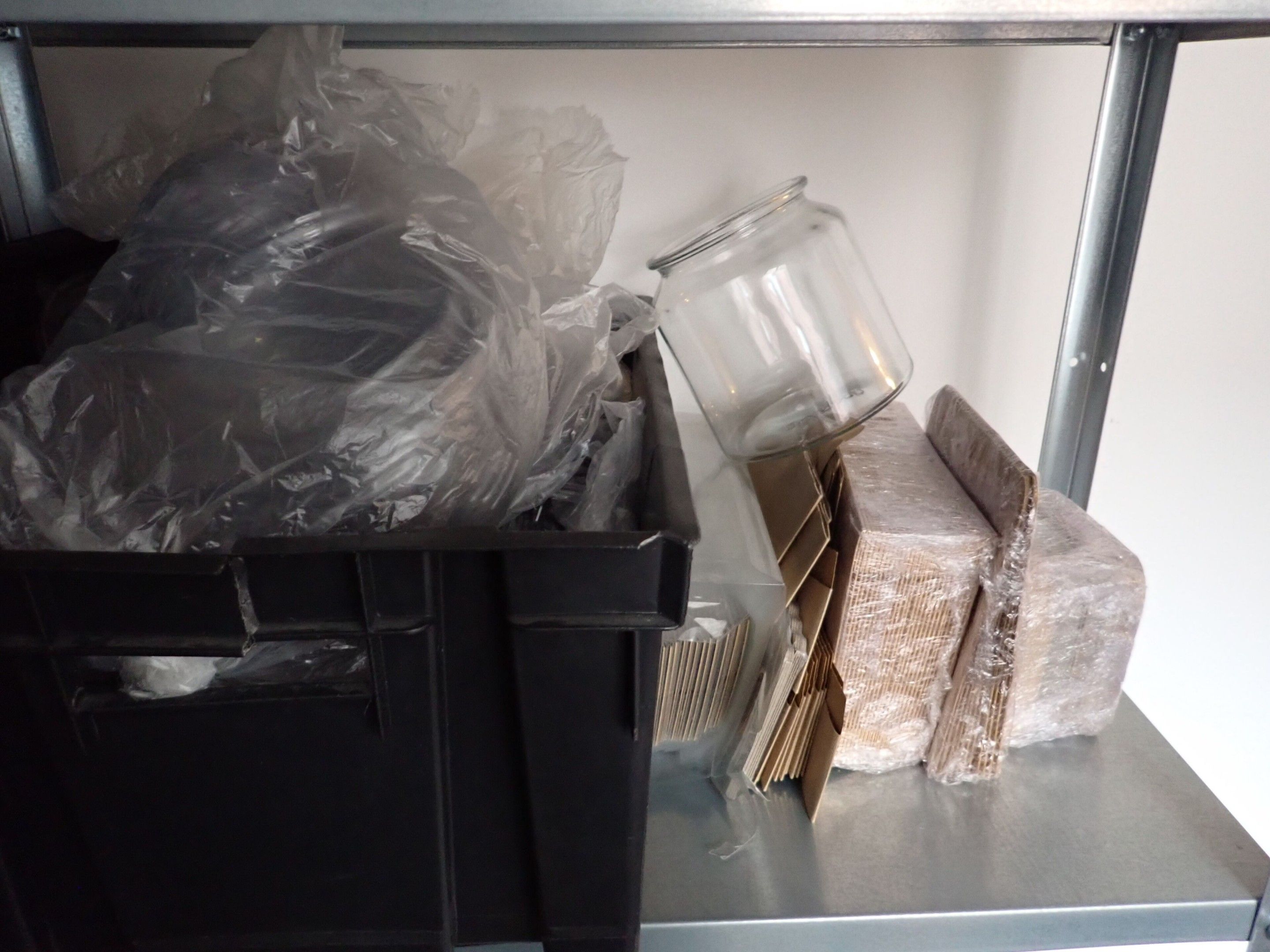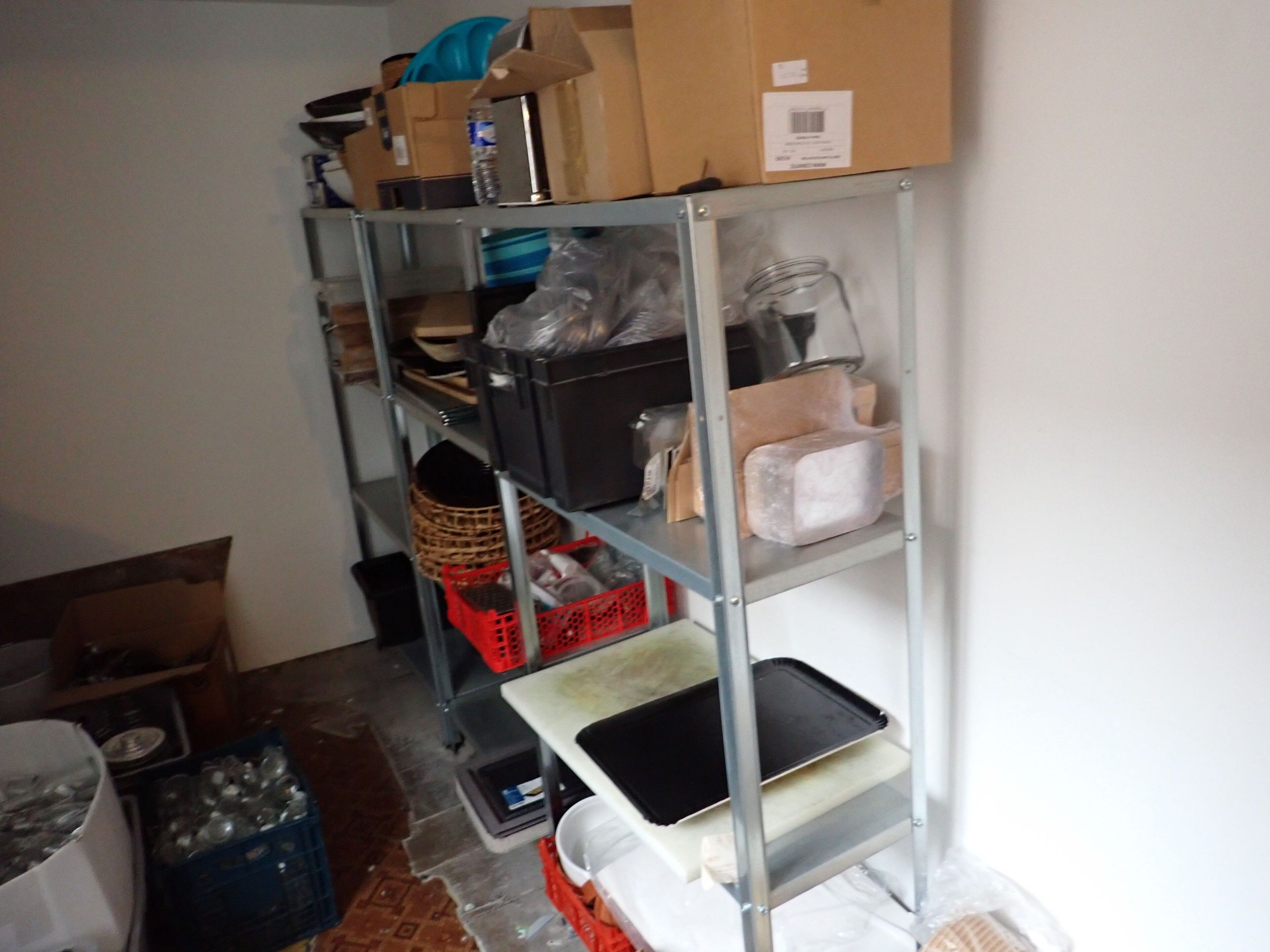 4 shelves 4 levels 70x29.5xh140 lined various emboitages, cassolettes sort pvc black, glass bottles with caps, 6 glass jars, circles, 3 cutting boards wood, water glasses DURALEX, salad bowls, tray polyester, baskets, grids, trays, 4 rattan trays, plates oysters pvc, kitchen utensils, ramekins, old stainless steel smoker HS, Judicial Lot, Price 40