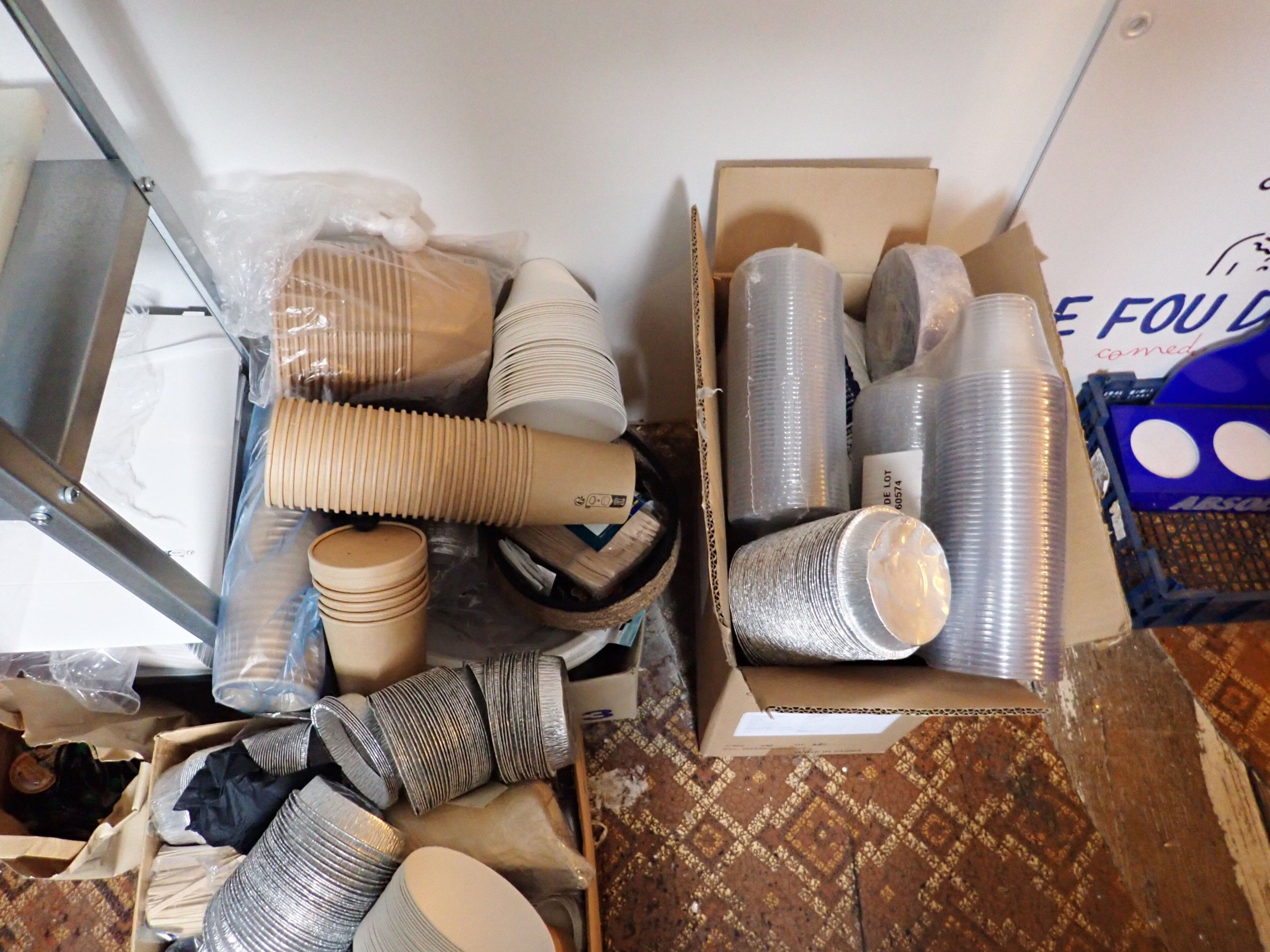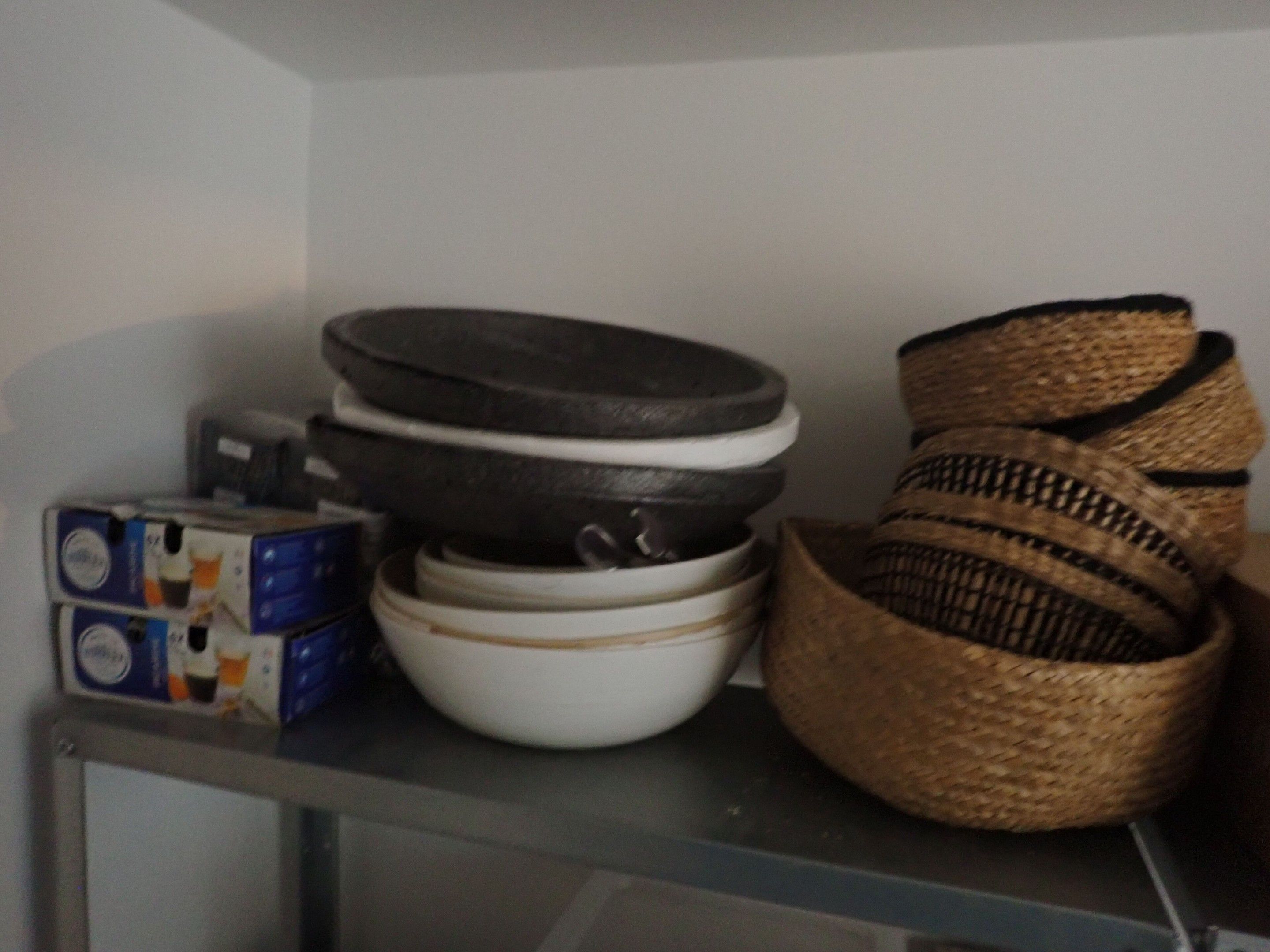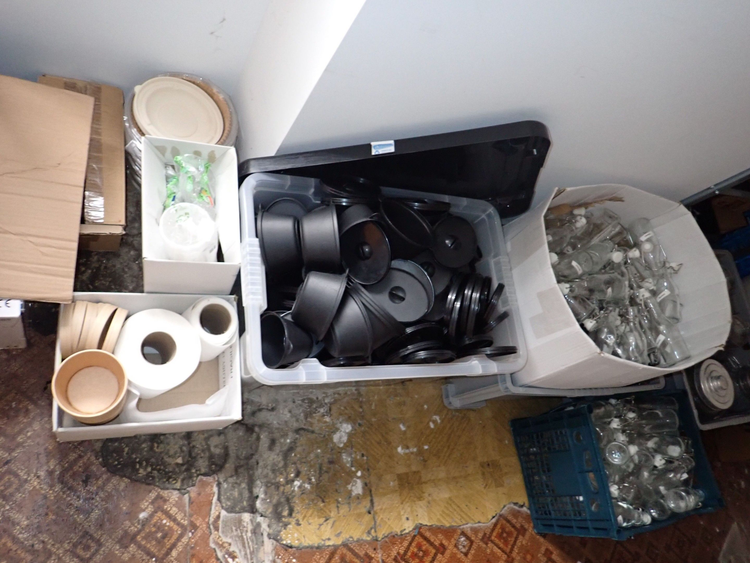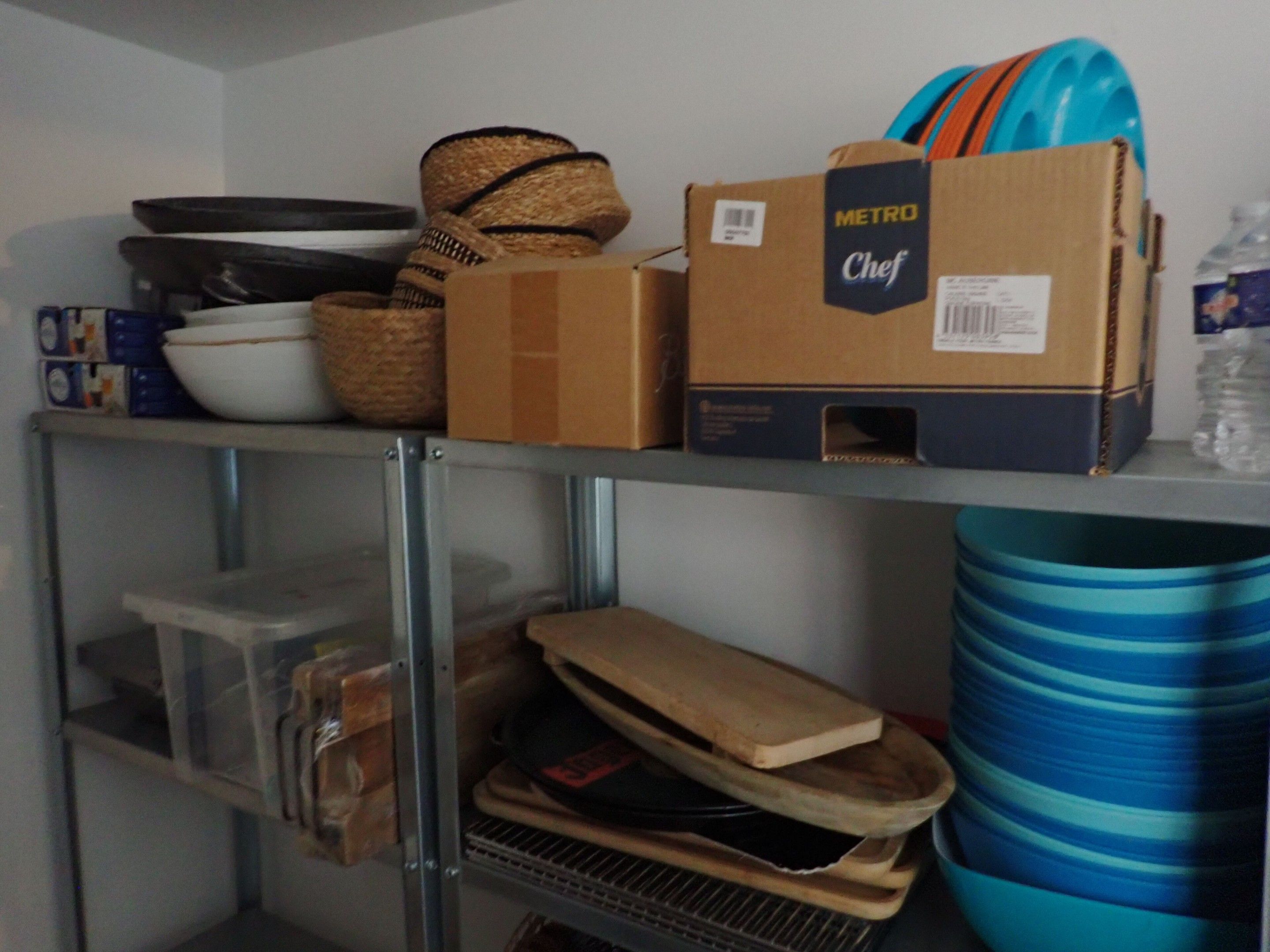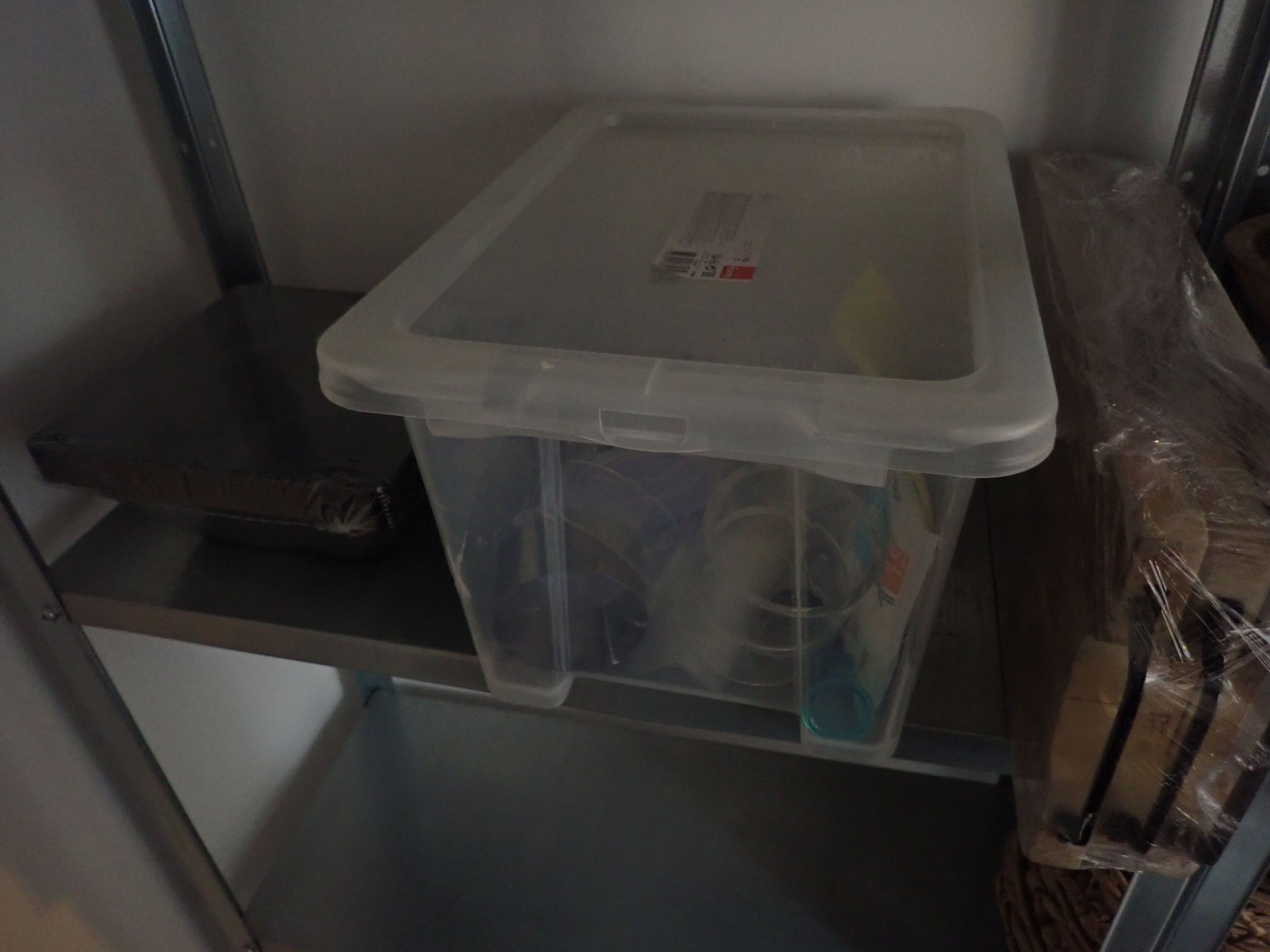 4 shelves 4 levels 70x29.5xh140 lined various emboitages, cassolettes sort pvc black, glass bottles with caps, 6 glass jars, circles, 3 cutting boards wood, water glasses DURALEX, salad bowls, tray polyester, baskets, grids, trays, 4 rattan trays, plates oysters pvc, kitchen utensils, ramekins, old stainless steel smoker HS, Judicial Lot, Price 40