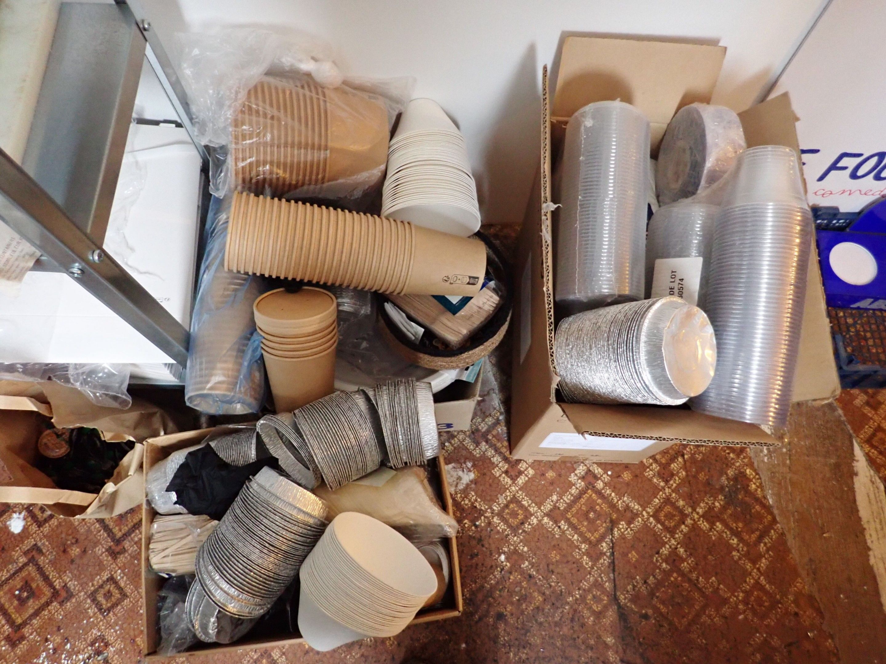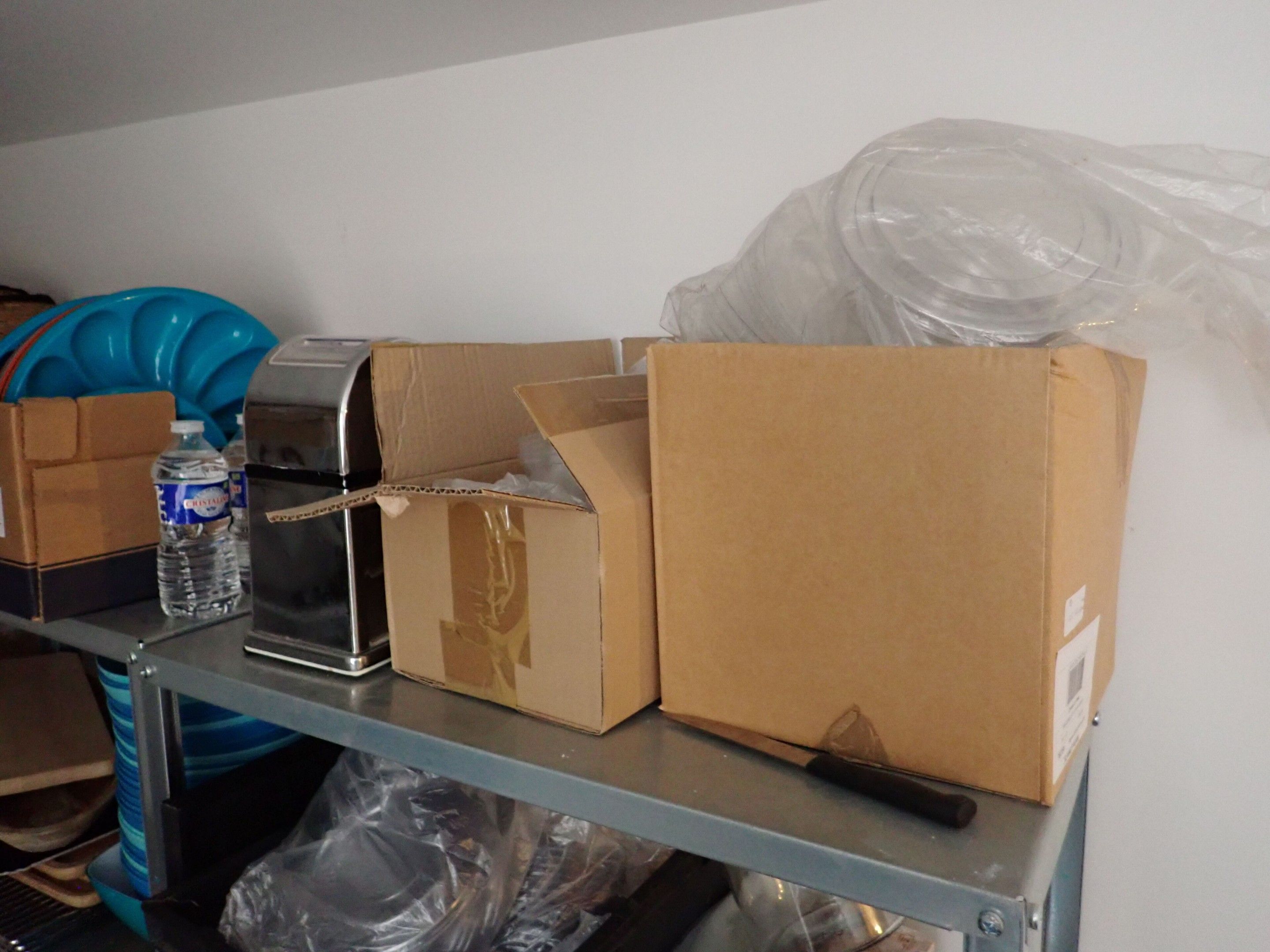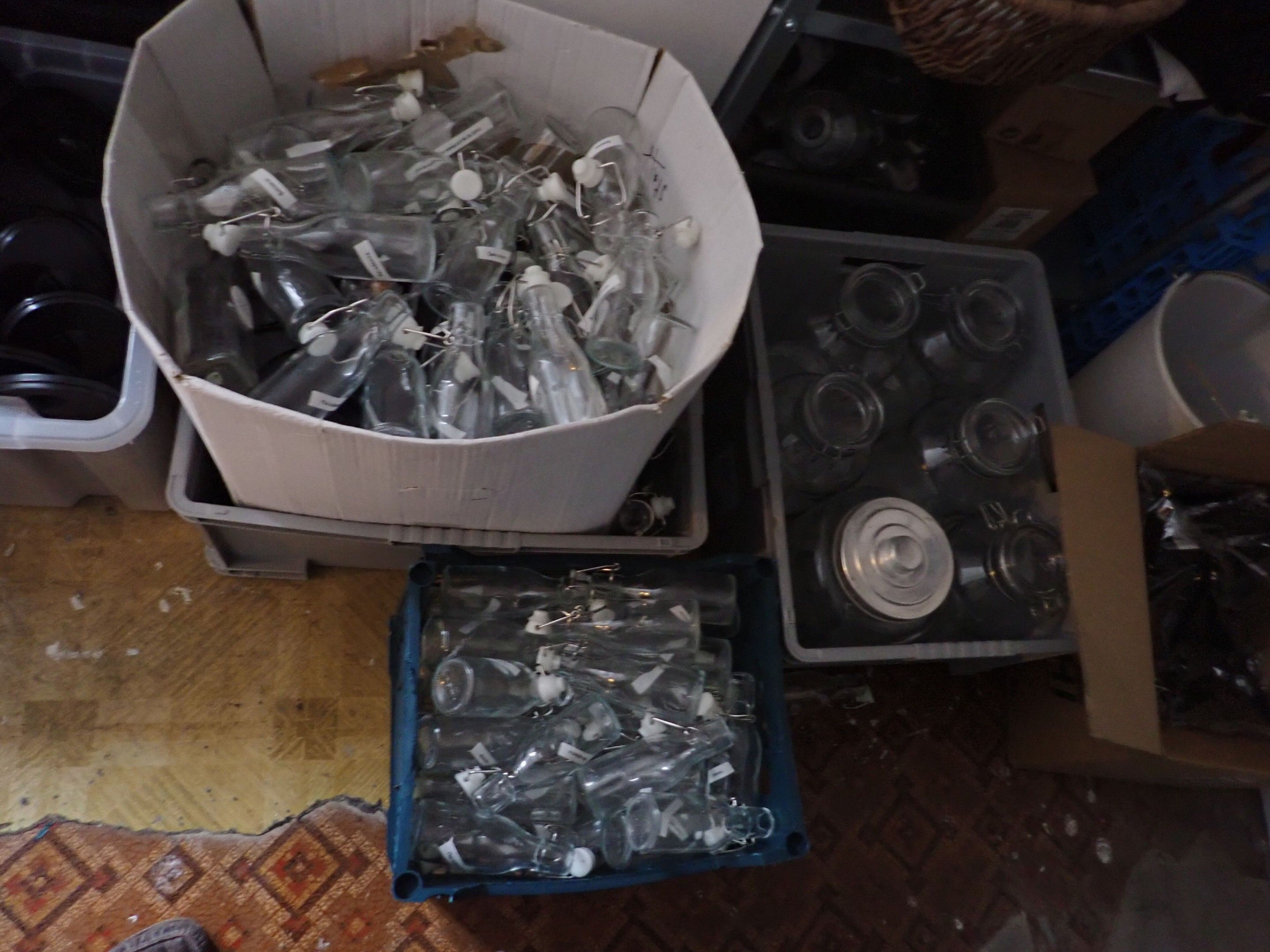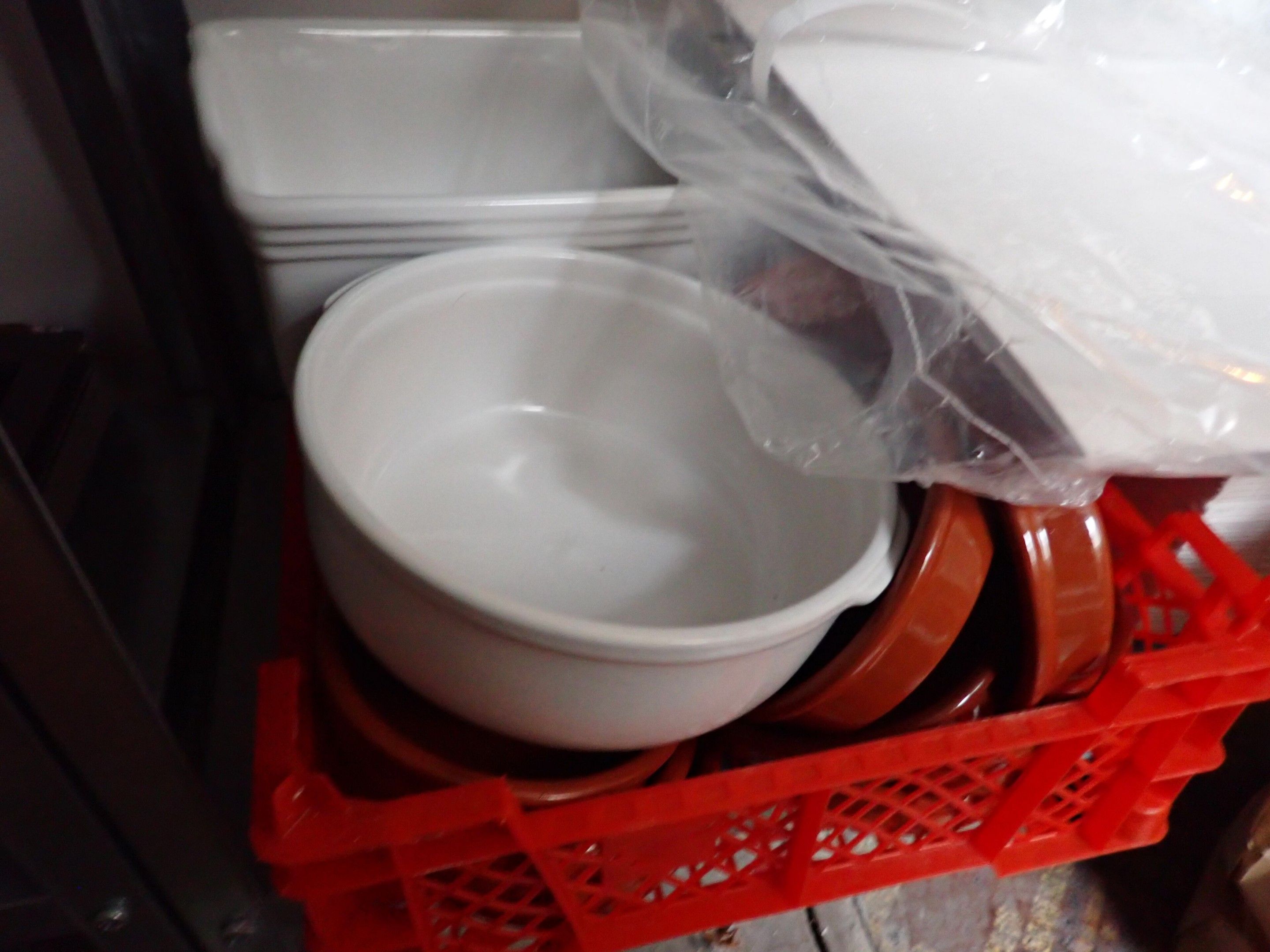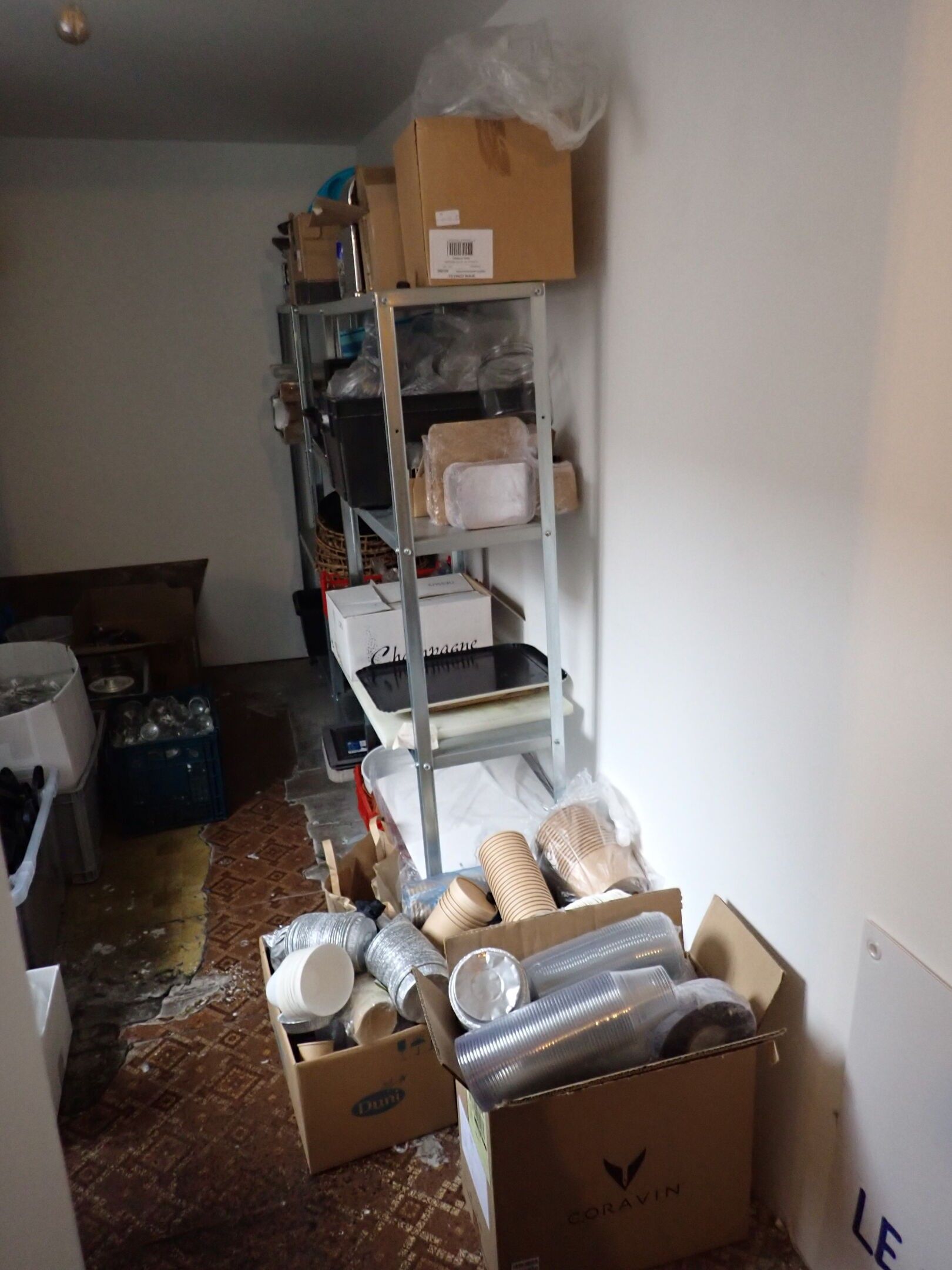 4 shelves 4 levels 70x29.5xh140 lined various emboitages, cassolettes sort pvc black, glass bottles with caps, 6 glass jars, circles, 3 cutting boards wood, water glasses DURALEX, salad bowls, tray polyester, baskets, grids, trays, 4 rattan trays, plates oysters pvc, kitchen utensils, ramekins, old stainless steel smoker HS, Judicial Lot, Price 40