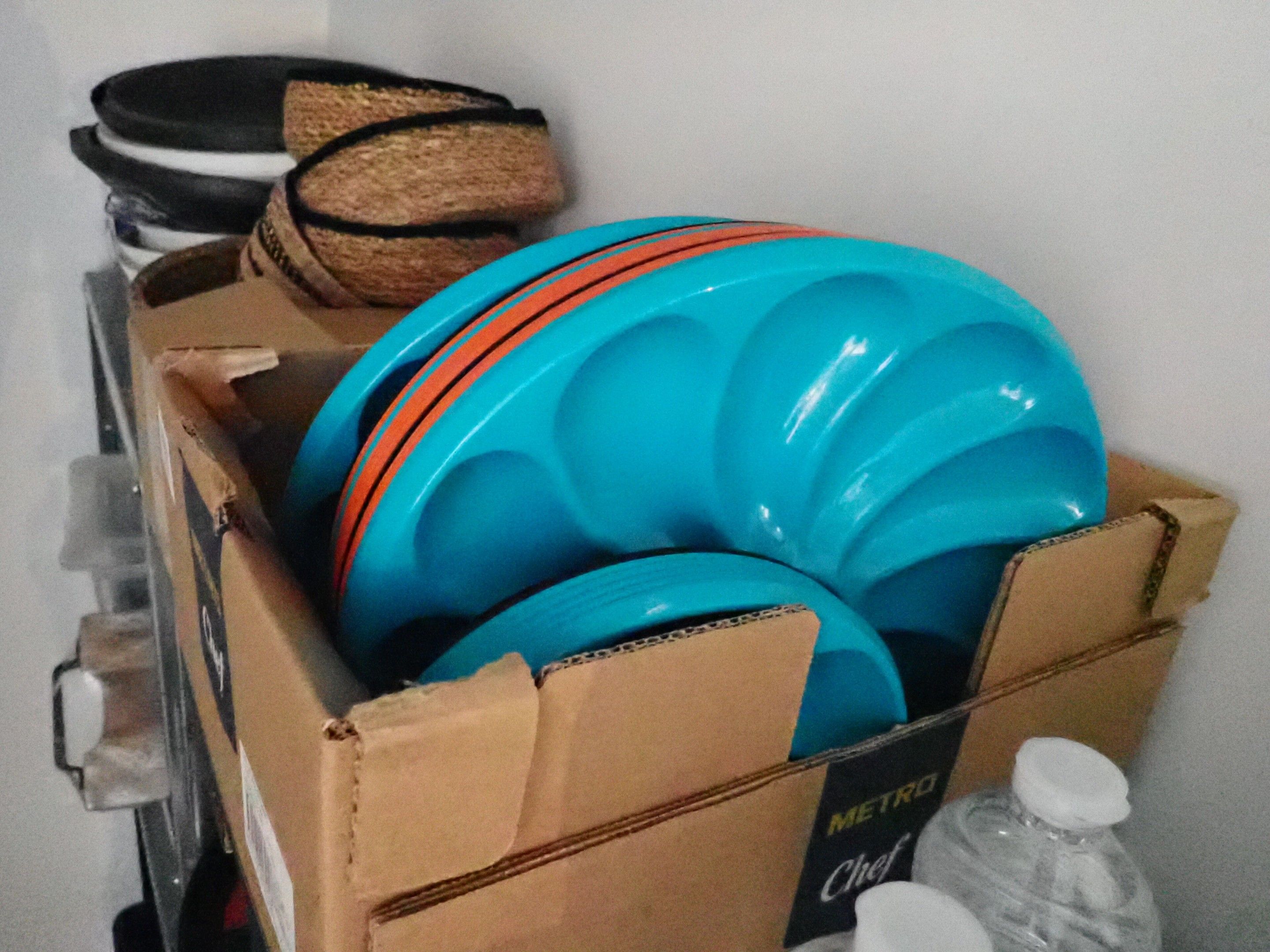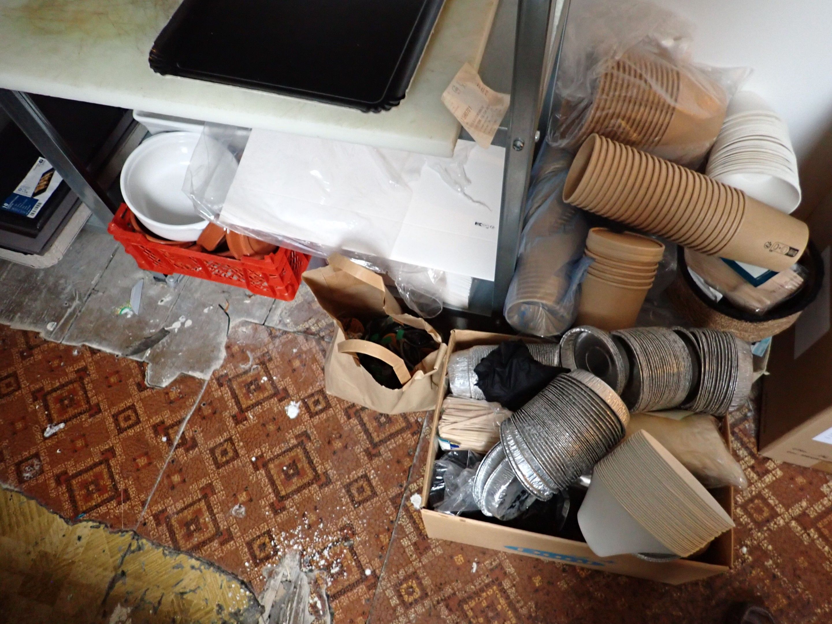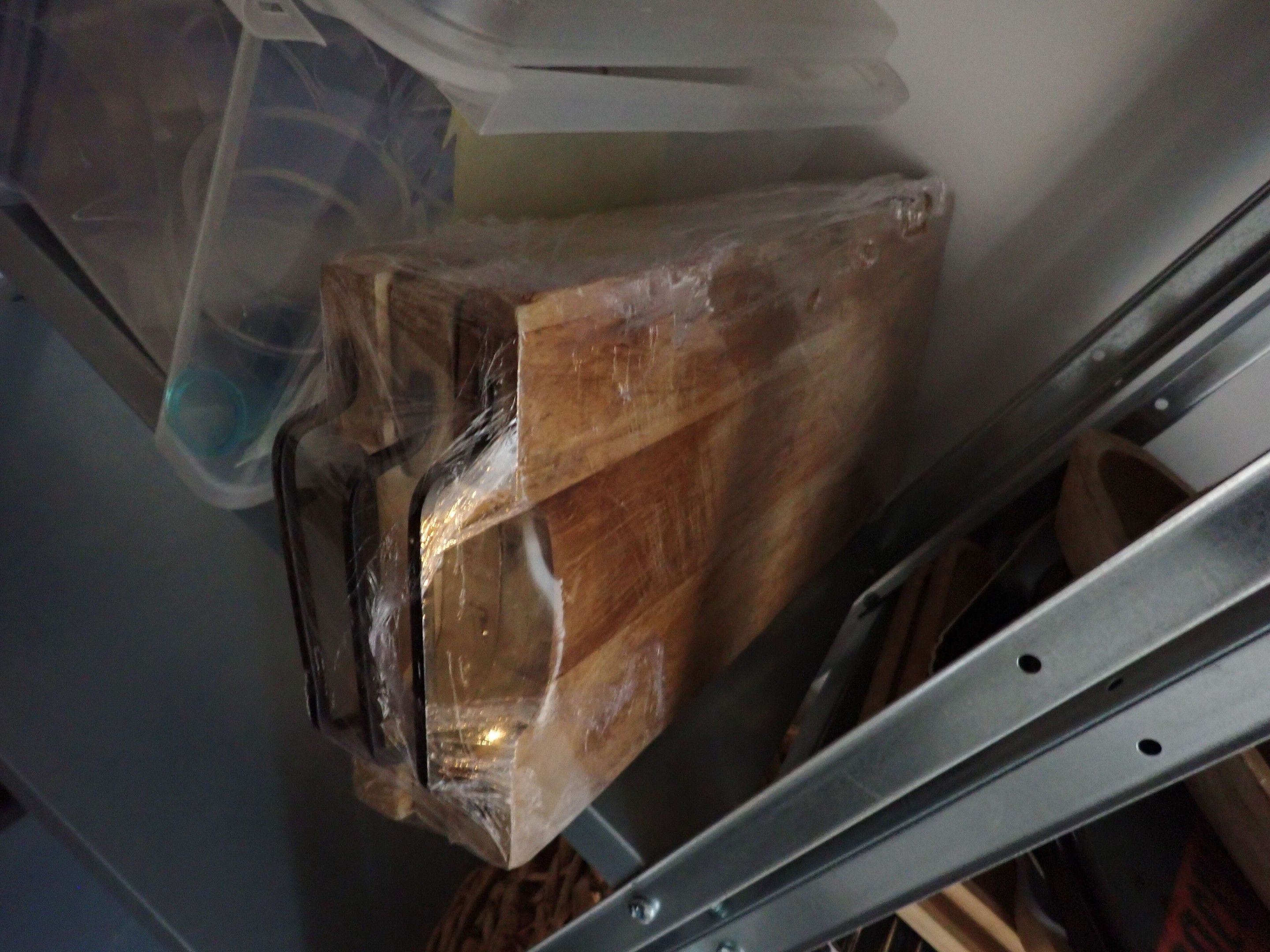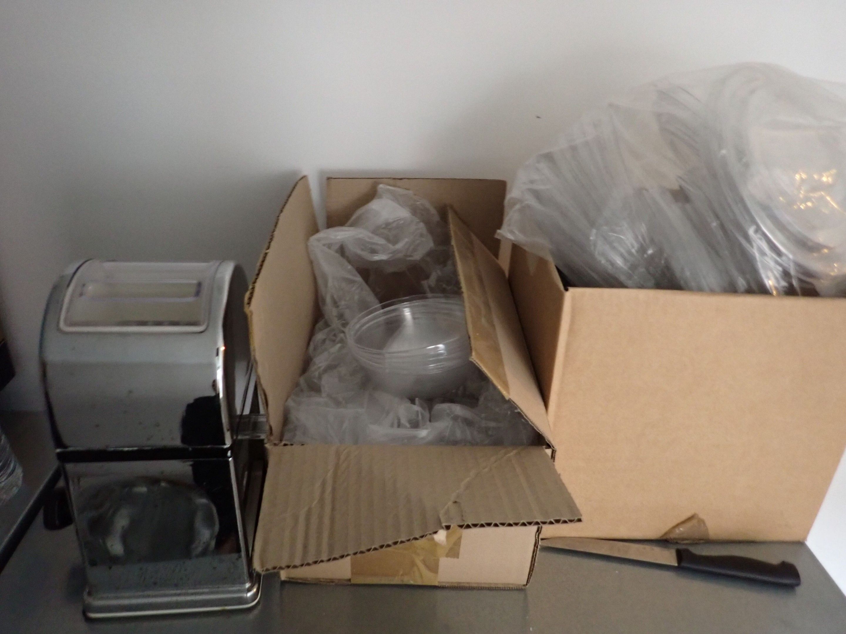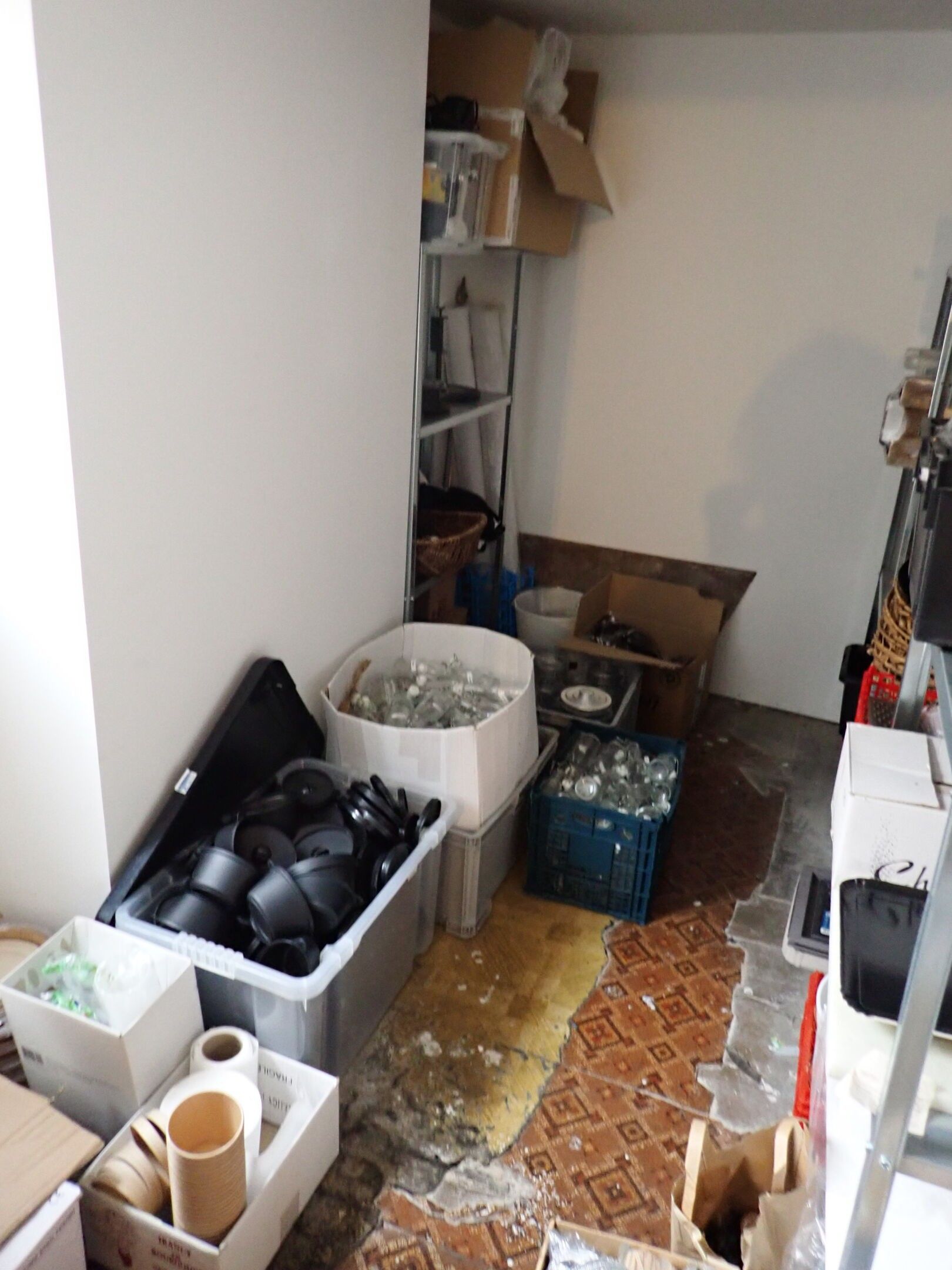 4 shelves 4 levels 70x29.5xh140 lined various emboitages, cassolettes sort pvc black, glass bottles with caps, 6 glass jars, circles, 3 cutting boards wood, water glasses DURALEX, salad bowls, tray polyester, baskets, grids, trays, 4 rattan trays, plates oysters pvc, kitchen utensils, ramekins, old stainless steel smoker HS, Judicial Lot, Price 40