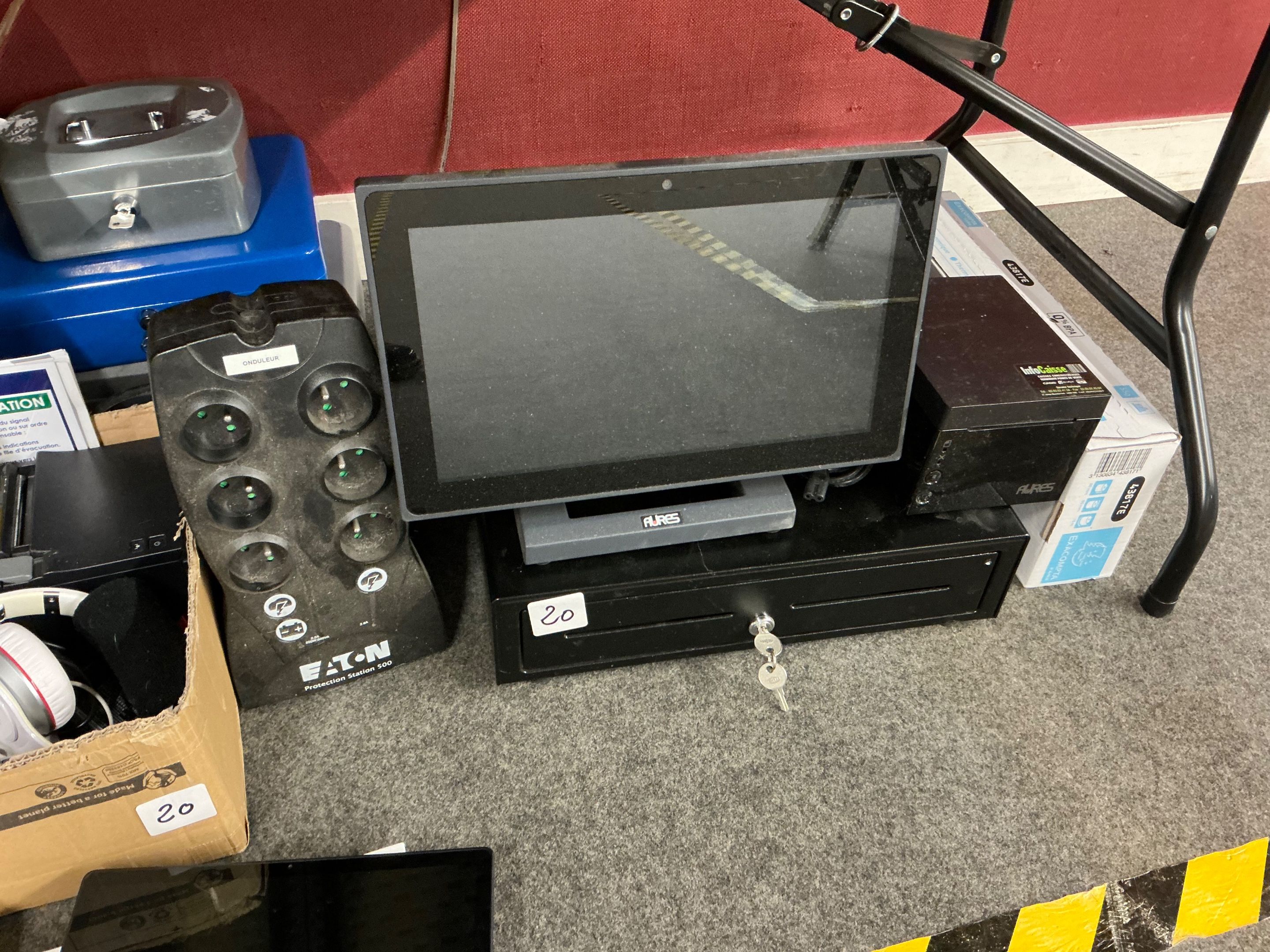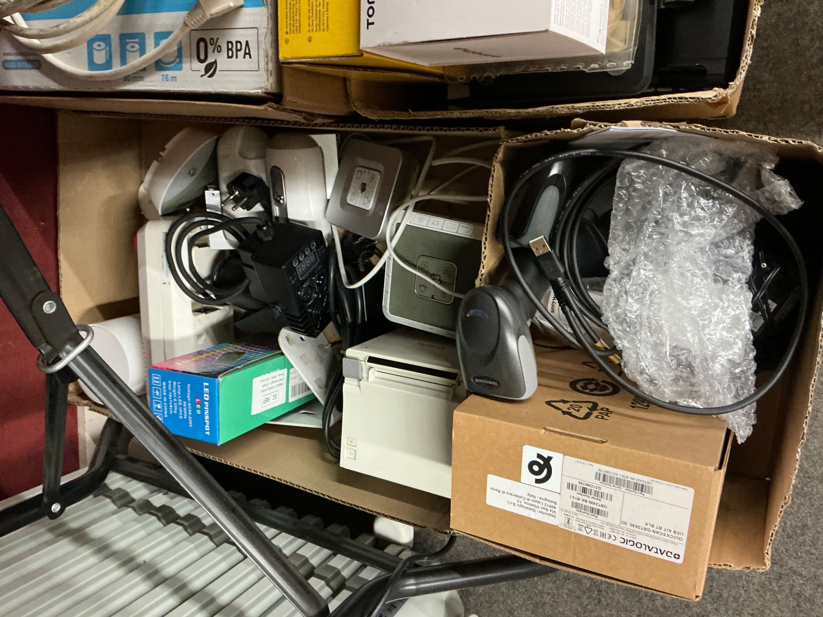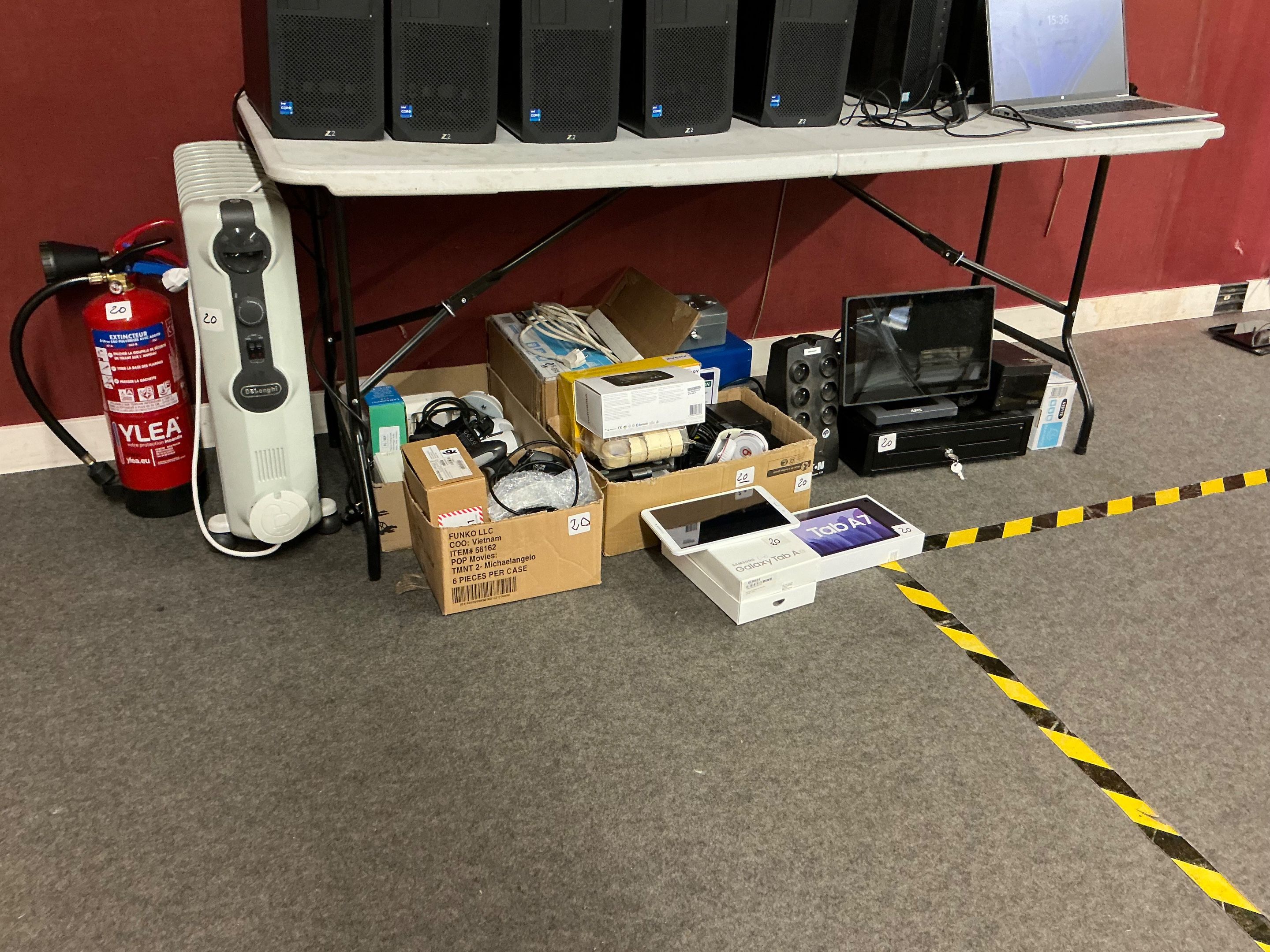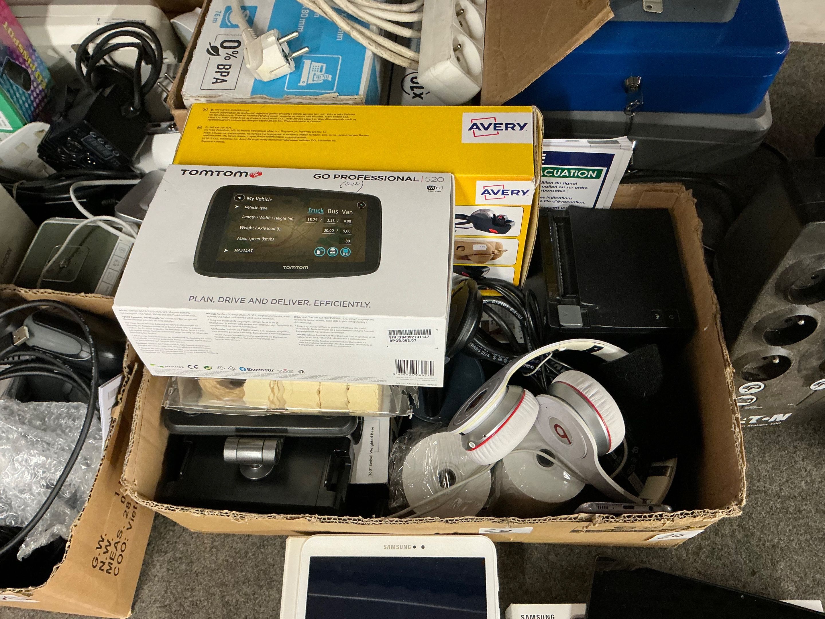 Lot including SAMSUNG tablets (x3), SAMSUNG mobile phone, AURES cash register system, ave printers, alarm equipment, helmet, GPS, DELONGHI electric radiator and miscellaneous.
