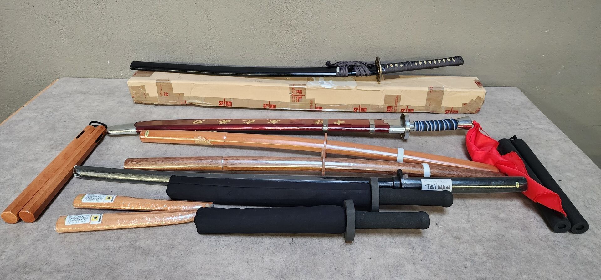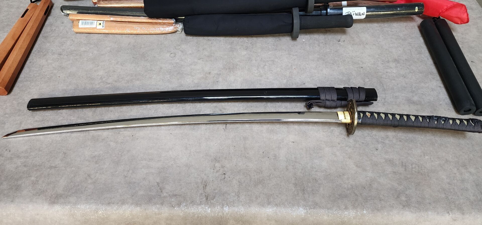enclosed: 1 black and gold katana, 1 fake tai-chi sword, 3 wooden training katanas, 2 wooden tanto, 2 nunchaku: 1 wooden, 1 foam