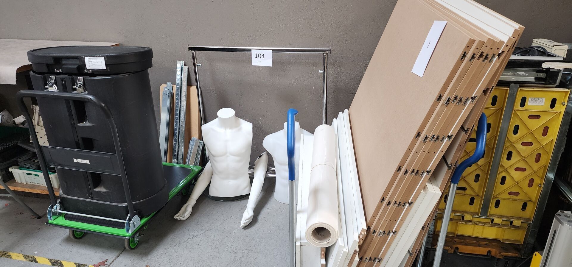 2 busts of male mannequins 1 umbrella stand in a black PVC m…