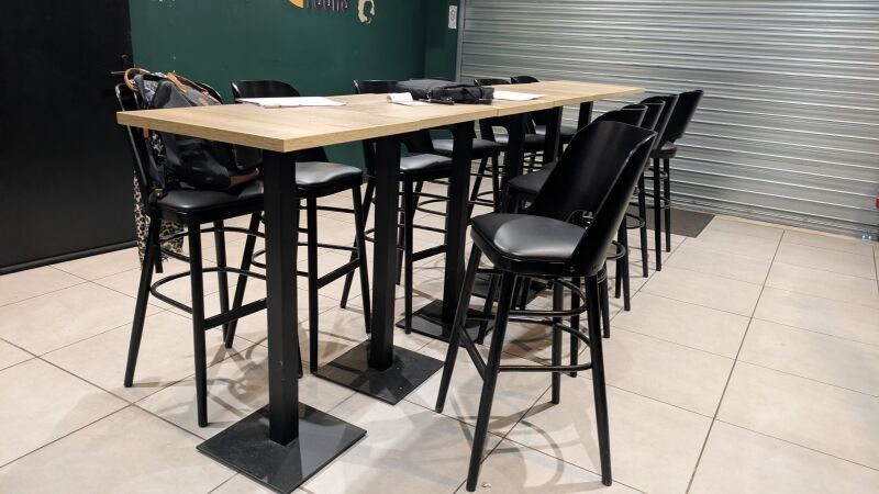 7 high tables in light wood imitation melamine and black lac…