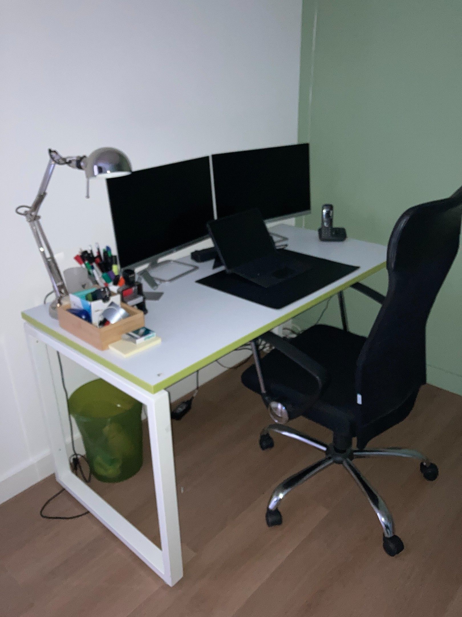SET OF OFFICE FURNITURE COMPRISING A DESK, AN ARMCHAIR, A COAT HANGER, TWO COMPUTER SCREENS AND A MICROSOFT SURFACE PC