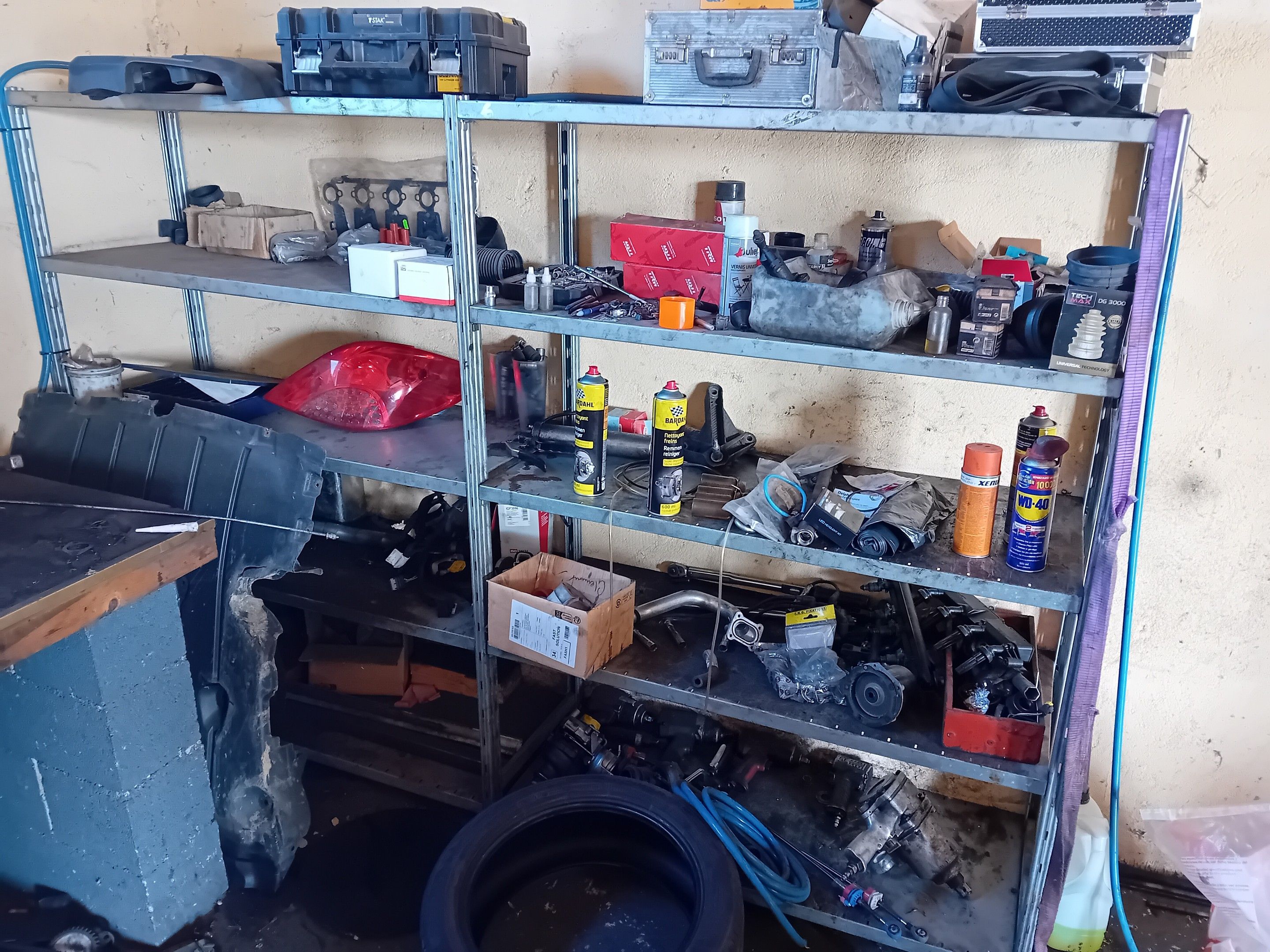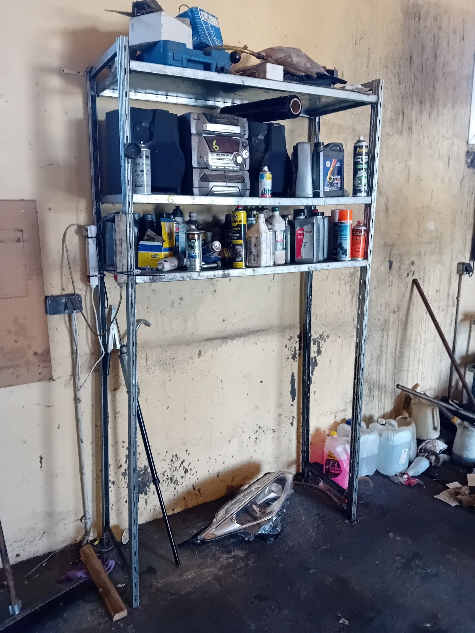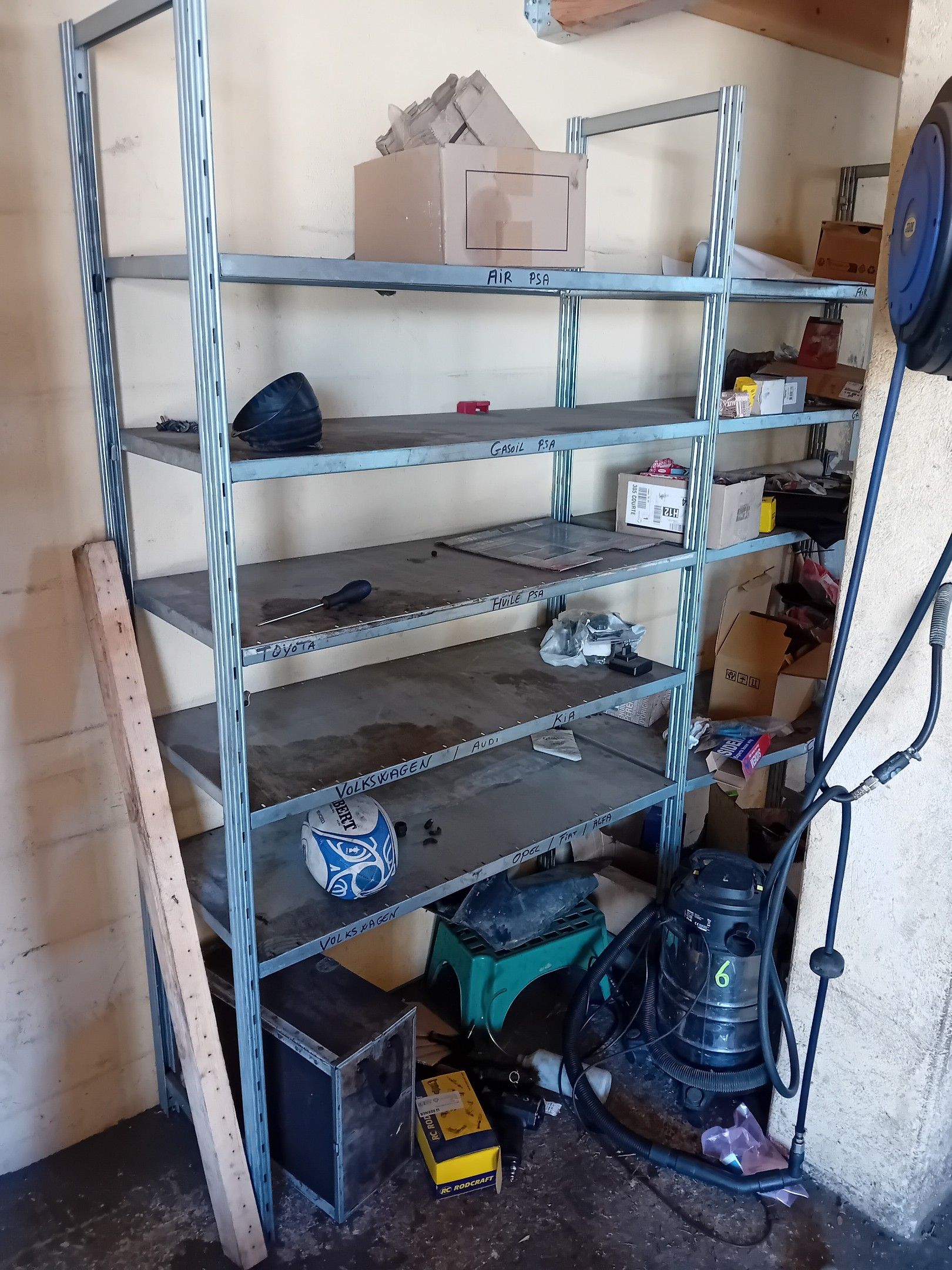2 shelves for hand tools, 1 credenza, 3 shelves. There is also a stock of products: oils, coolants, etc.