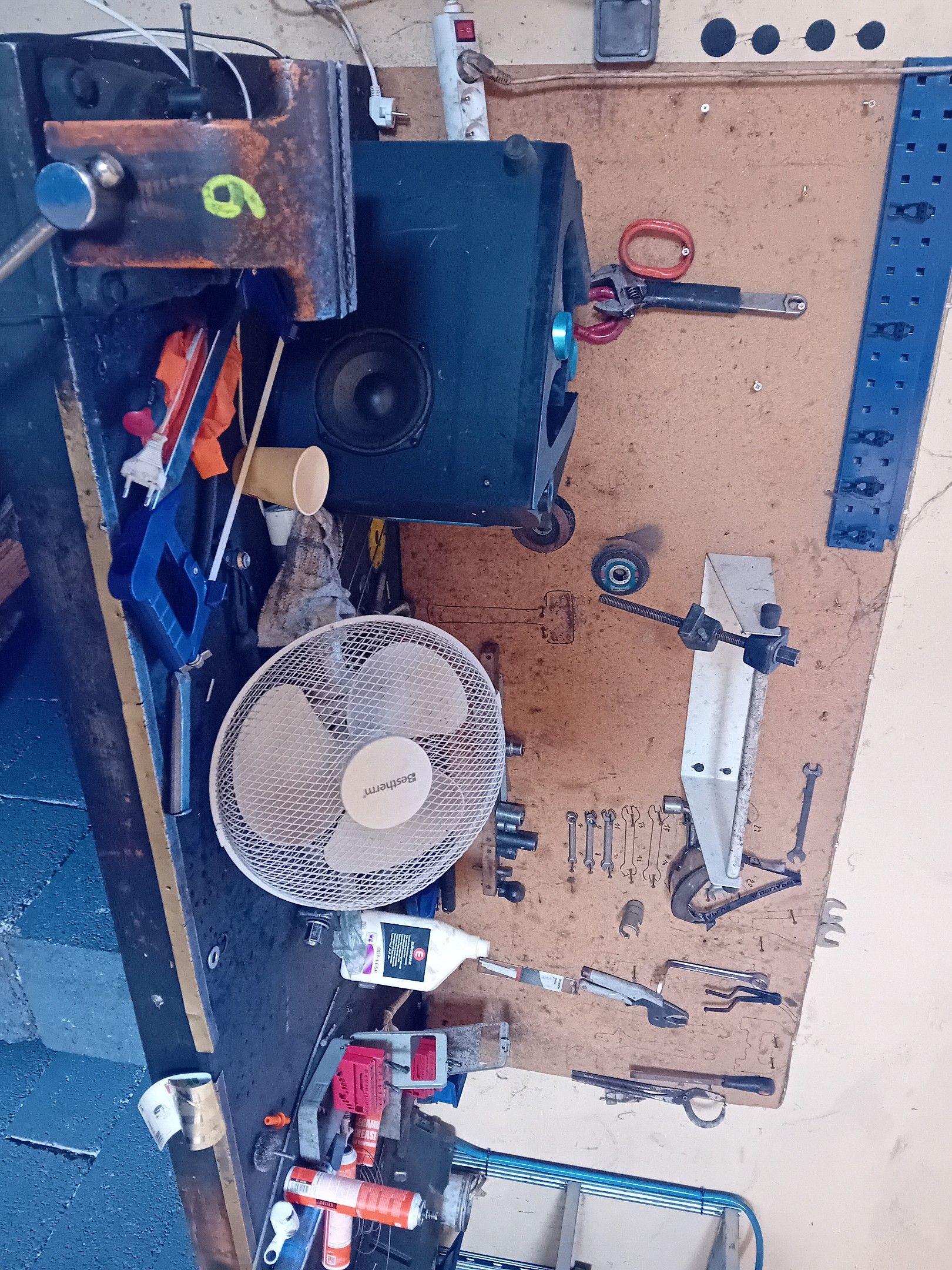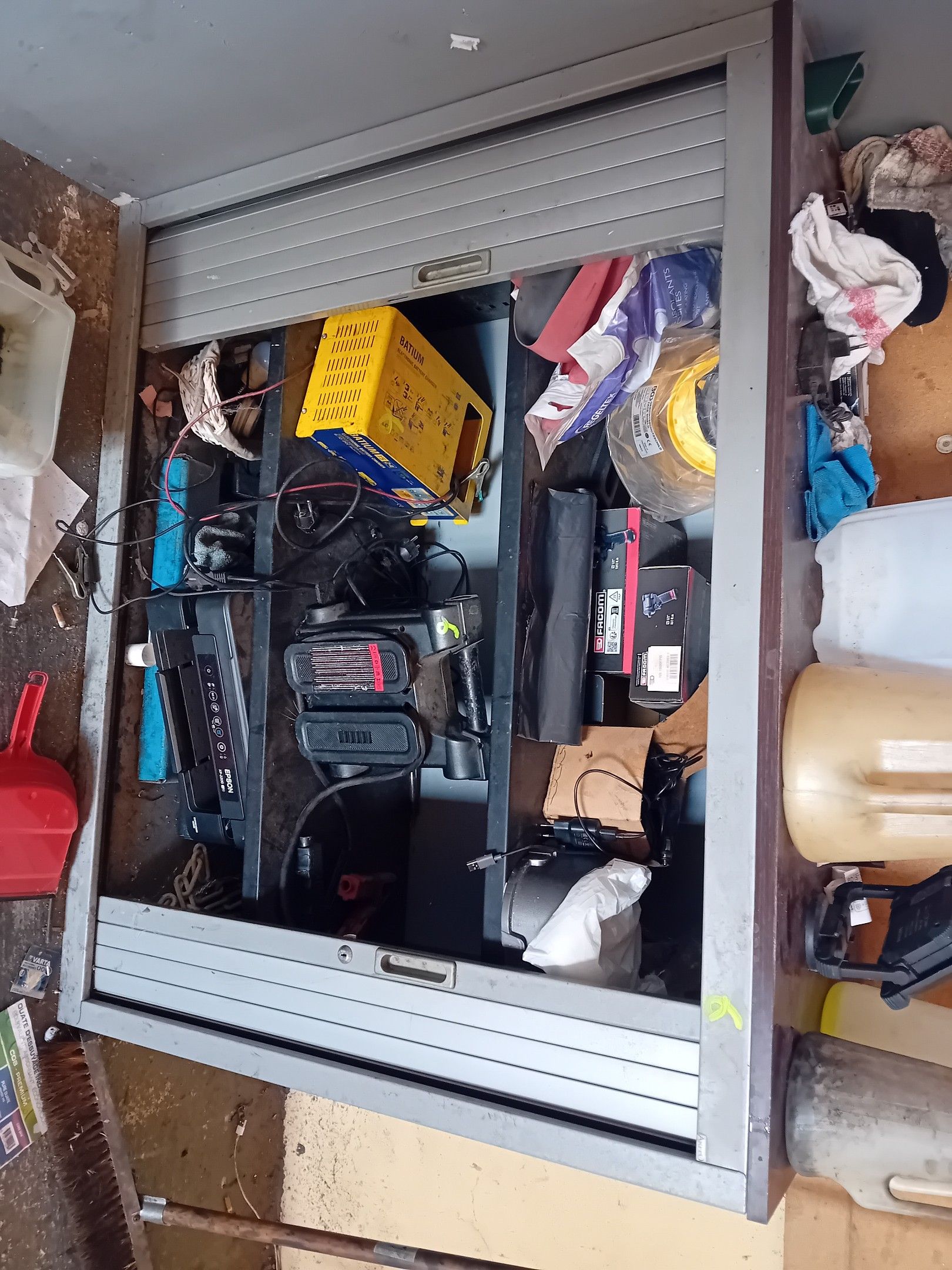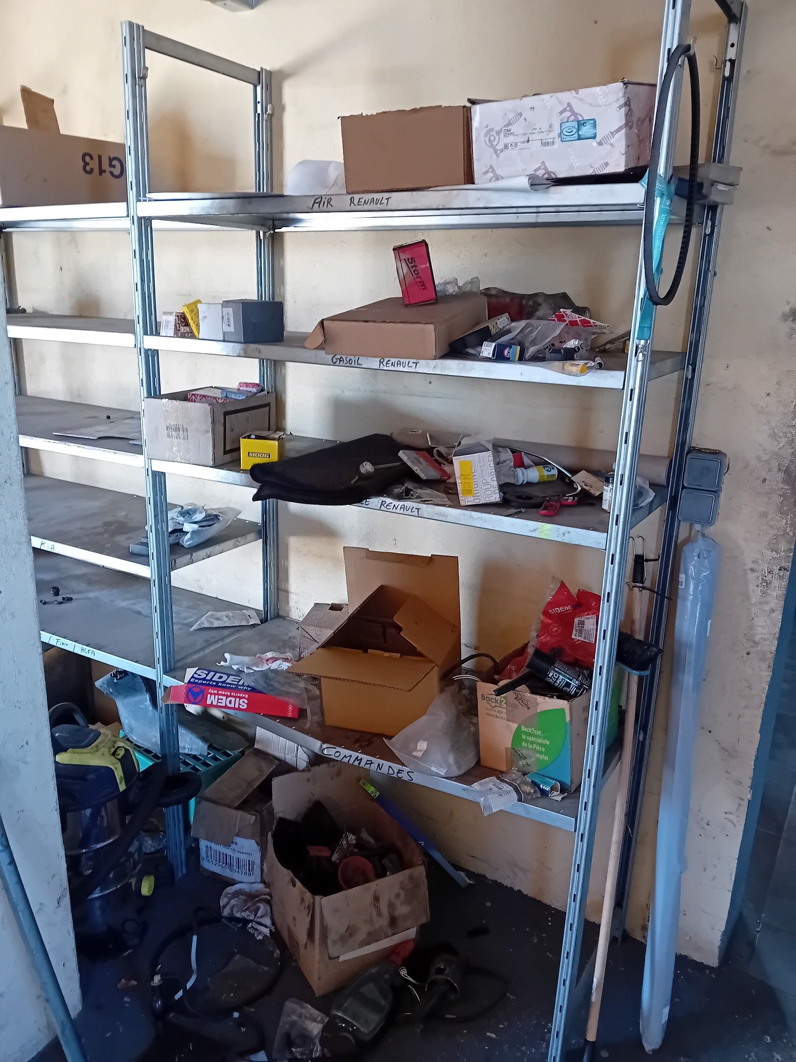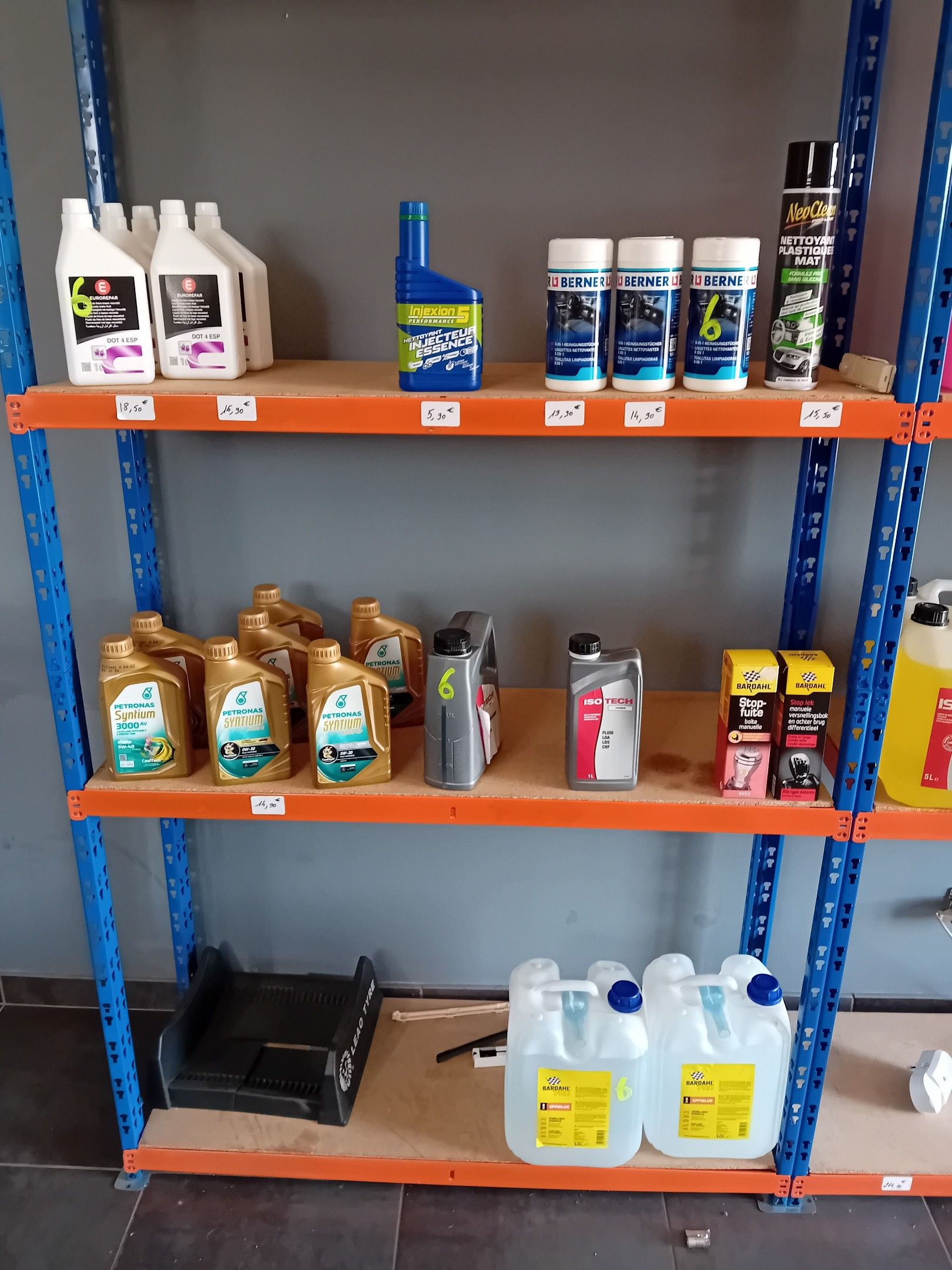 2 shelves for hand tools, 1 credenza, 3 shelves. There is also a stock of products: oils, coolants, etc.