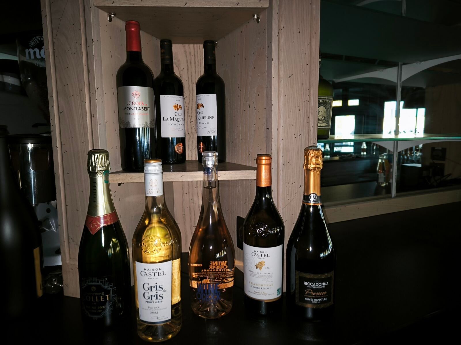 -Set consisting of 2 bottles Bordeaux, Cru La Maqueline 2021, 1 bottle Saint-Emilion grand cru La Croix de Mantlabert 2021, 1 bottle Chardonnay, Maison Castel 2023, 1 bottle Pinot gris, Maison Castel 2023, 1 bottle Prosecco, Riccadonnia cuvée signature, 1 bottle Wine Oclock rosé wine, 1 bottle Collet champagne