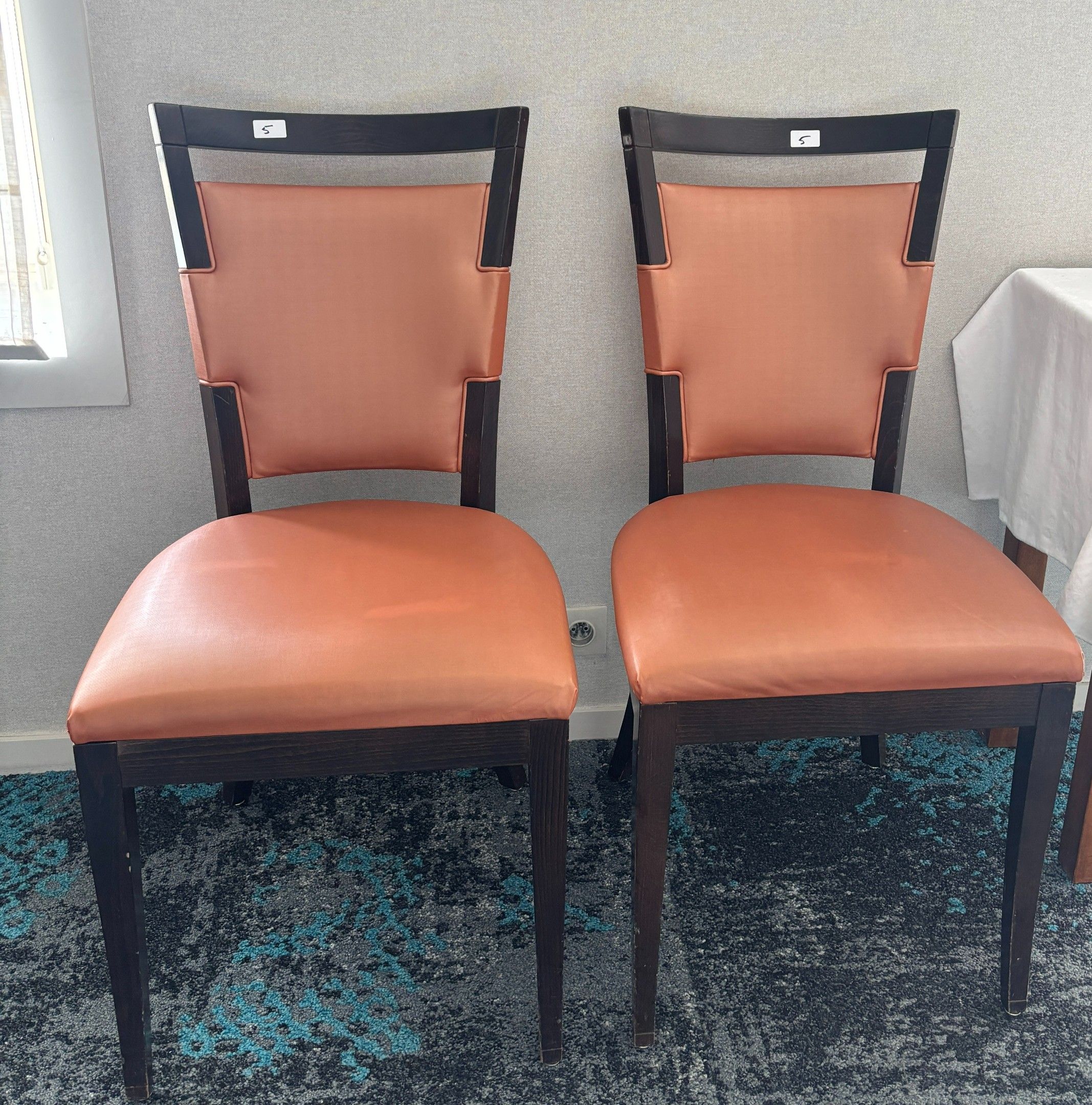 - two chairs, brown leather seat and back, wooden legs