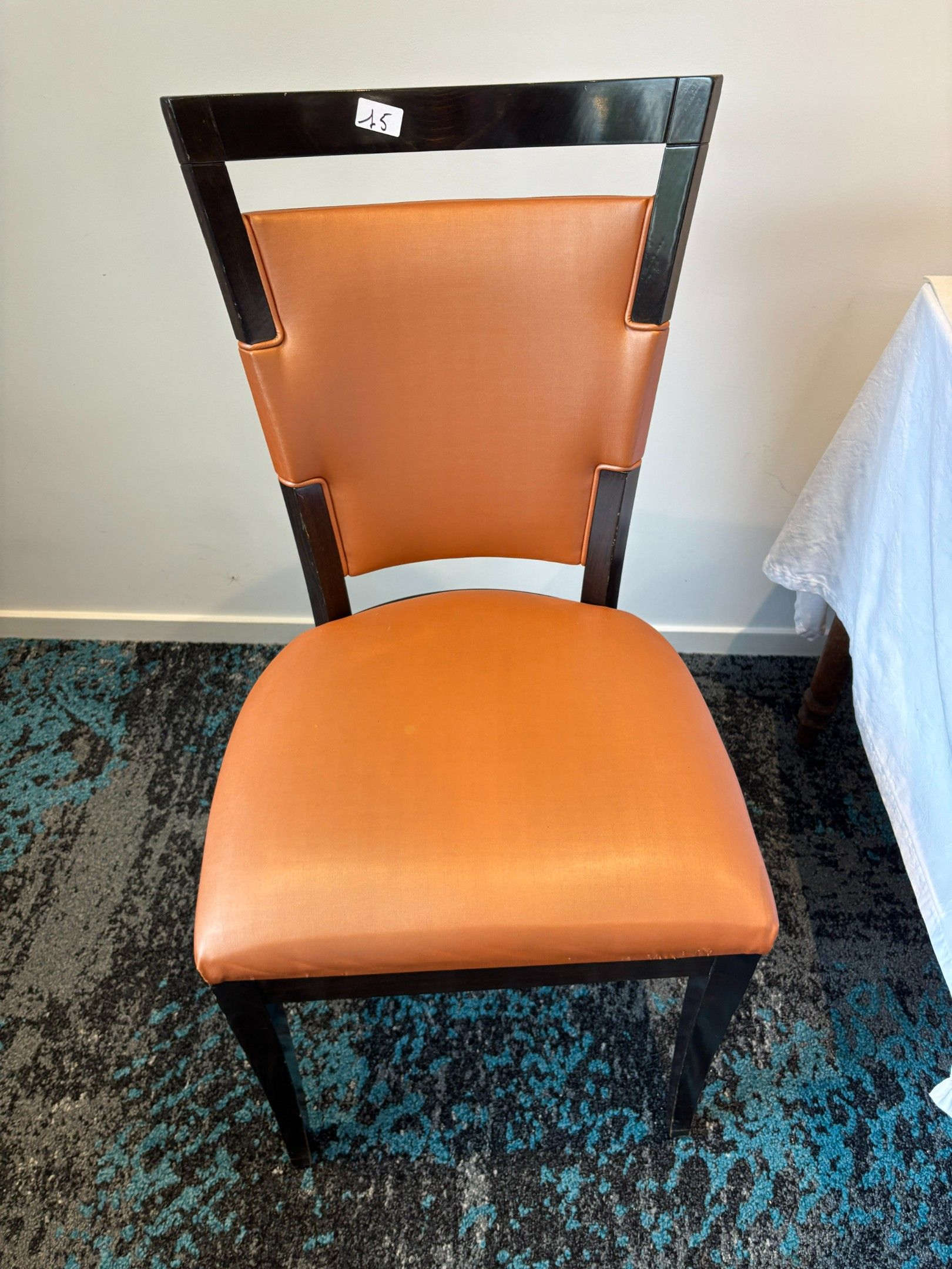 - two chairs, brown leather seat and back, wooden legs