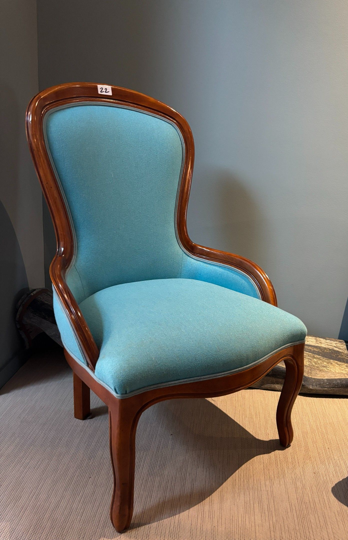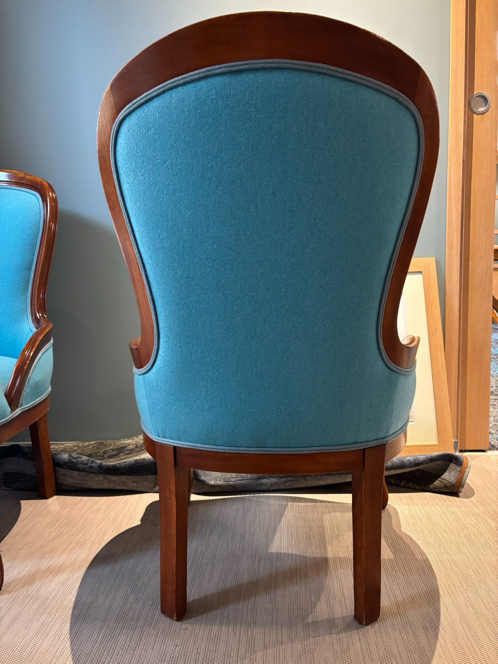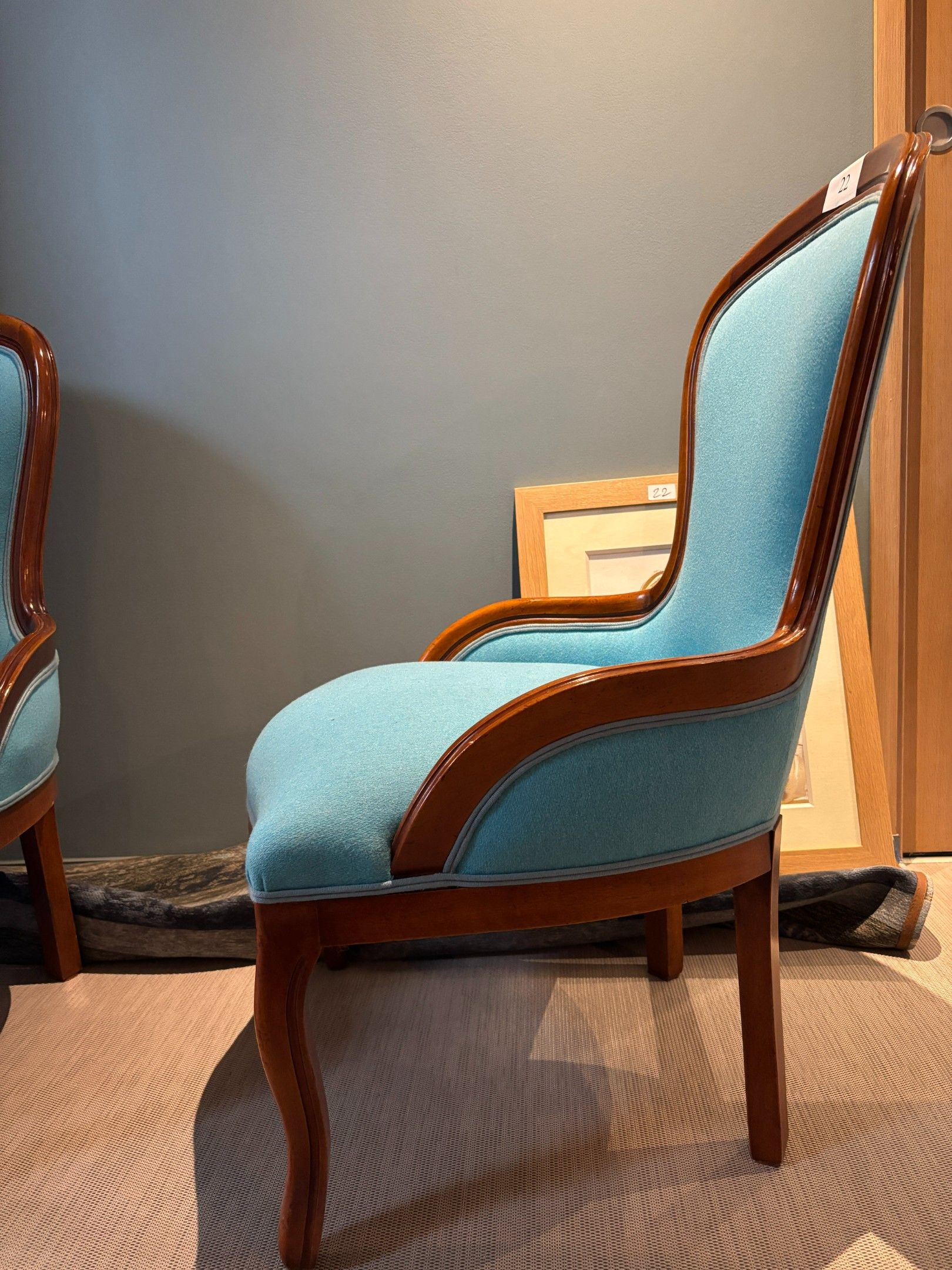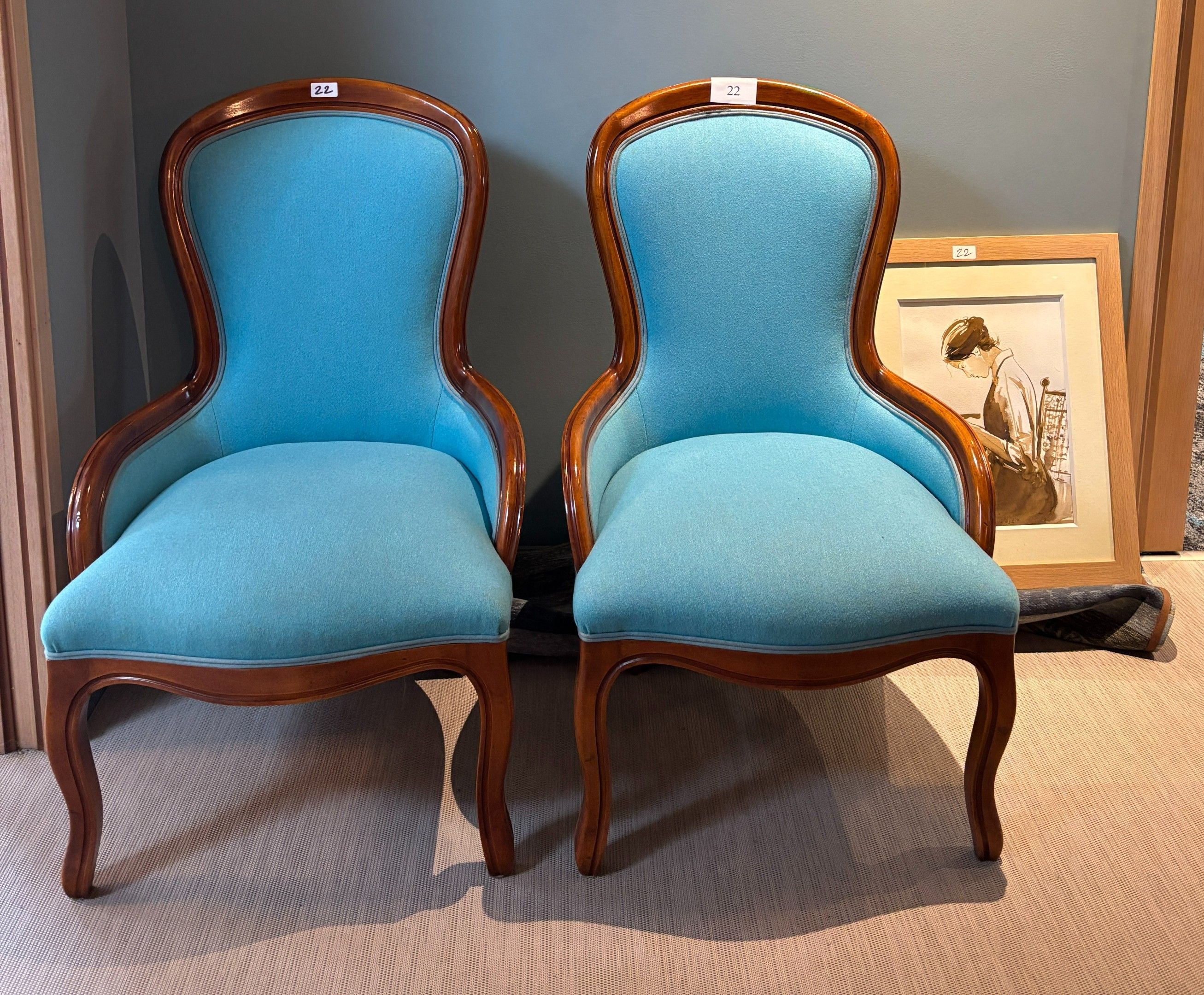 - two blue fabric armchairs, wooden legs