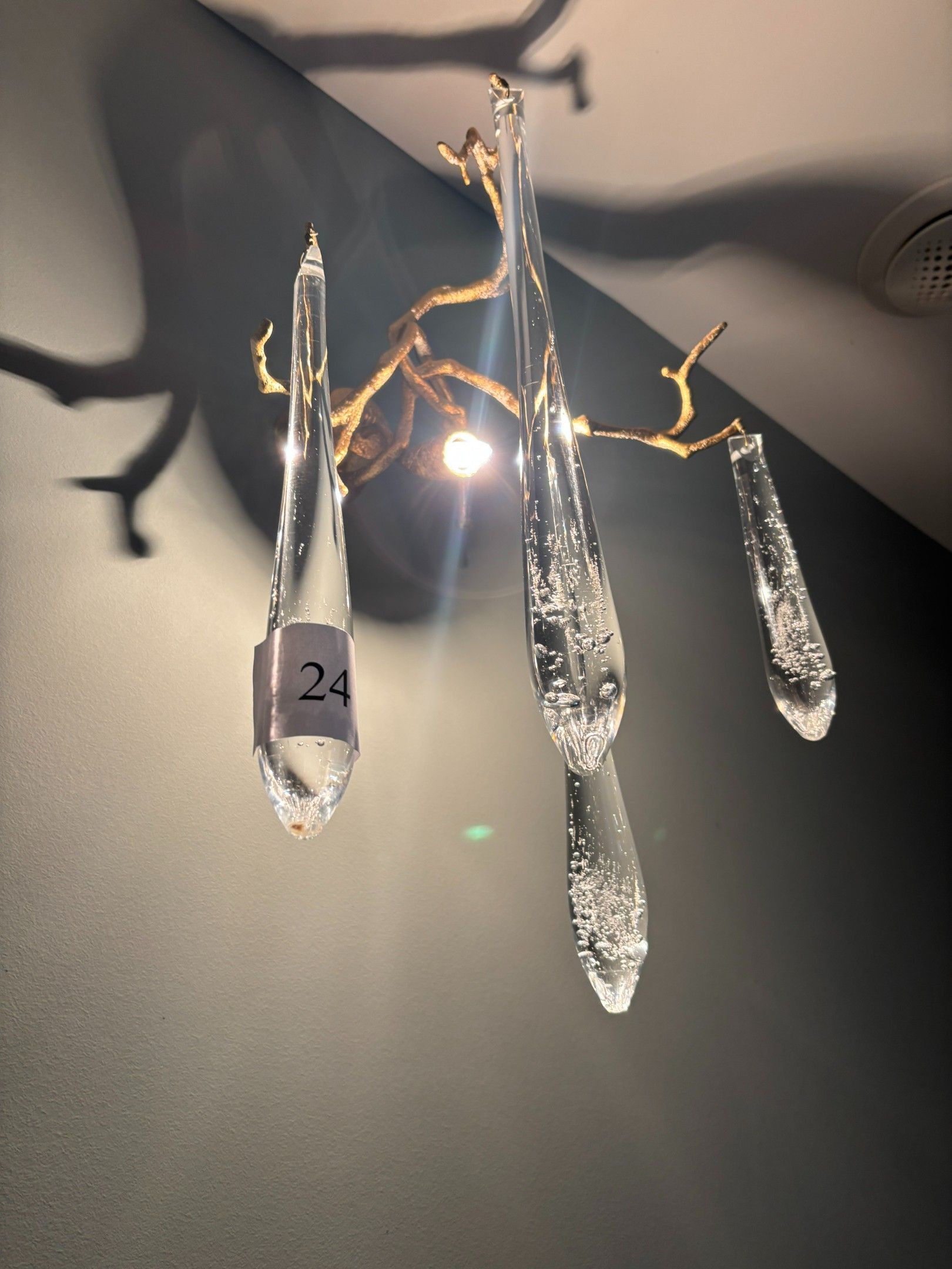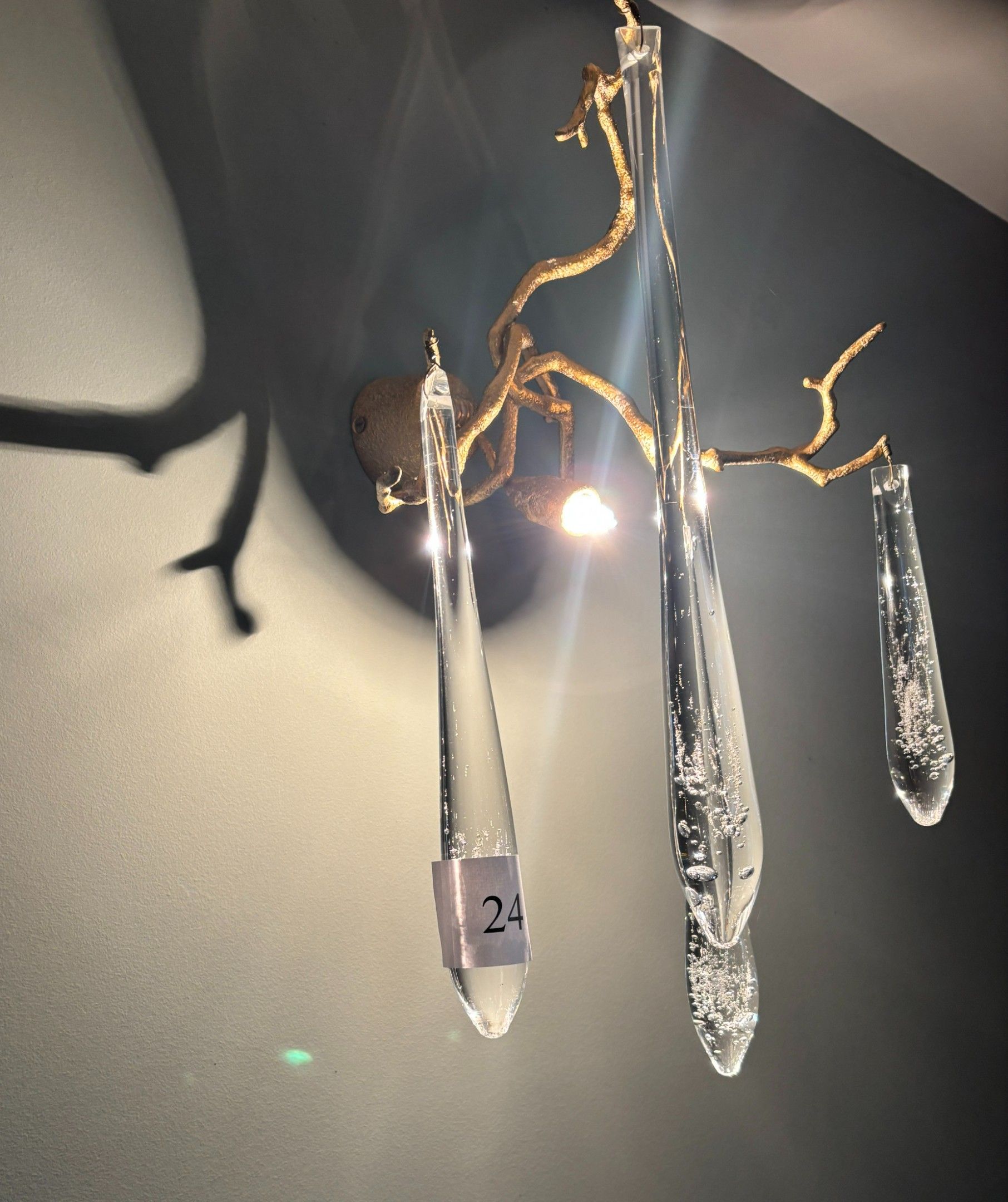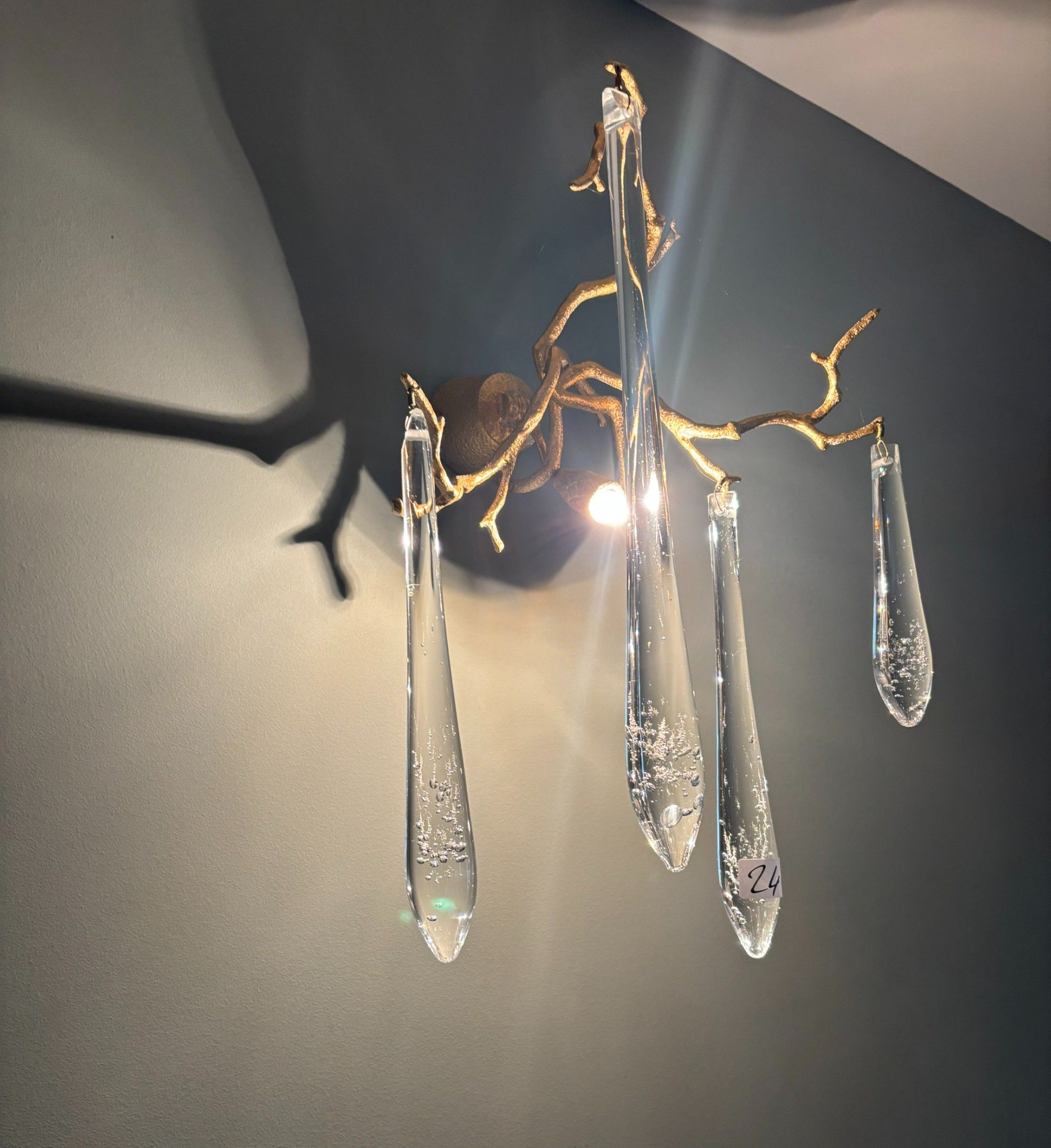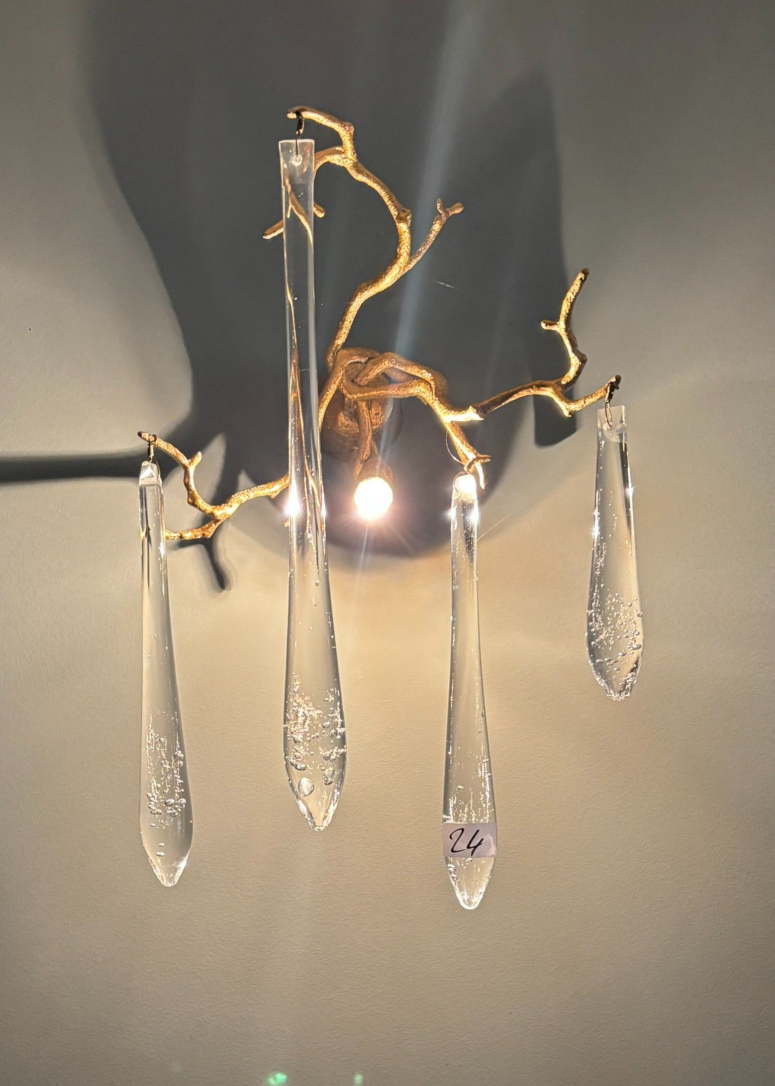 Two wall sconces with MARIO J-PIRES pendants, frame in gilded bronze imitating the branches of a tree, embellished with large drops of bubble glass.