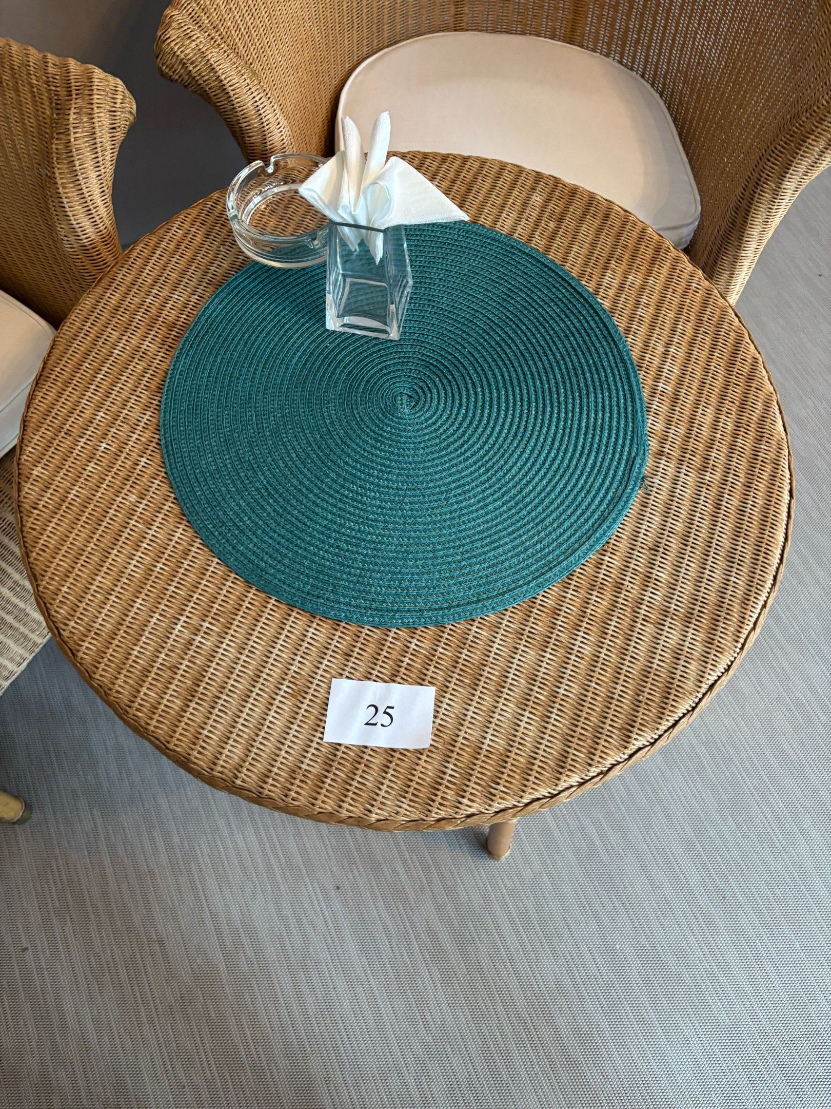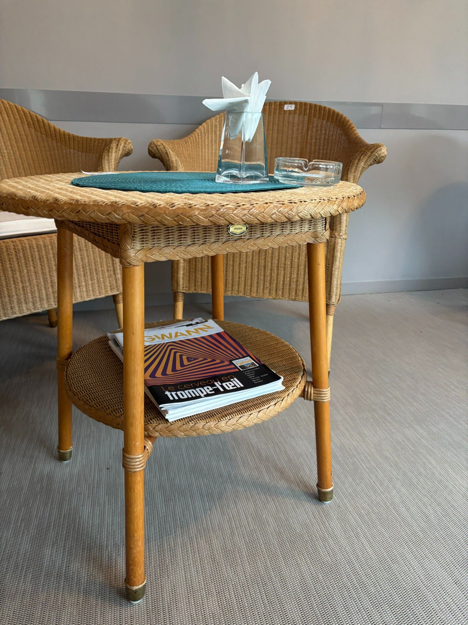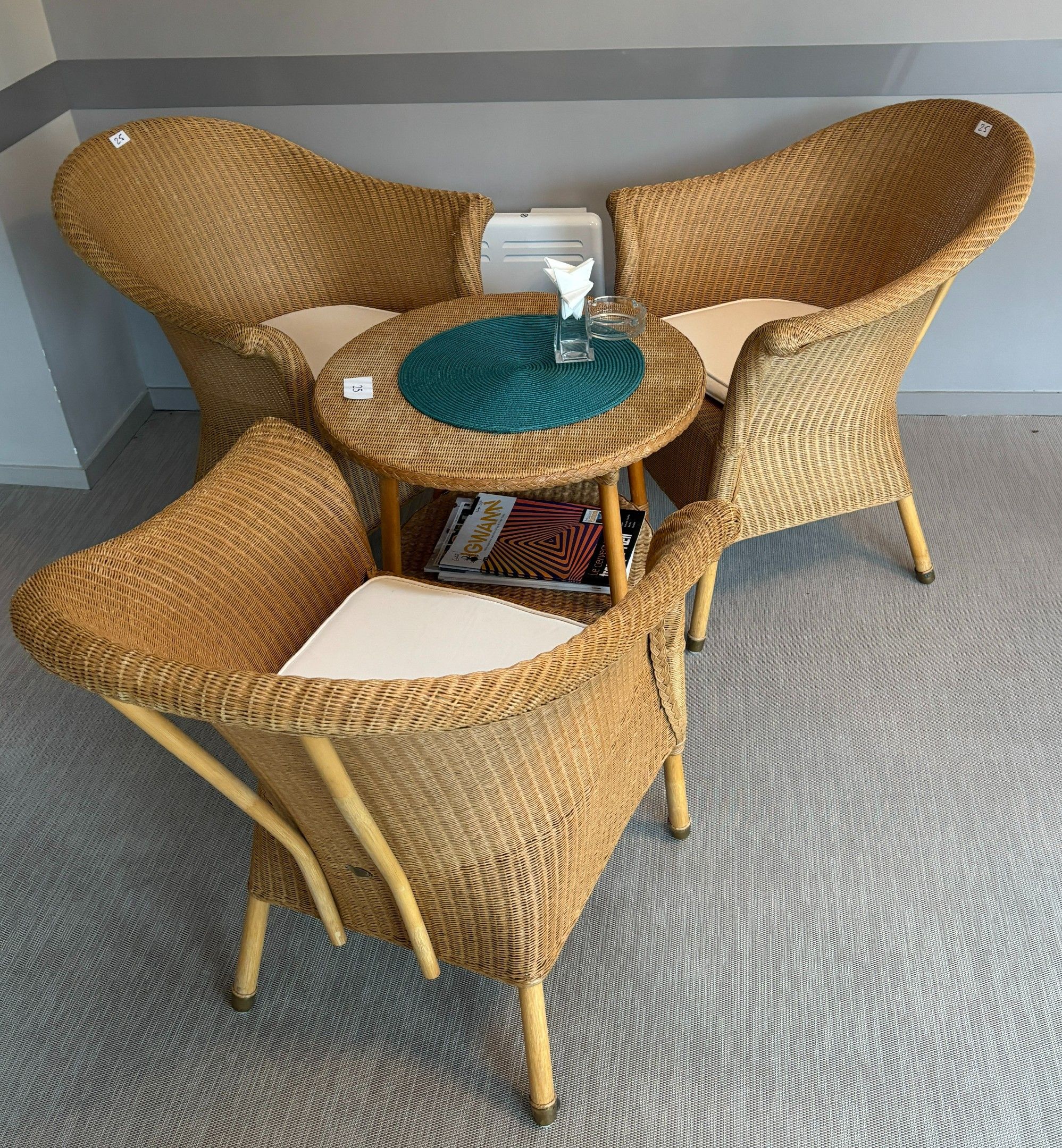 Small Lloyd Loom lounge comprising: three woven wood armchairs; small round woven wood coffee table and miscellaneous.