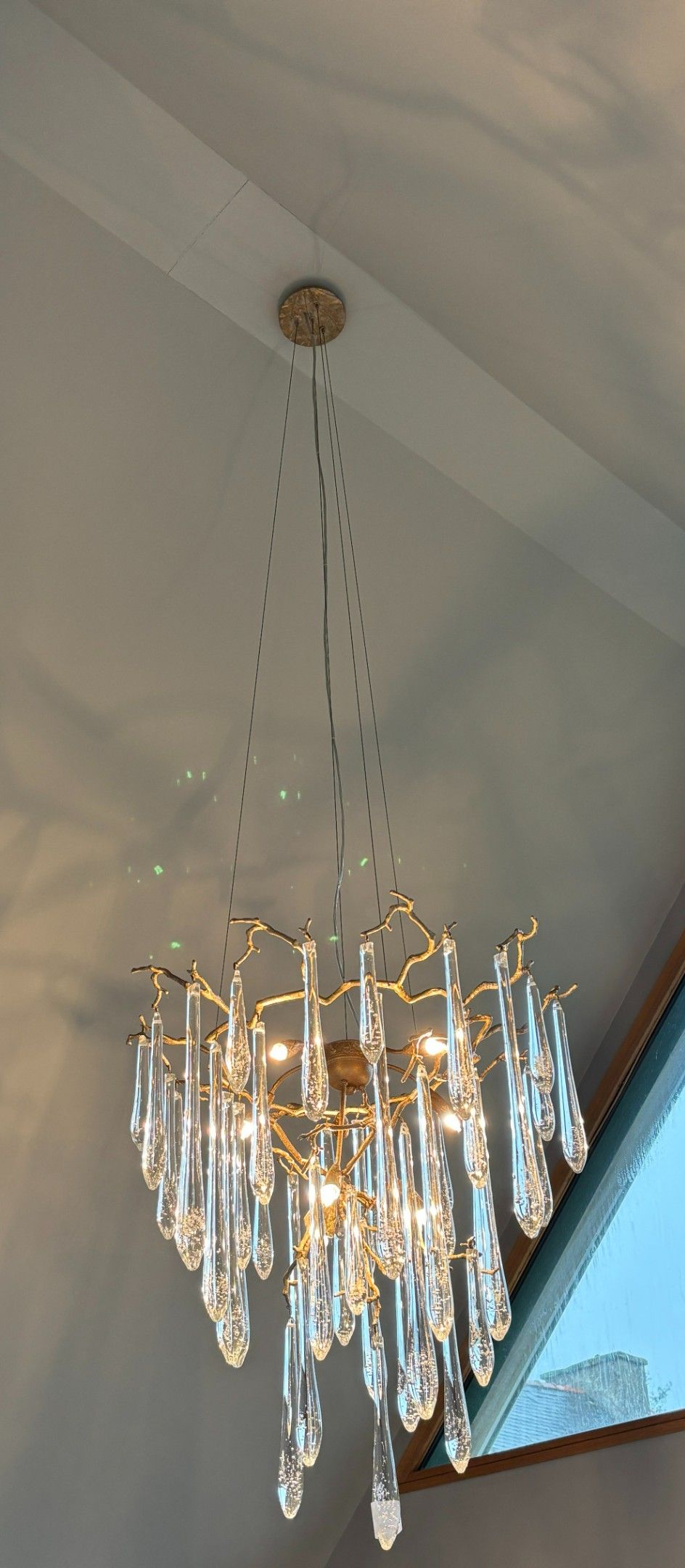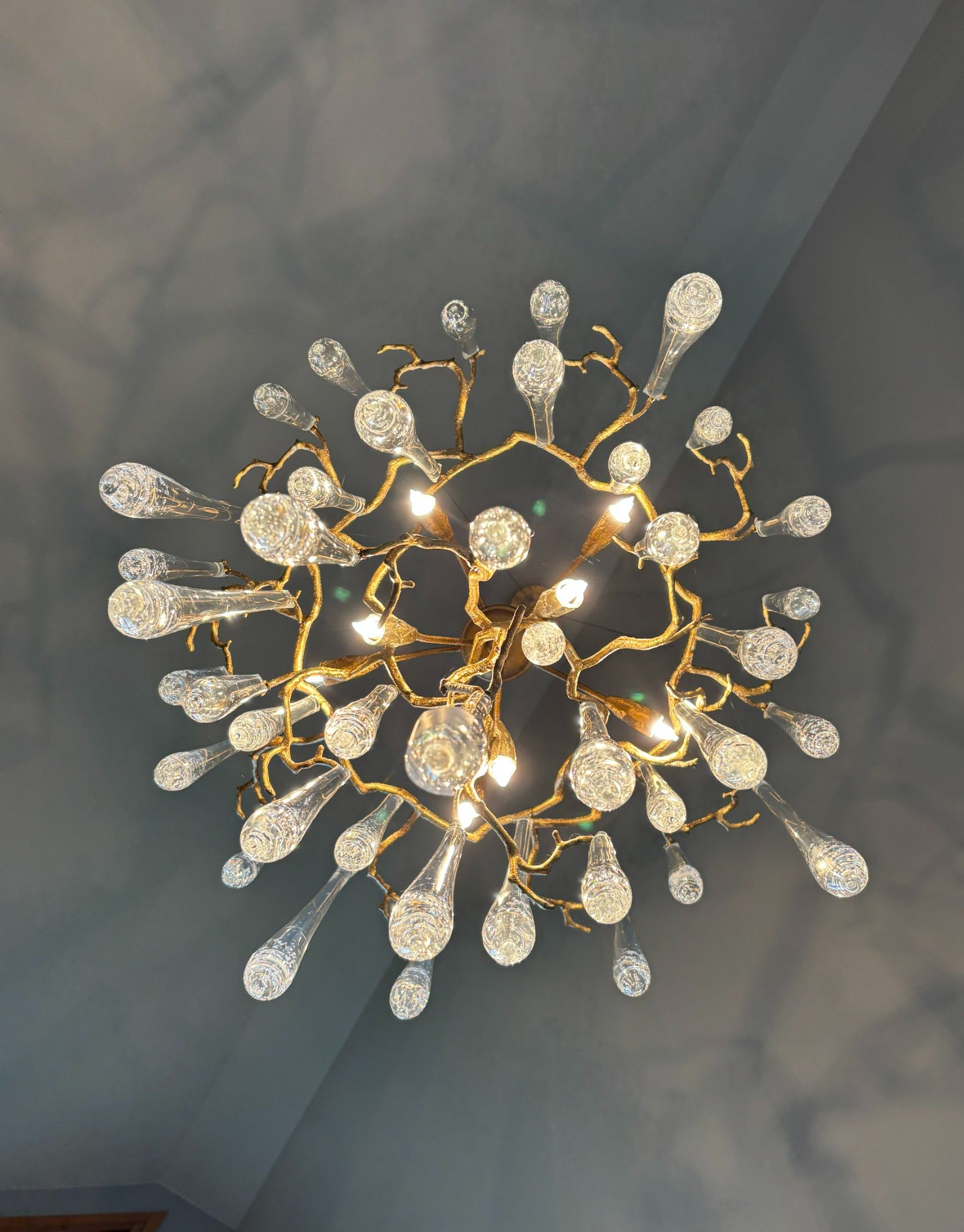 MARIO J-PIRES tassel chandelier, gilded bronze frame imitating the branches of a tree, embellished with large bubble glass drops.