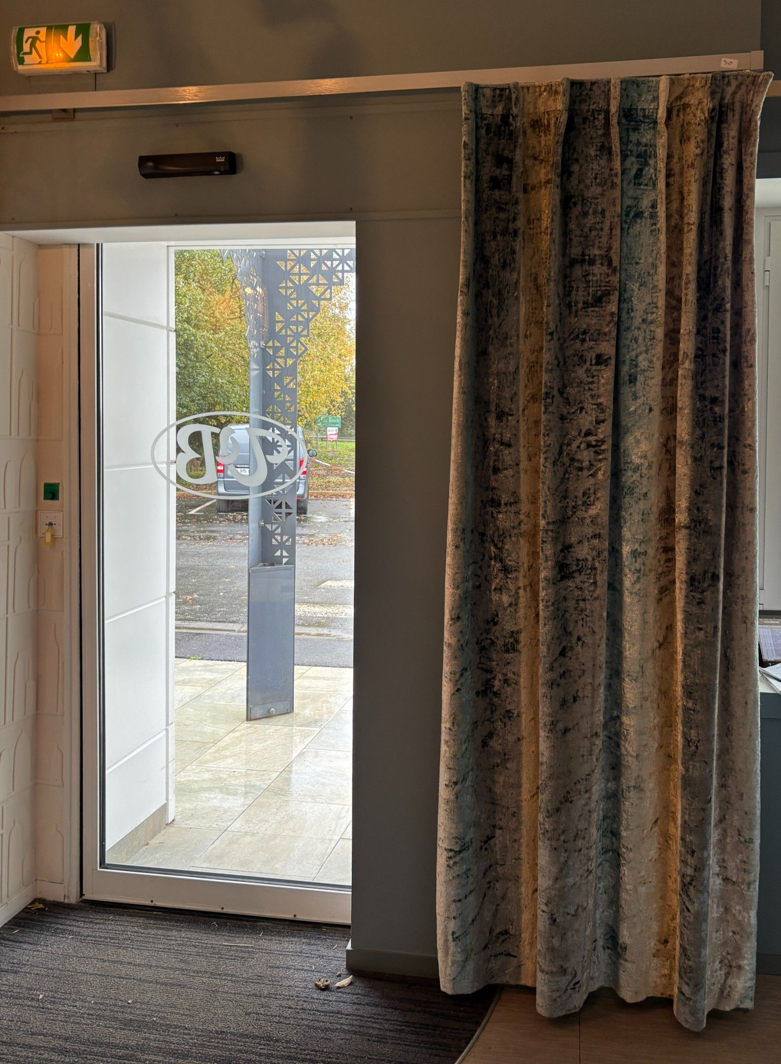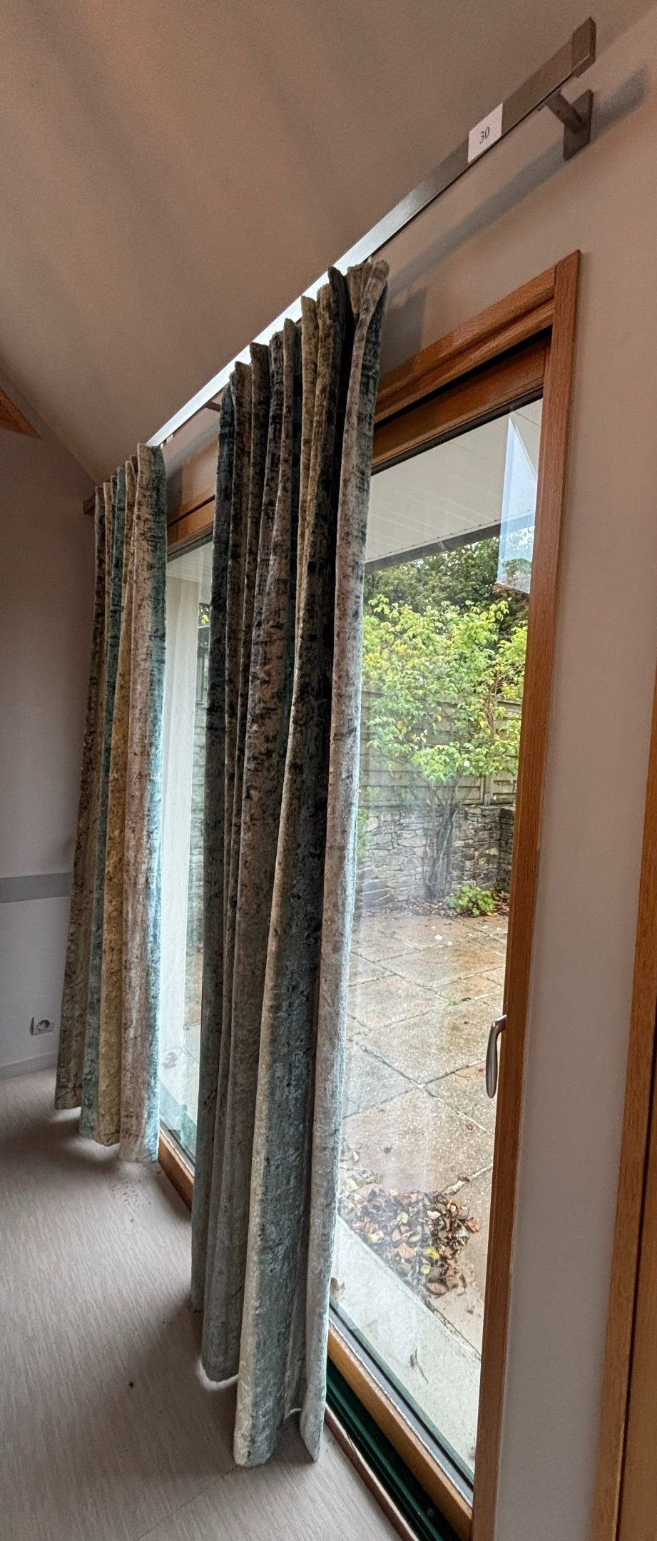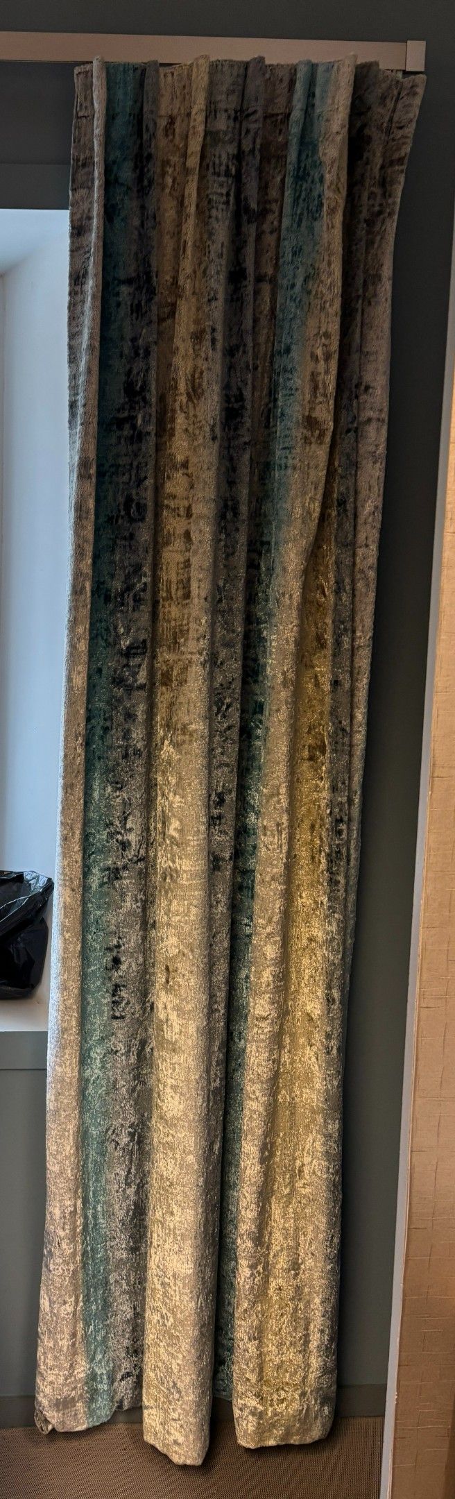Lot comprising: two pairs of green, yellow and silver-blue curtains.