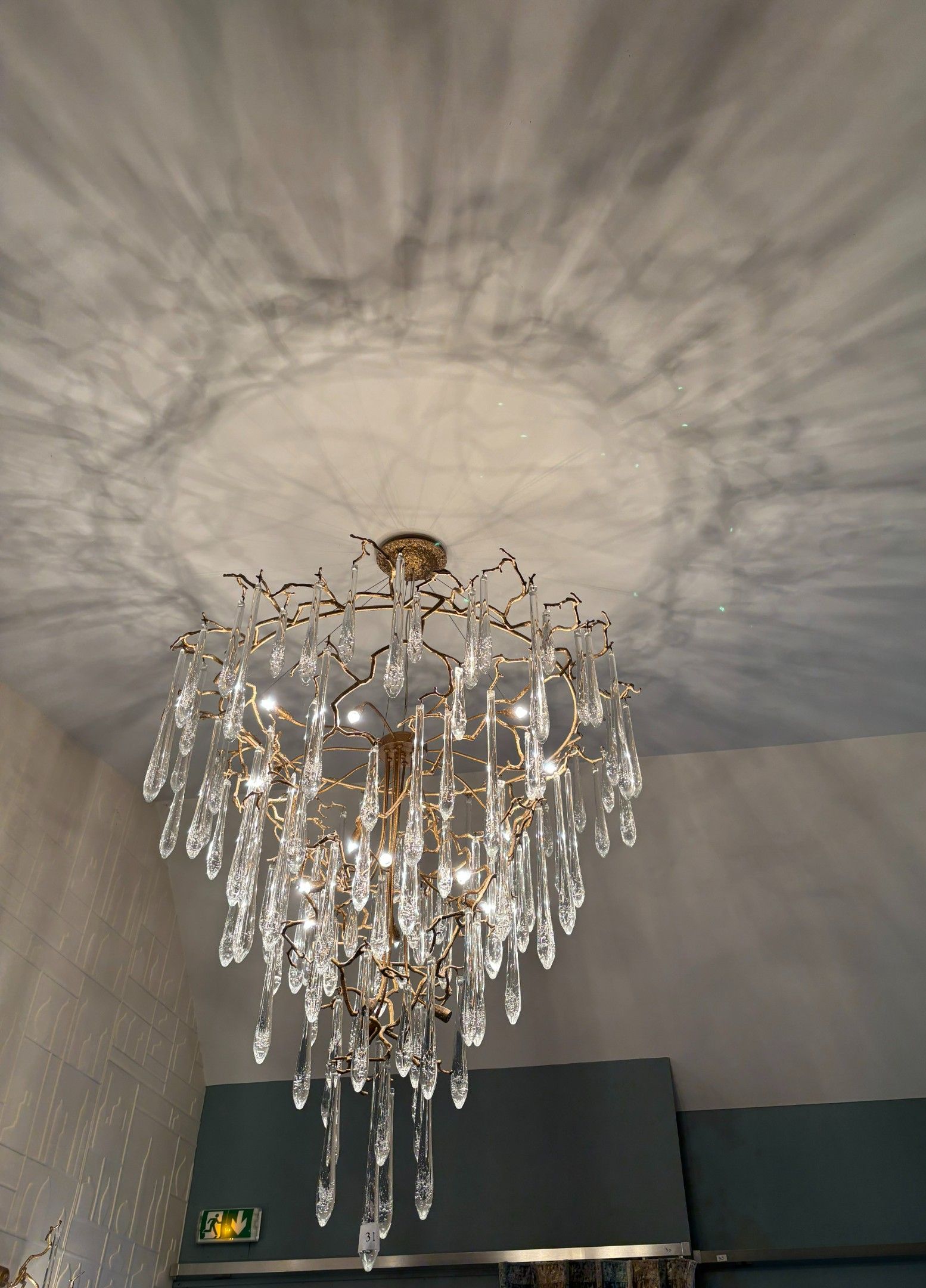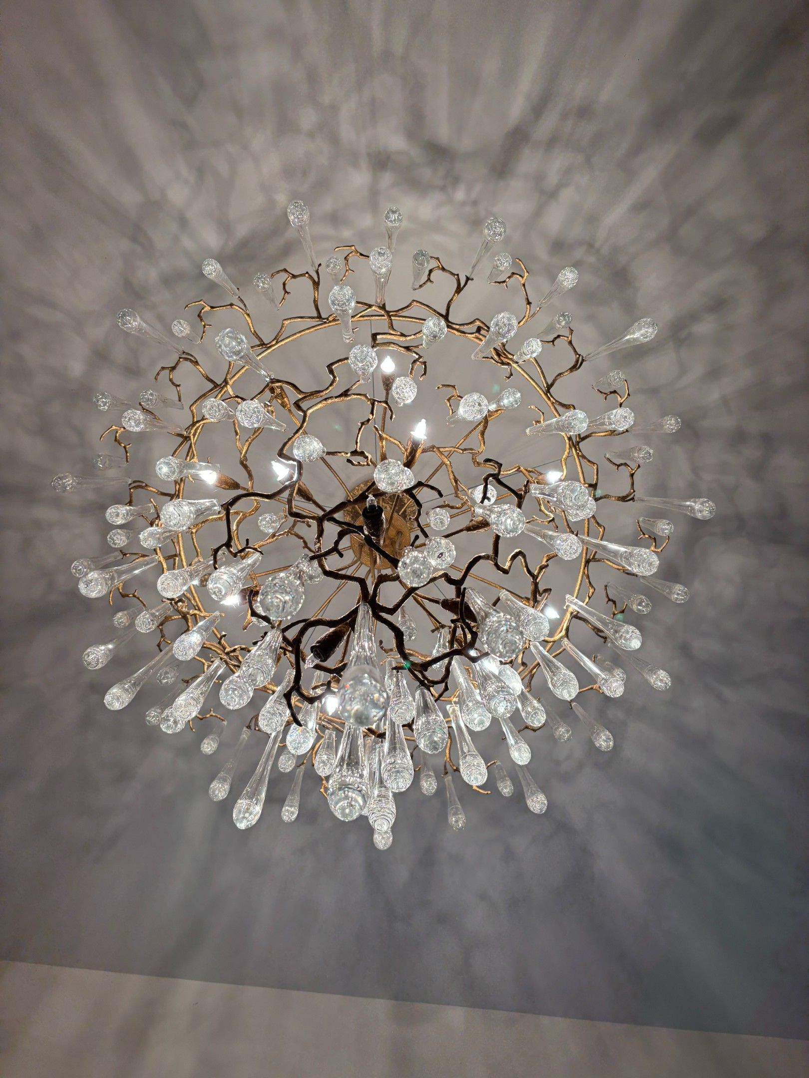 Large MARIO J-PIRES chandelier with gilt bronze frame imitating the branches of a tree, decorated with large bubble glass drops (height: approx. 177cm).