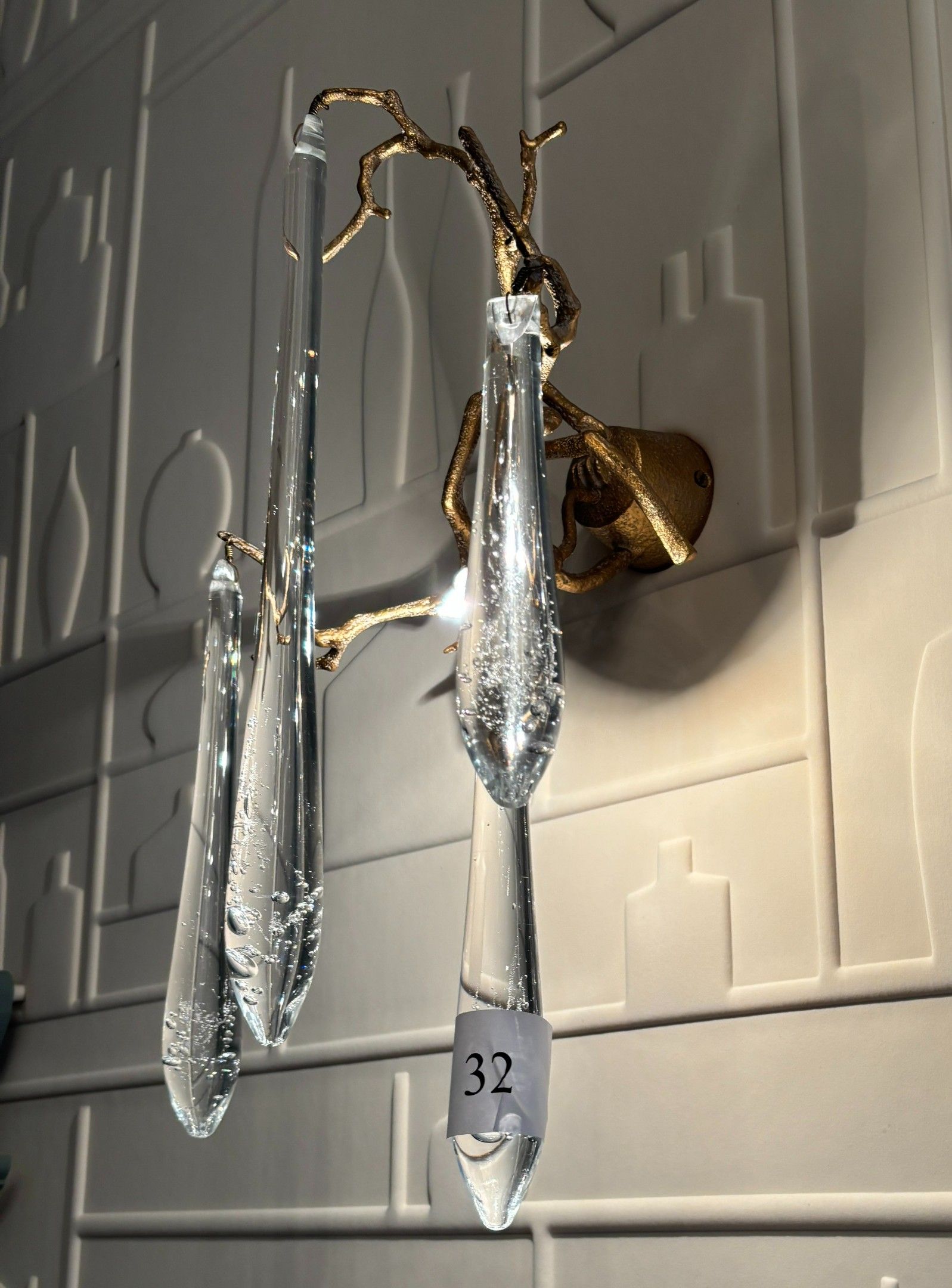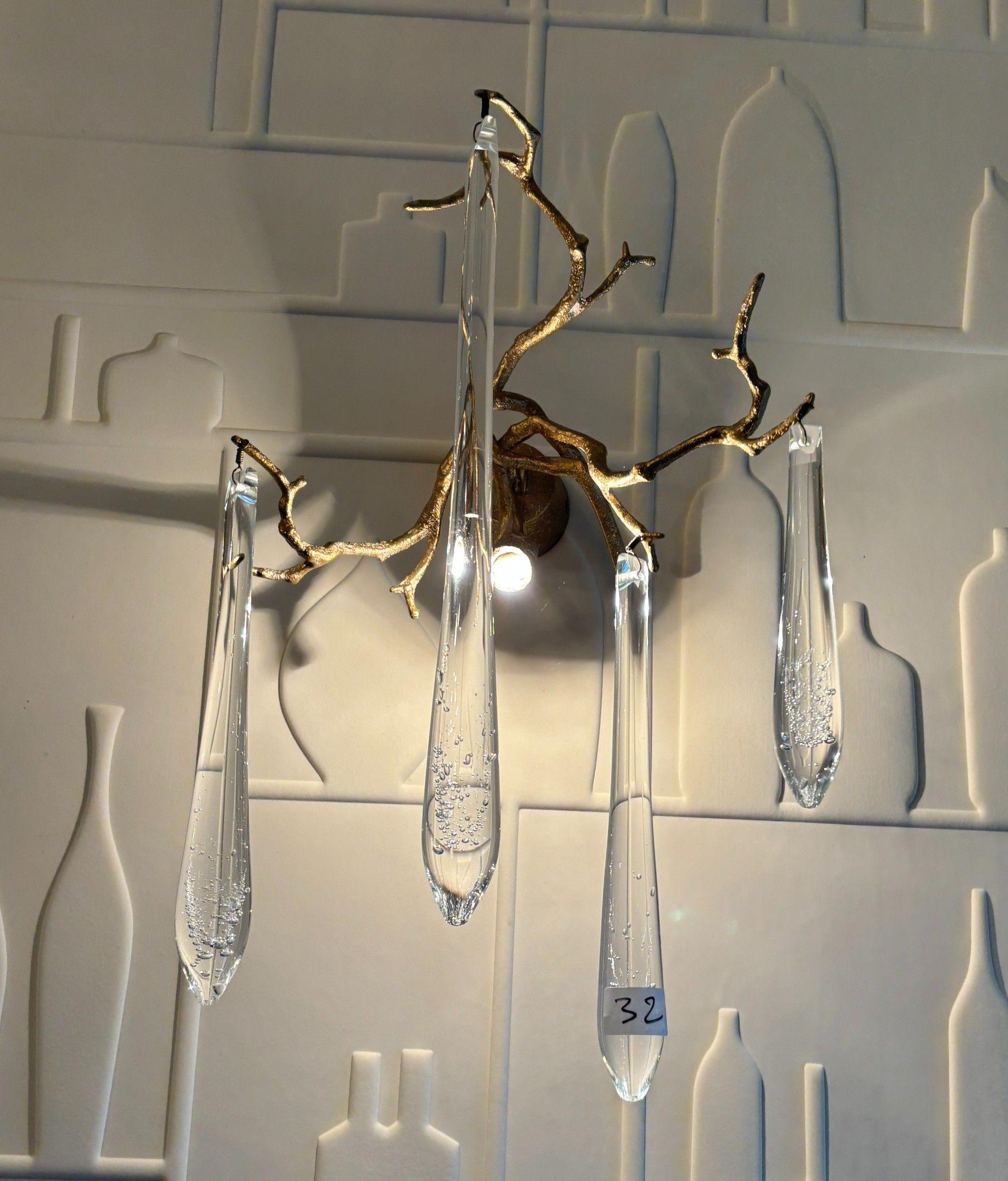 Two wall sconces with pendants, MARIO J-PIRES, frame in gilded bronze imitating the branches of a tree, embellished with large drops of bubble glass.