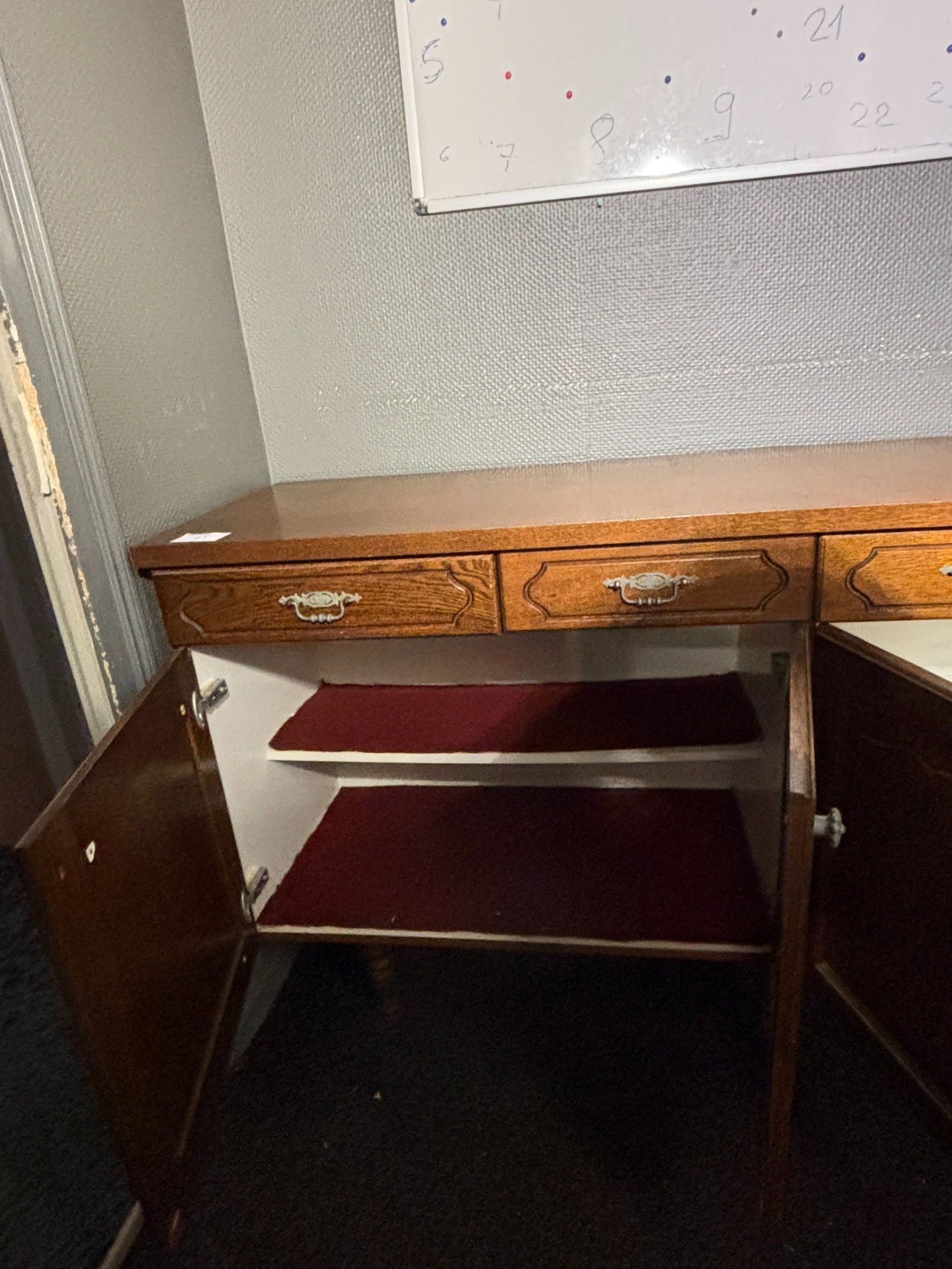 - low wooden cabinet, four doors and four drawers, (length: 180cm, width: 50cm, height: 93cm)