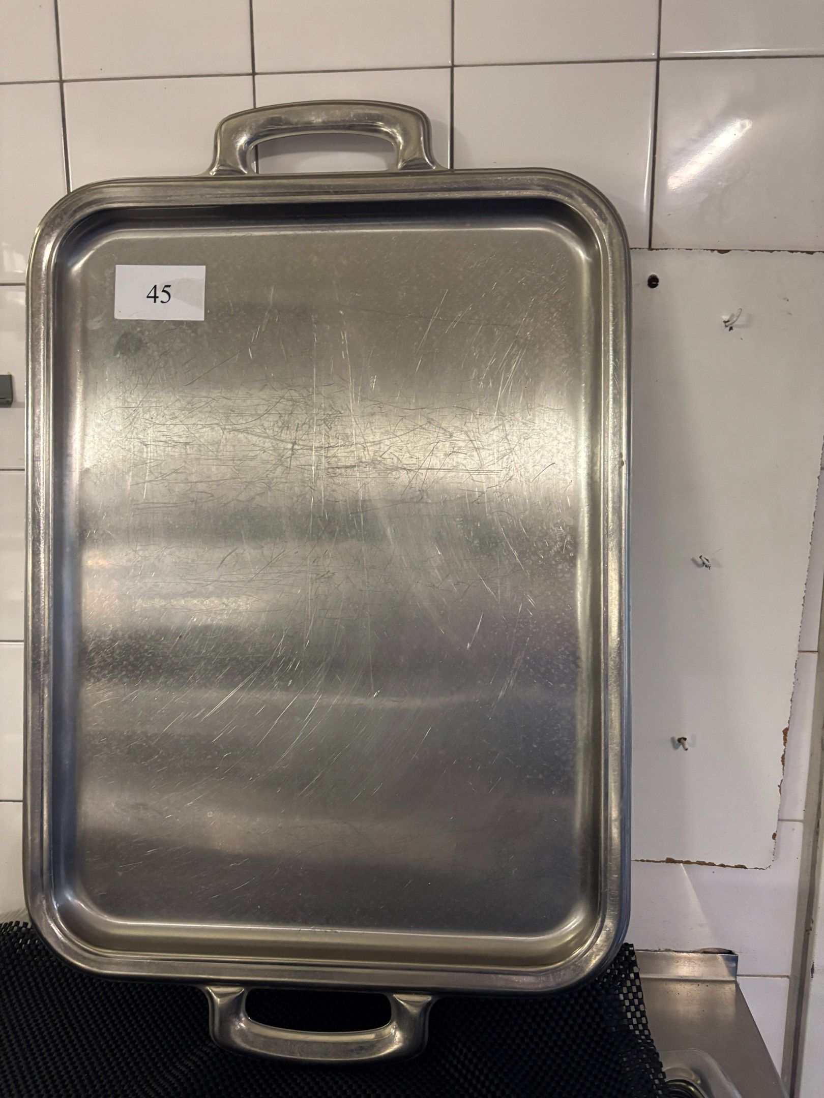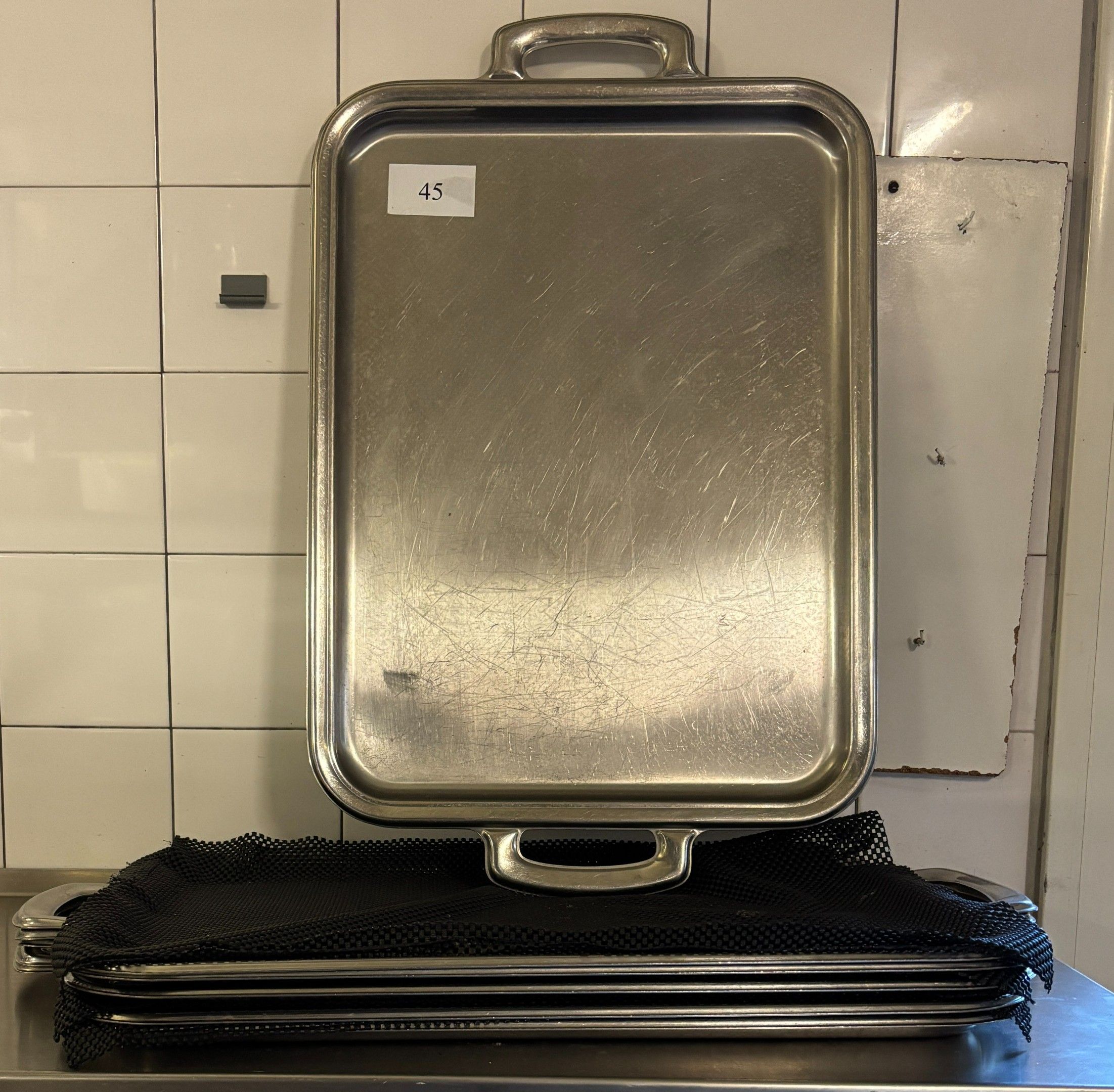Six stainless steel serving trays, (length: 80cm, width: 45c…