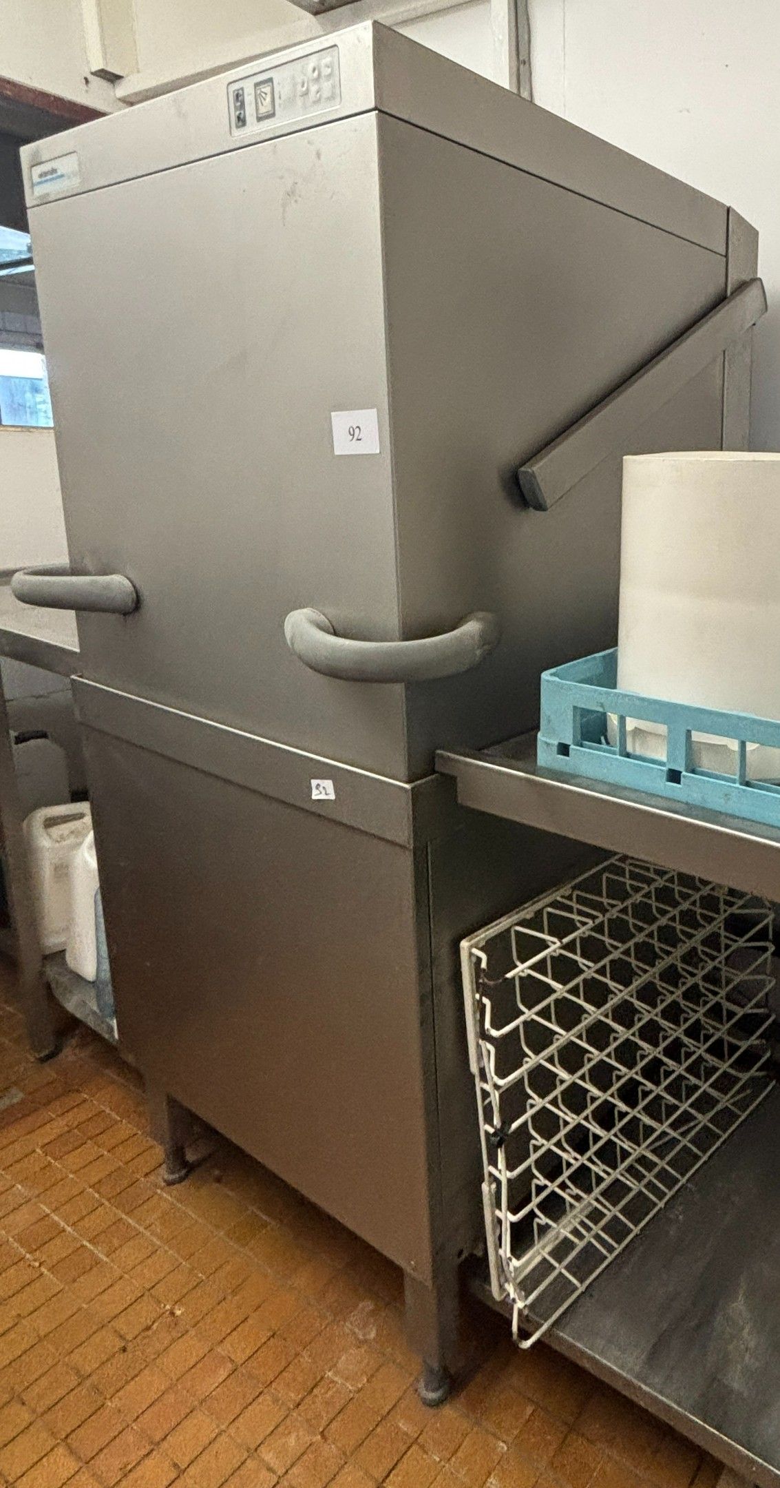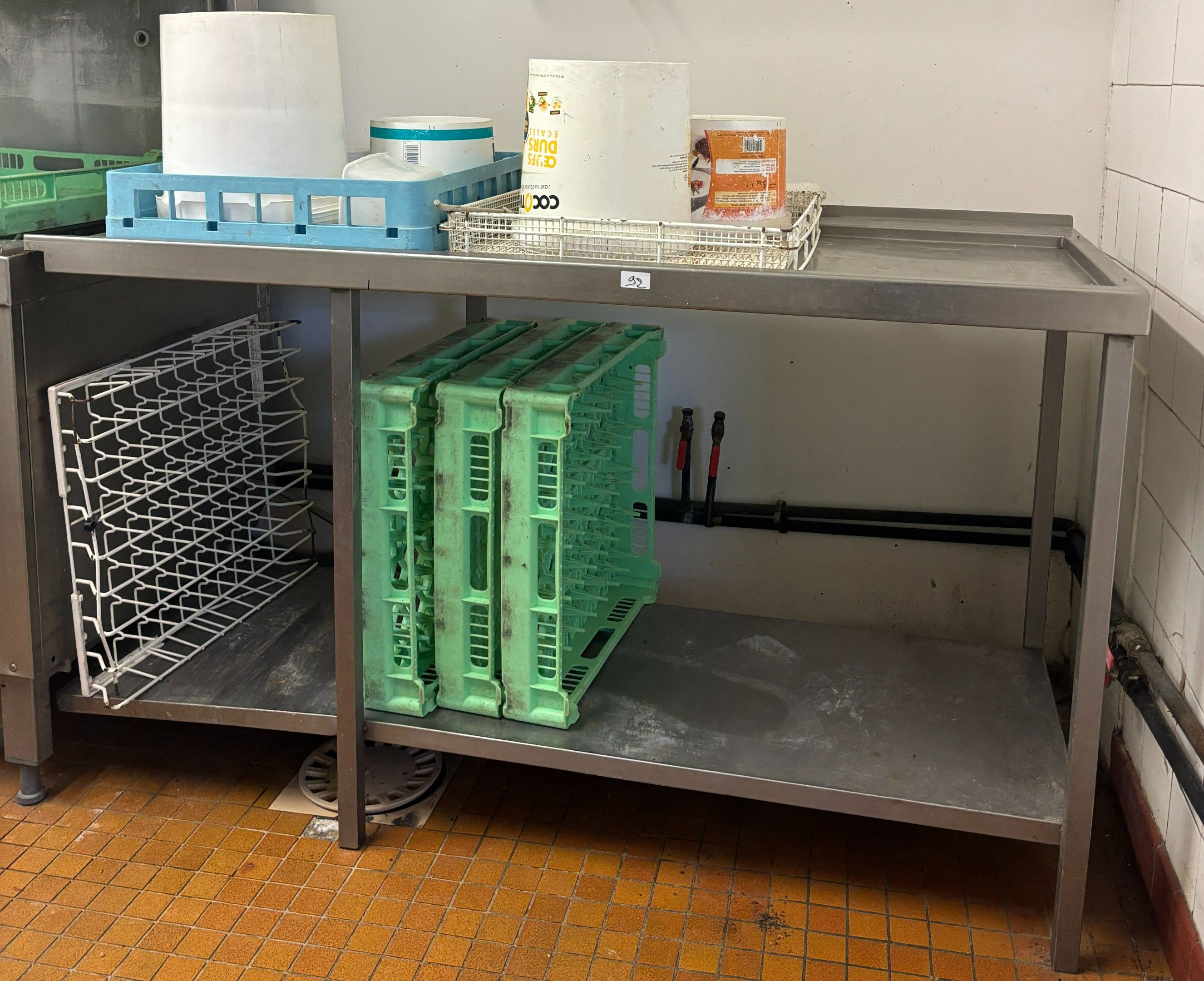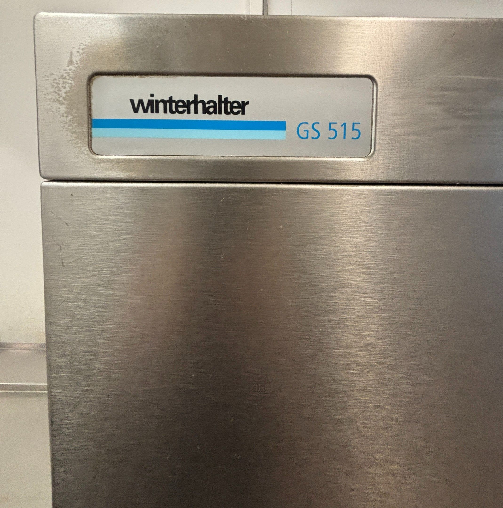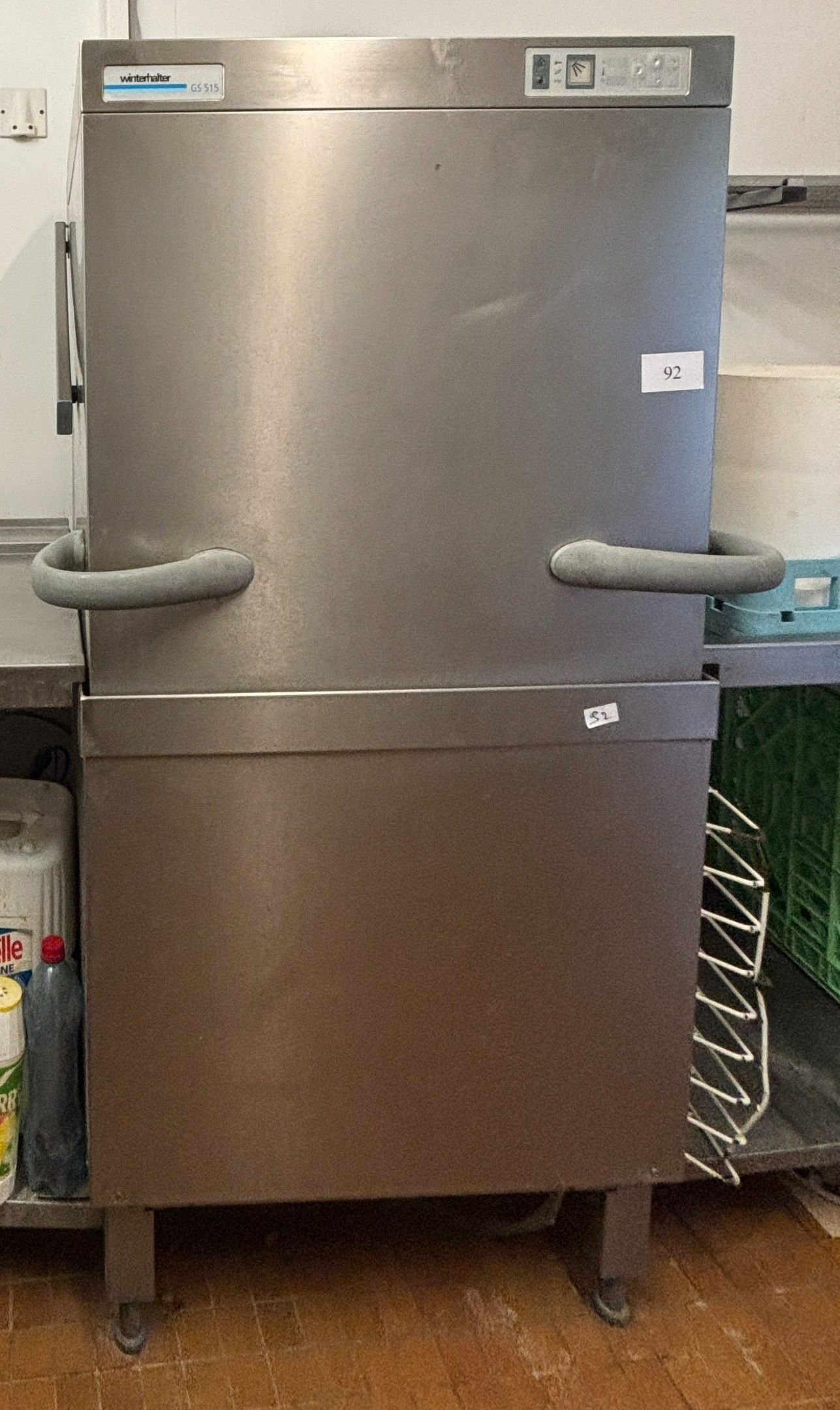 - WINTERHALTER GS515 dishwasher, with five plastic bins and two metal bins, (length: 330cm, width: 67cm, height: 90cm), stainless steel worktops, sink inlet and outlet