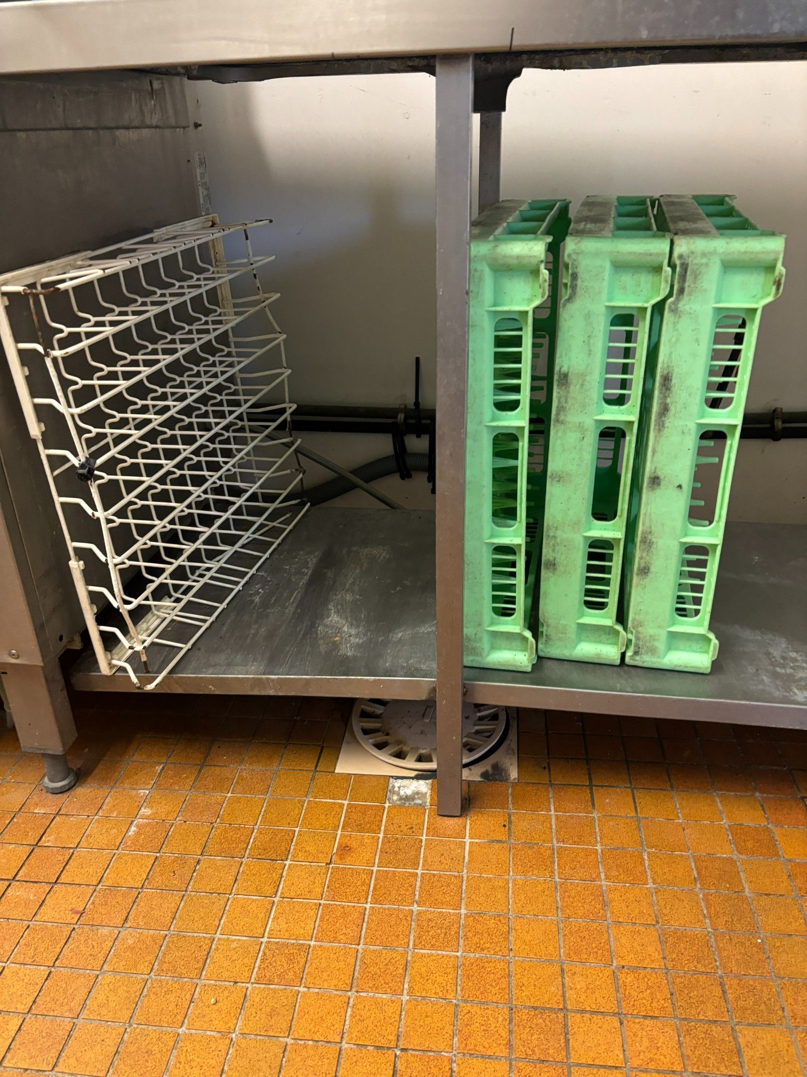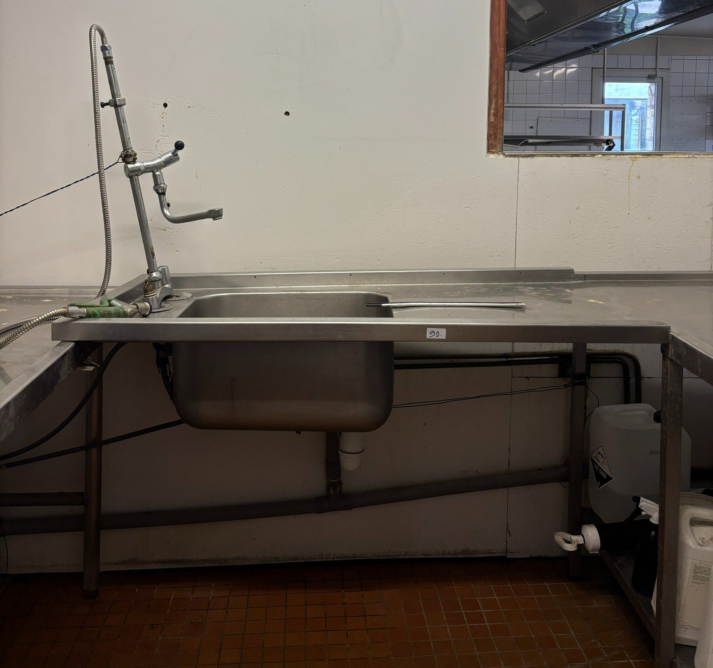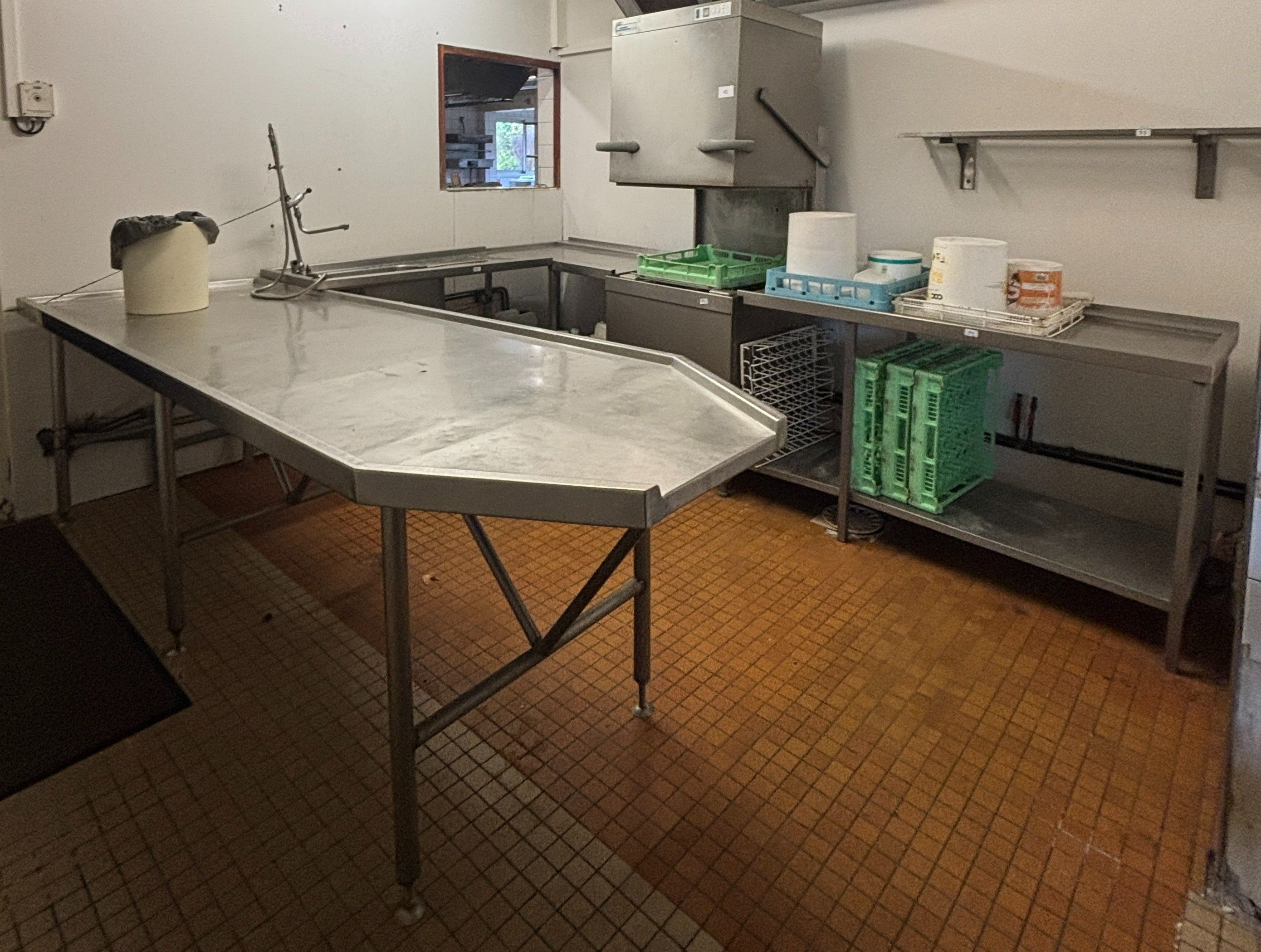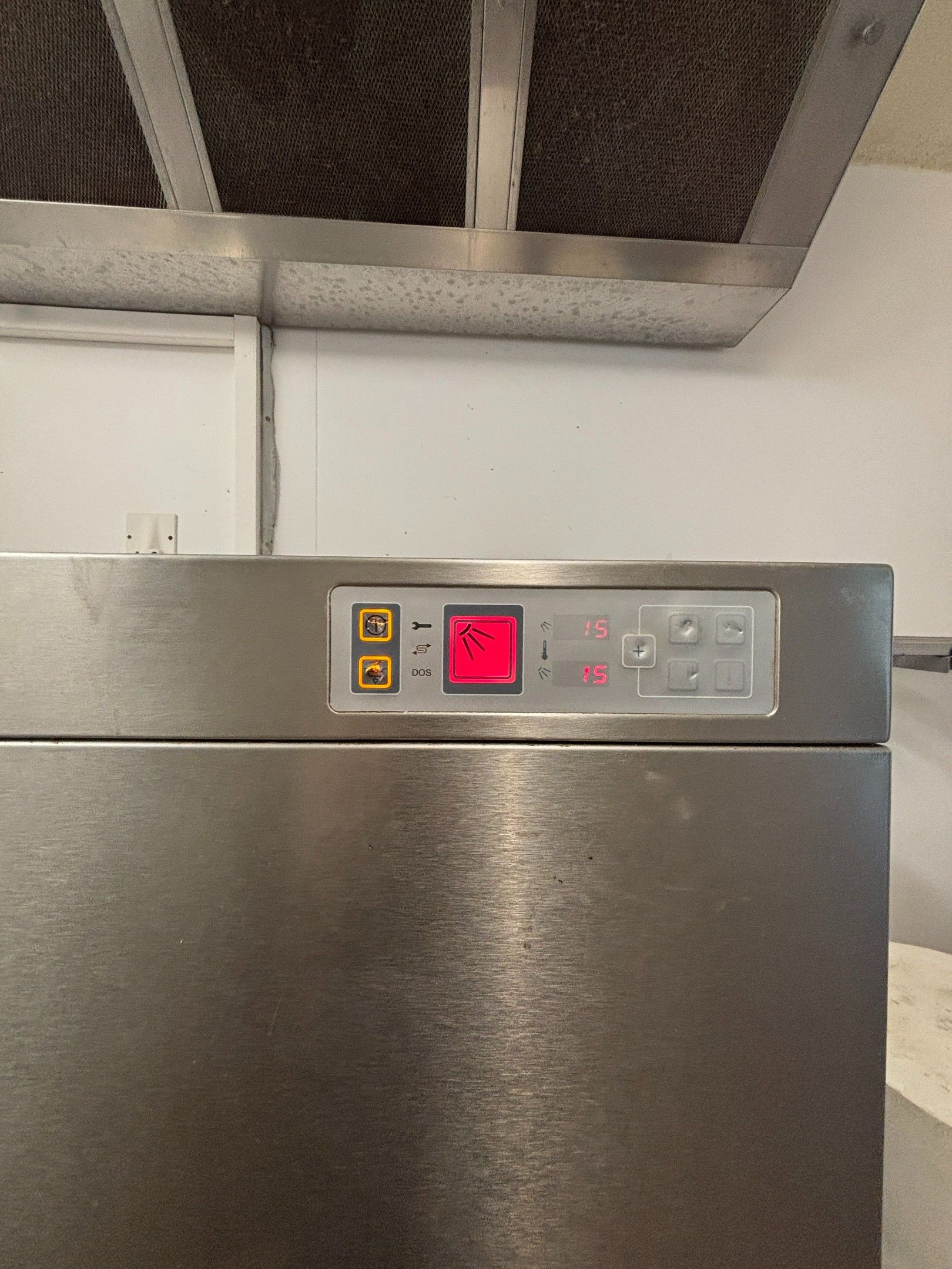 - WINTERHALTER GS515 dishwasher, with five plastic bins and two metal bins, (length: 330cm, width: 67cm, height: 90cm), stainless steel worktops, sink inlet and outlet