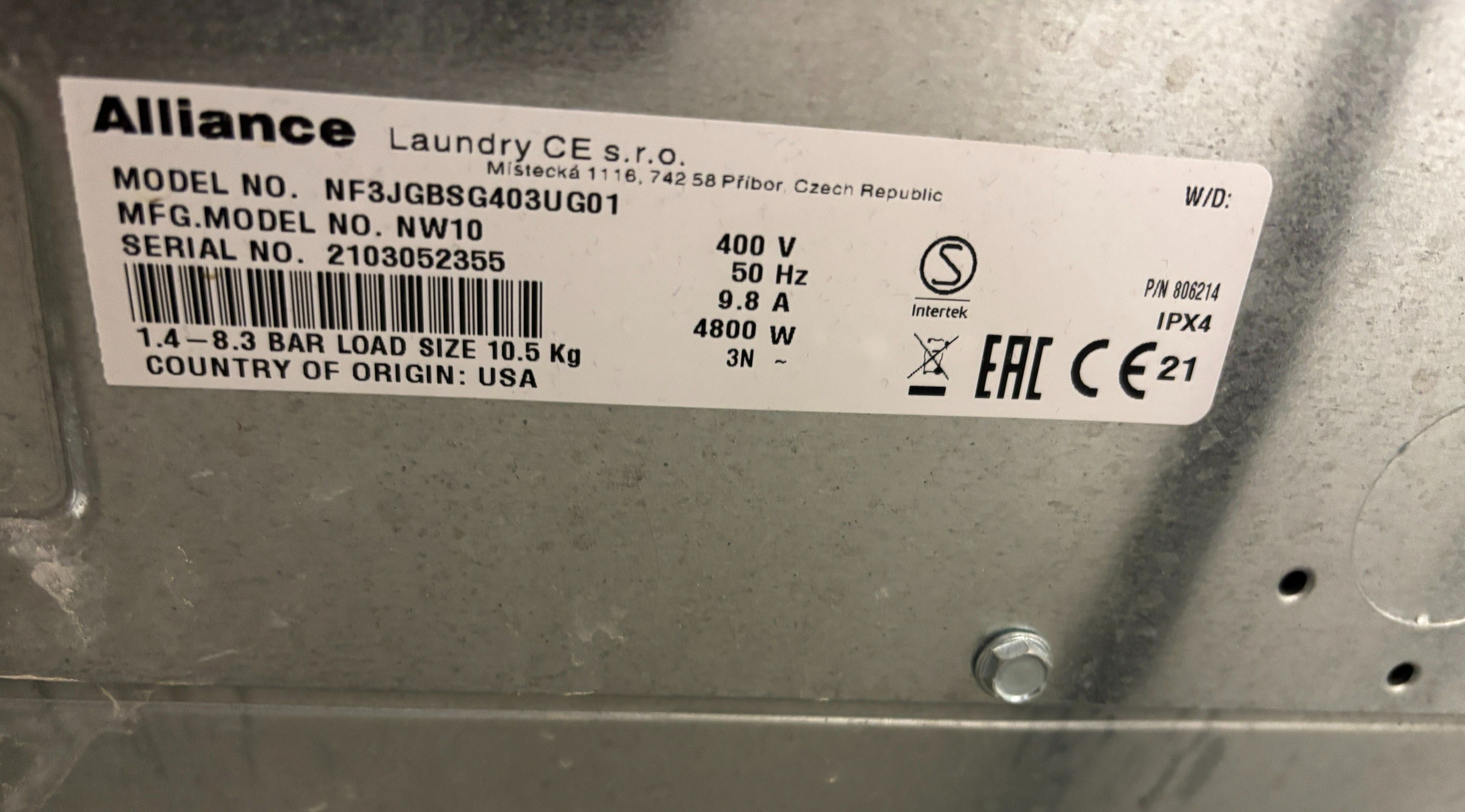Washing machine ALLIANCE NO. NW10, 10,5kg, 400V, 4800W.
