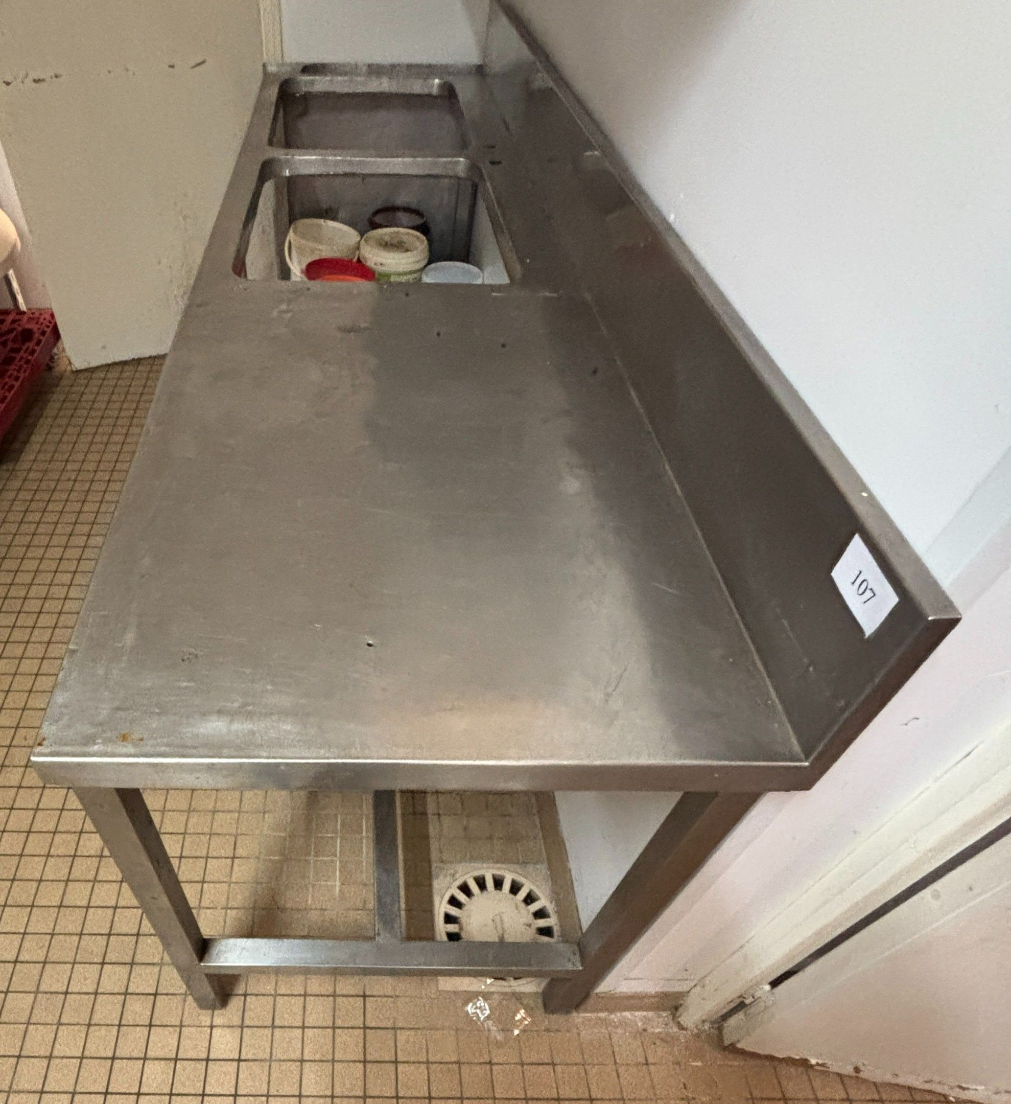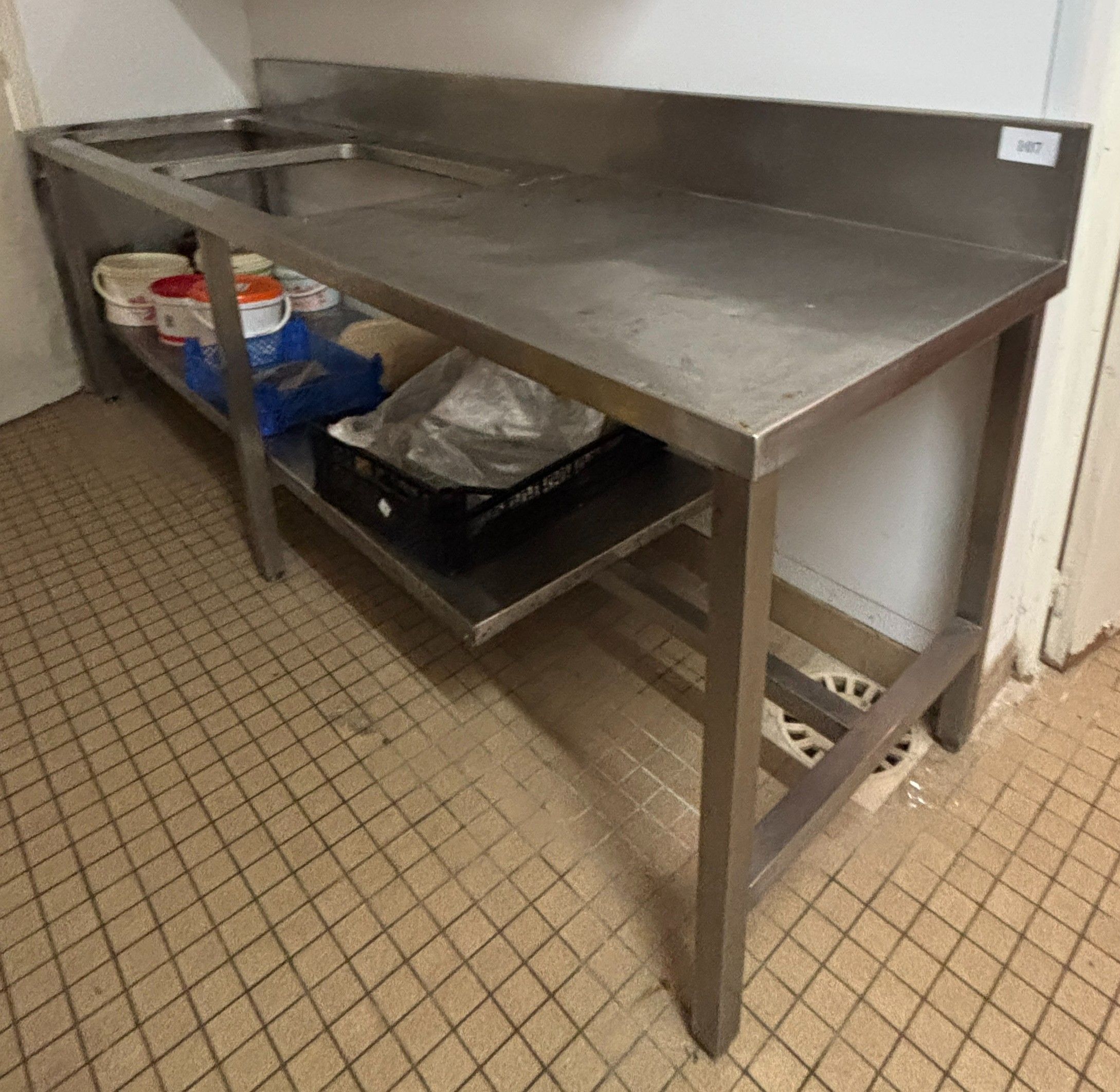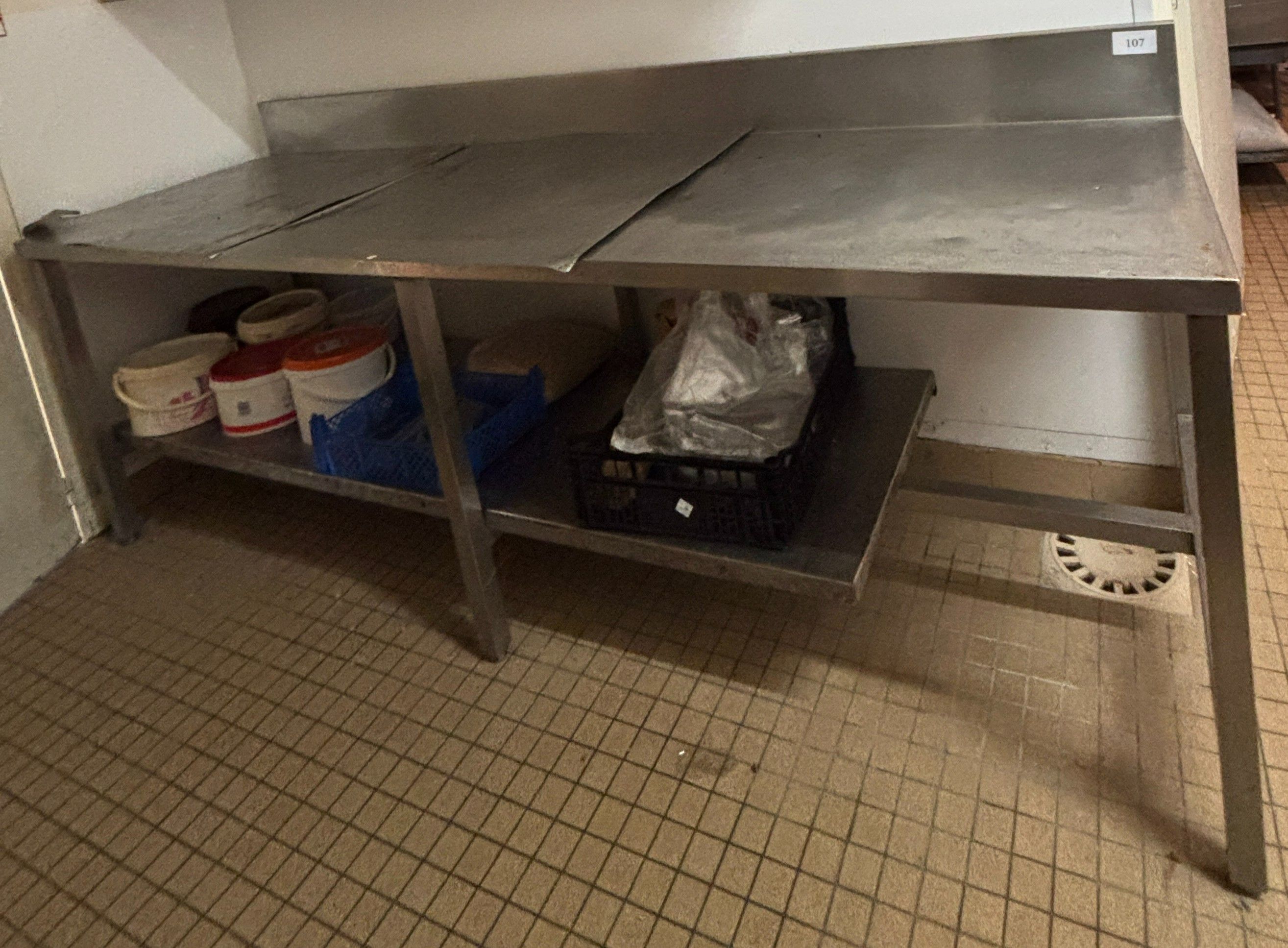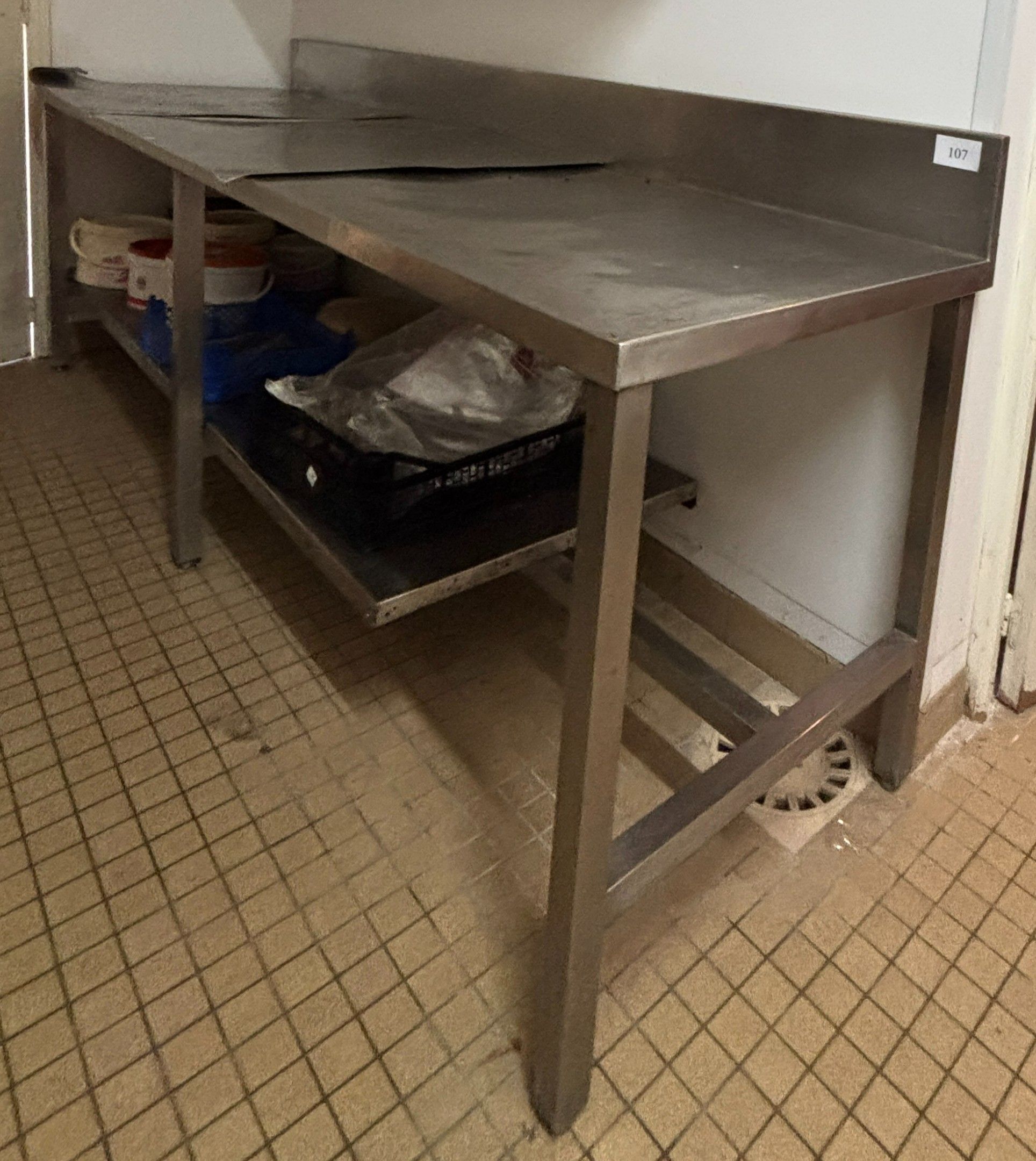 Rectangular stainless steel table, with space for washing-up trays, spacer shelf, (length: 250cm, width: 73cm, height: 83cm).