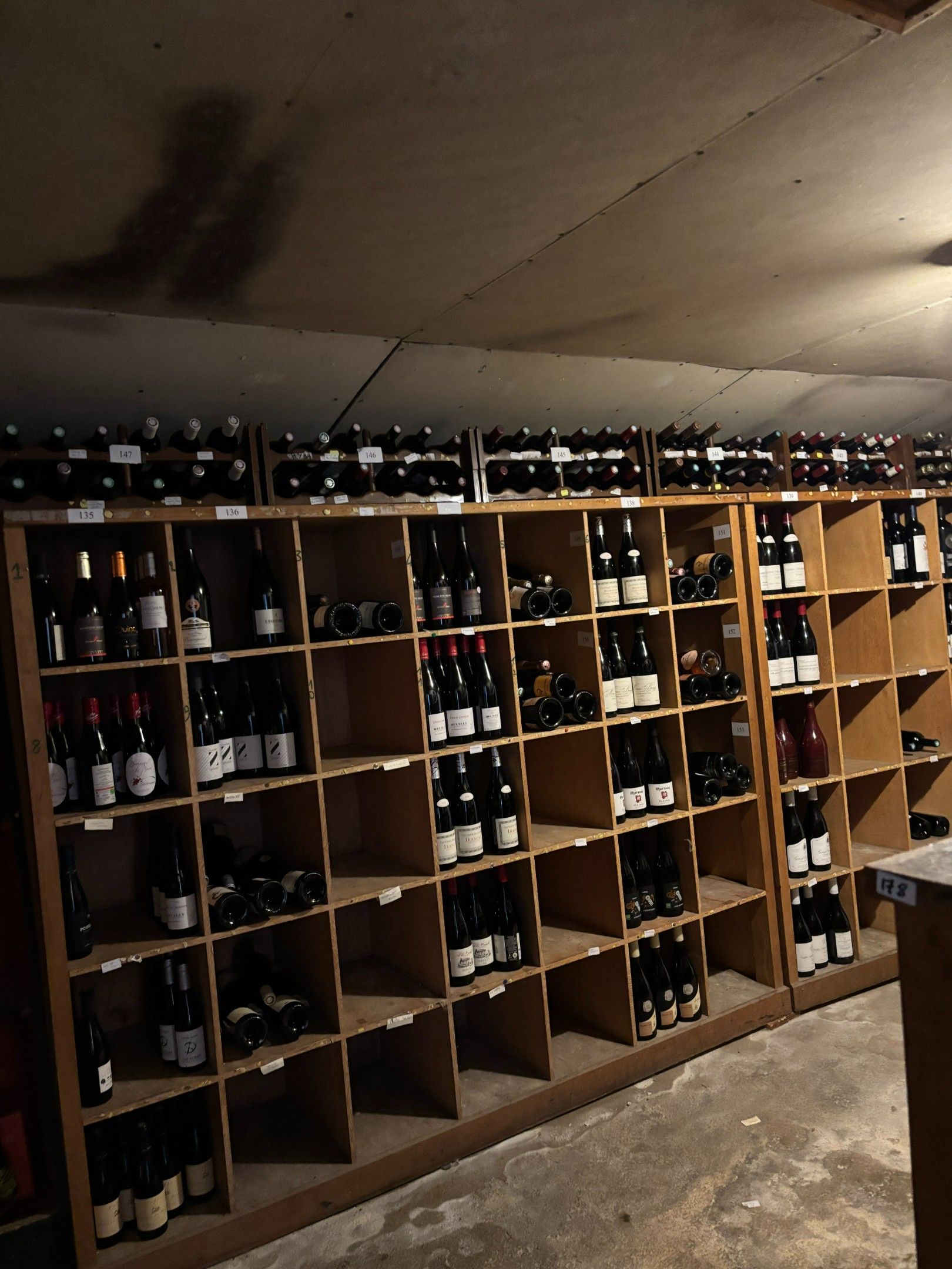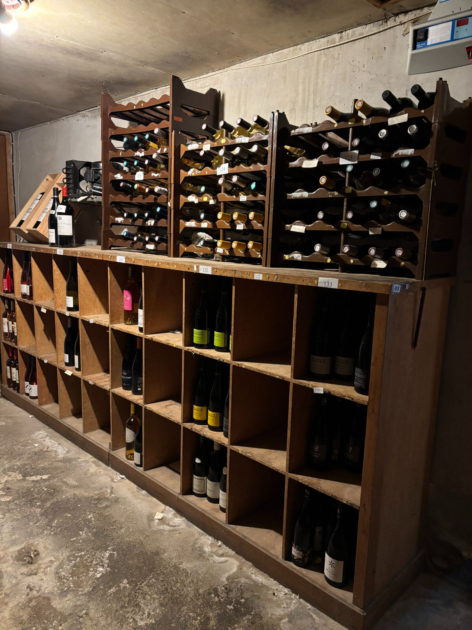 Set of wooden bottle racks of various sizes, including two modules (length: 215cm, width: 50cm, height: 170cm), 35 compartments; module, approximately 3m linear, 30 compartments.