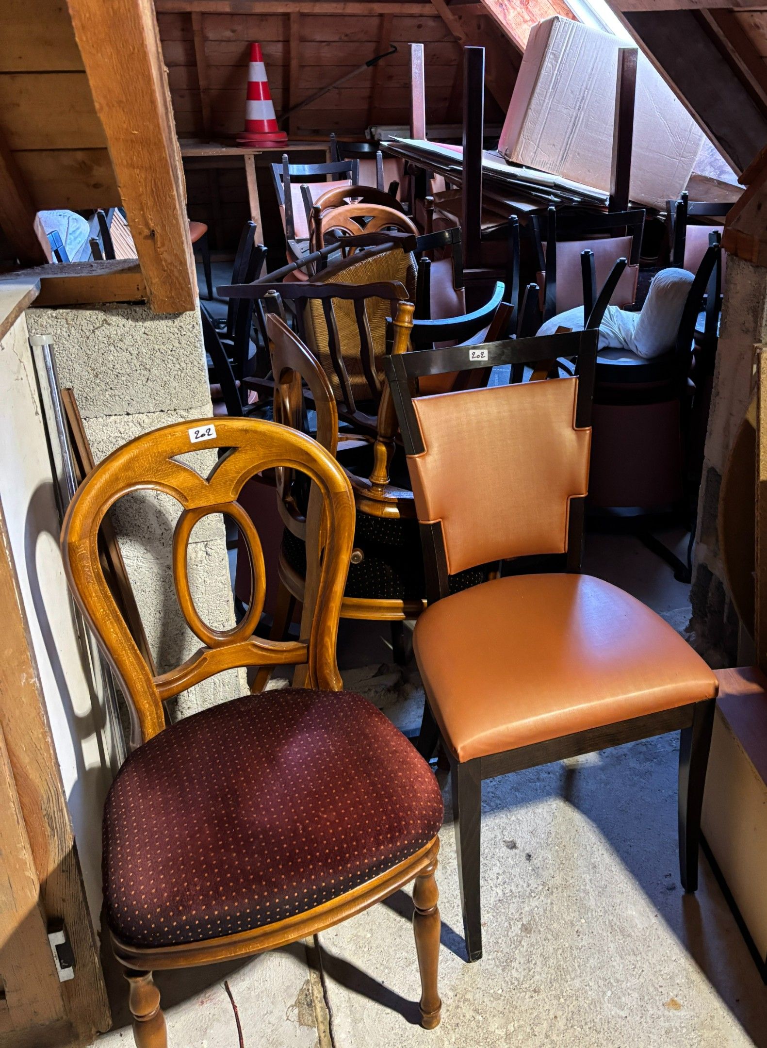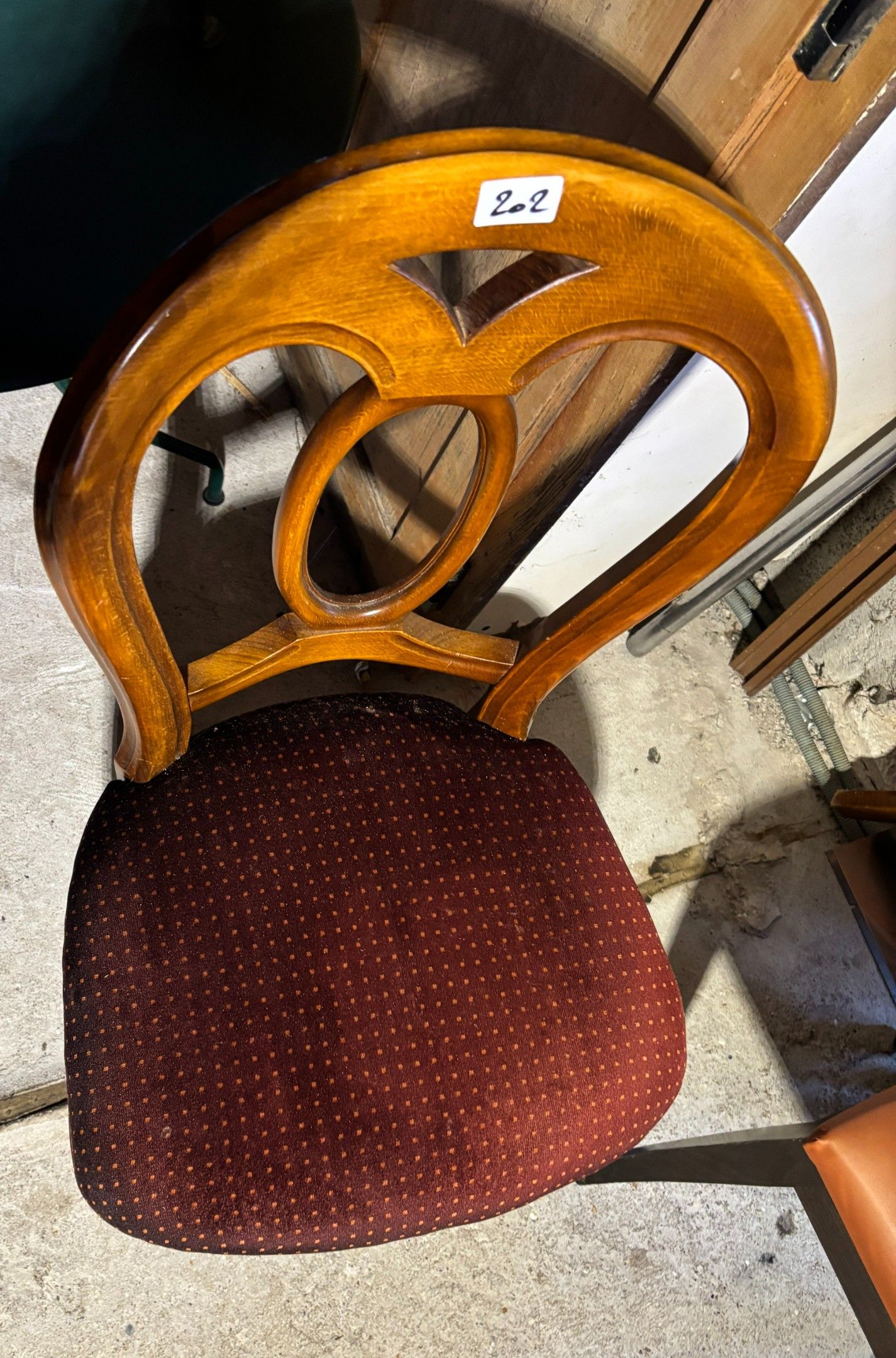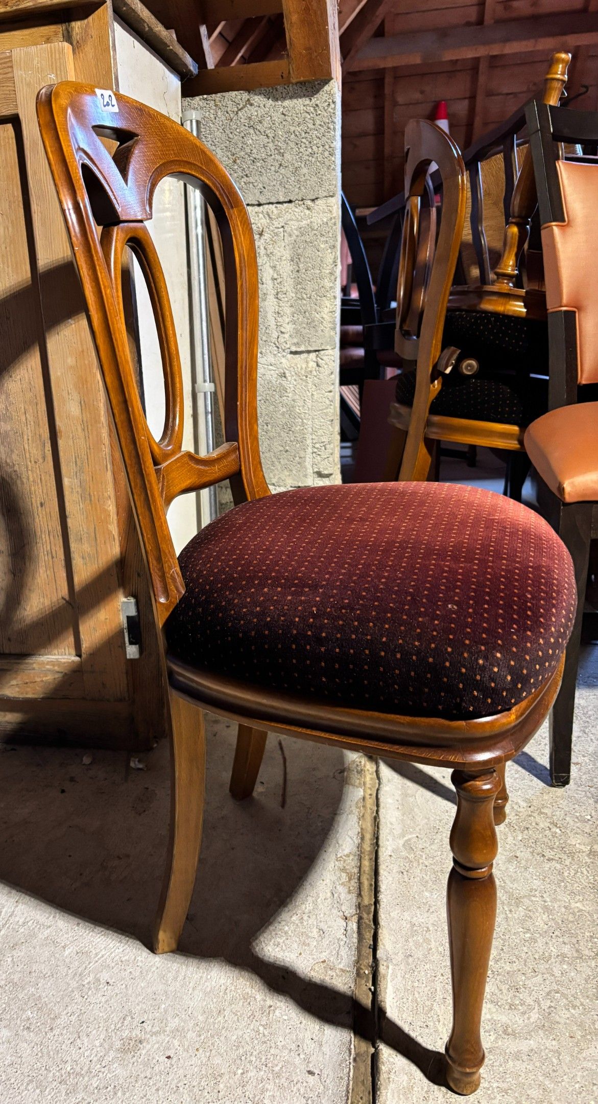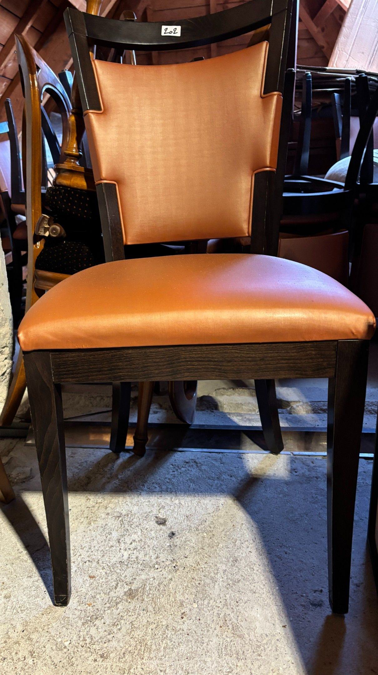 - approximately 15 chairs, brown imitation leather seat and back, wooden base