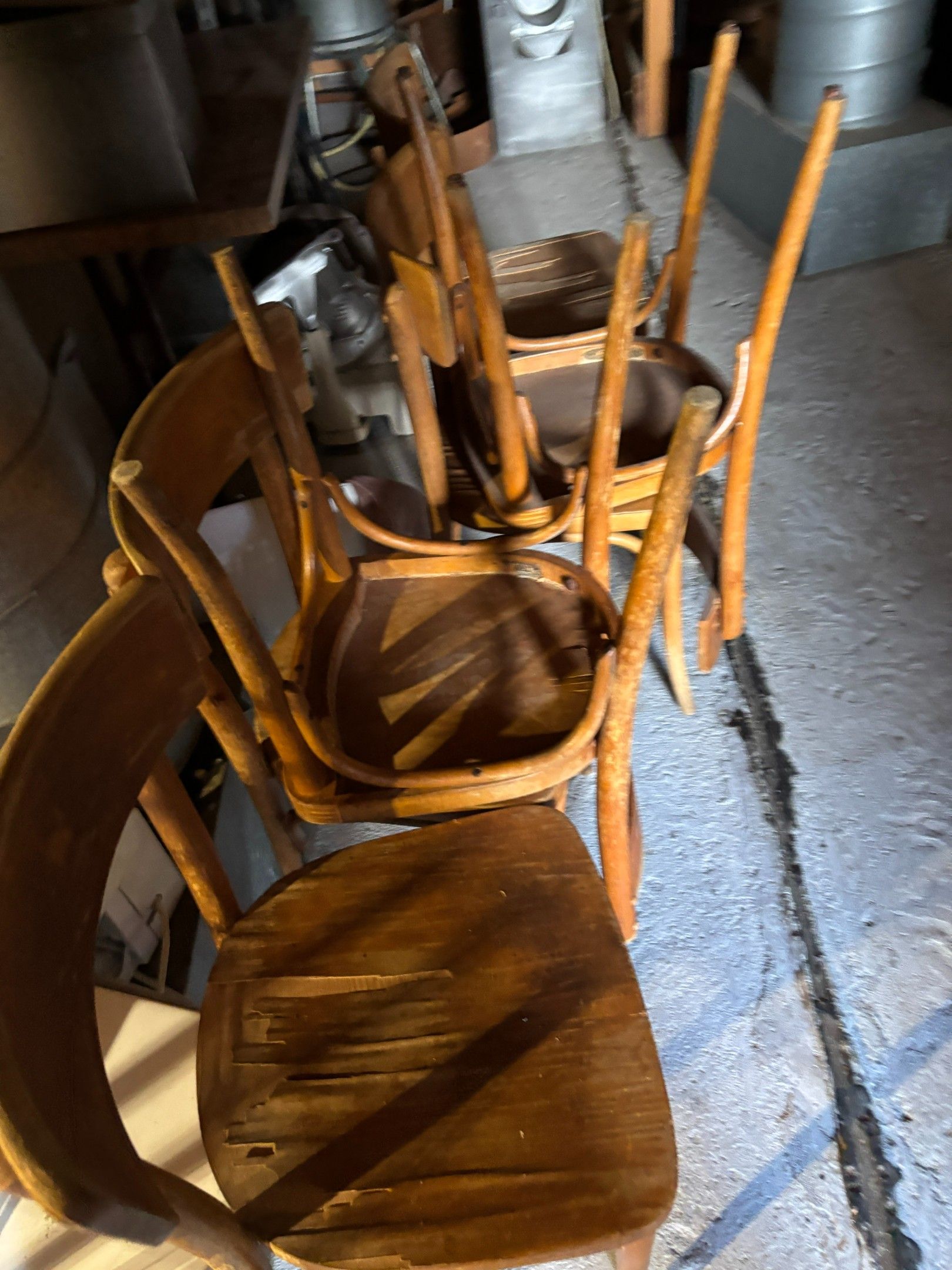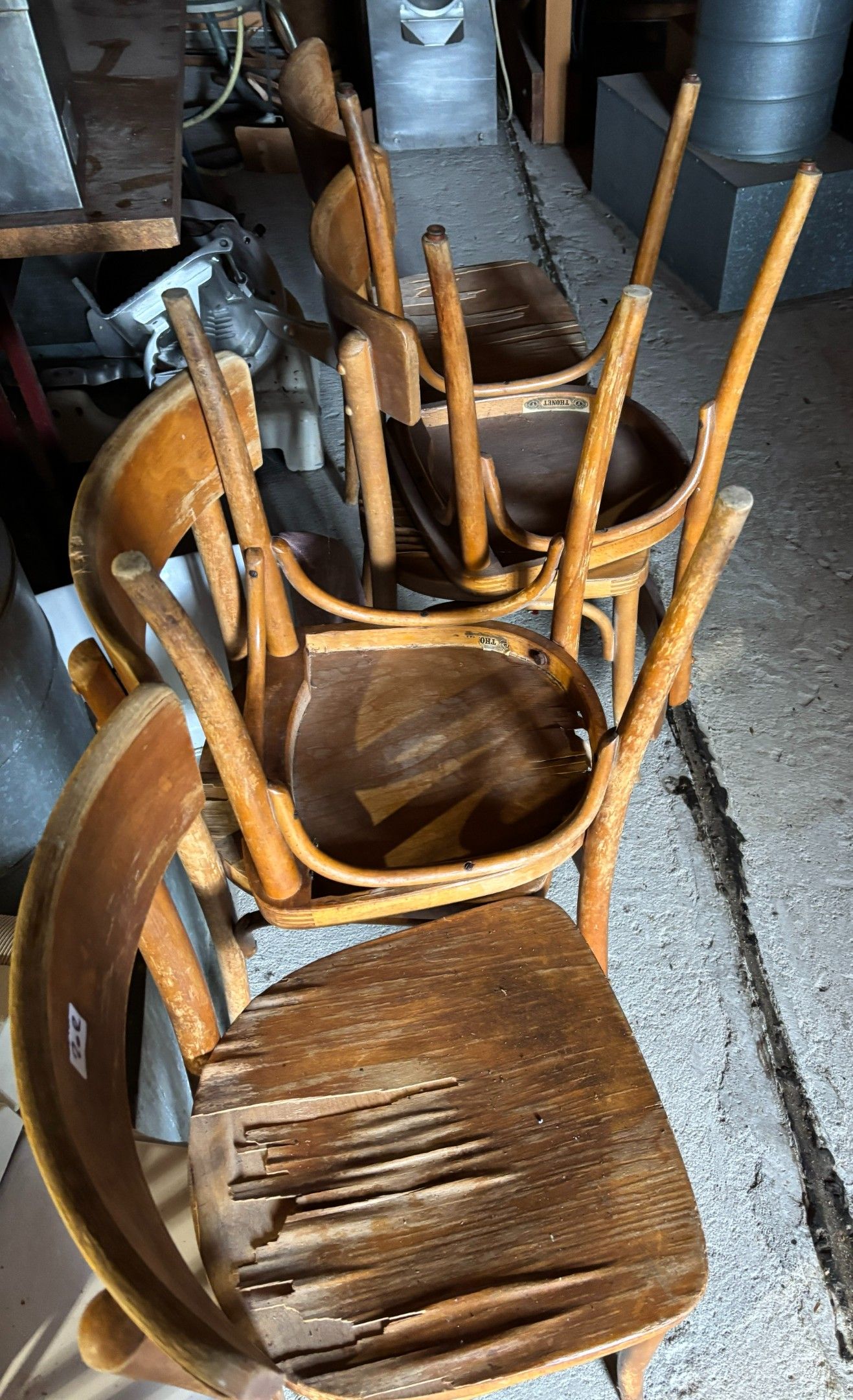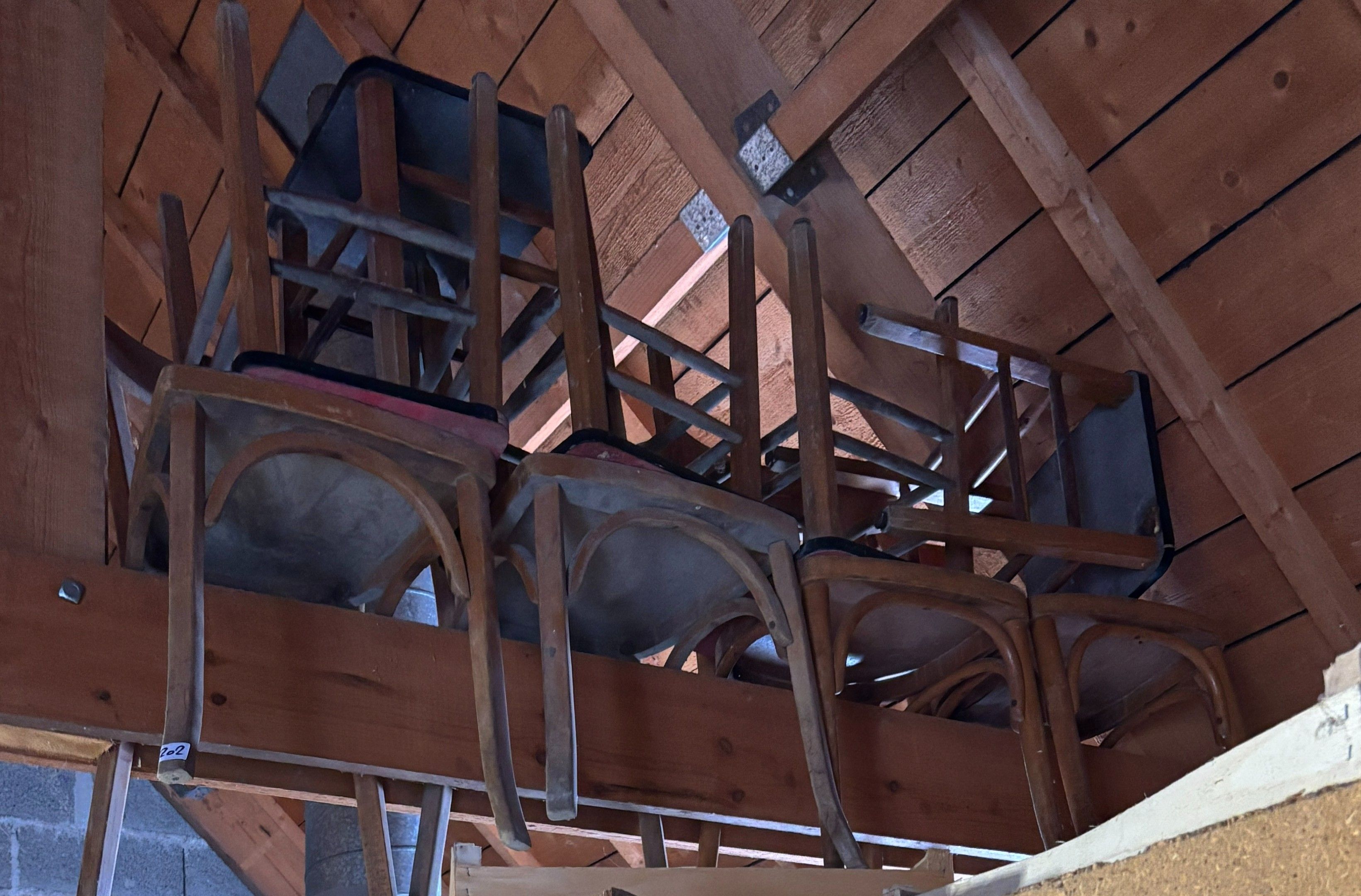 - approximately 15 chairs, brown imitation leather seat and back, wooden base