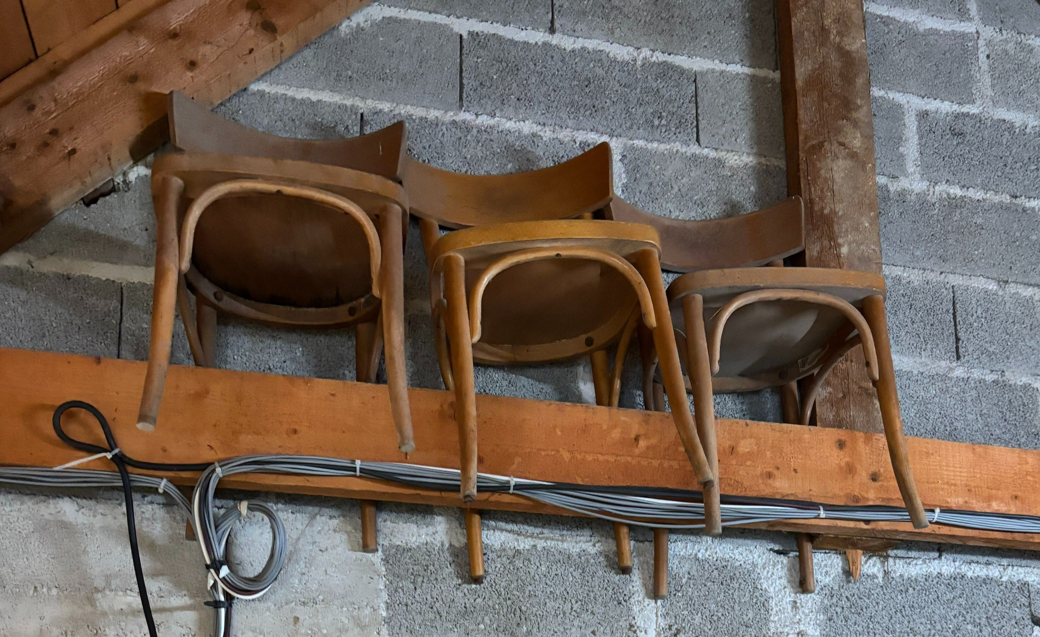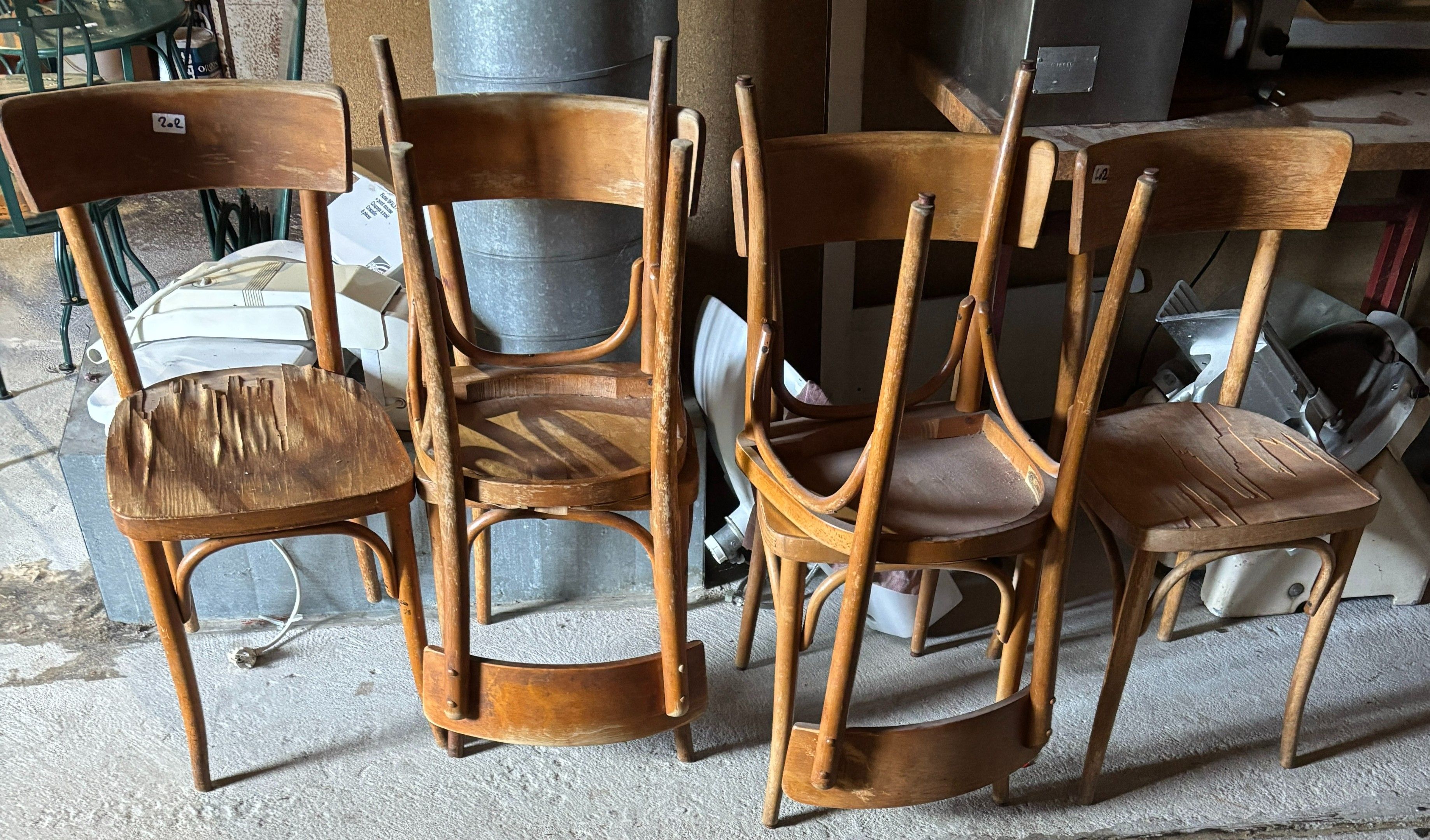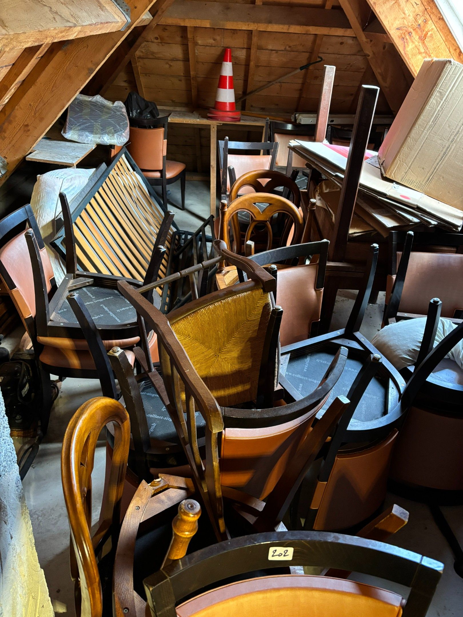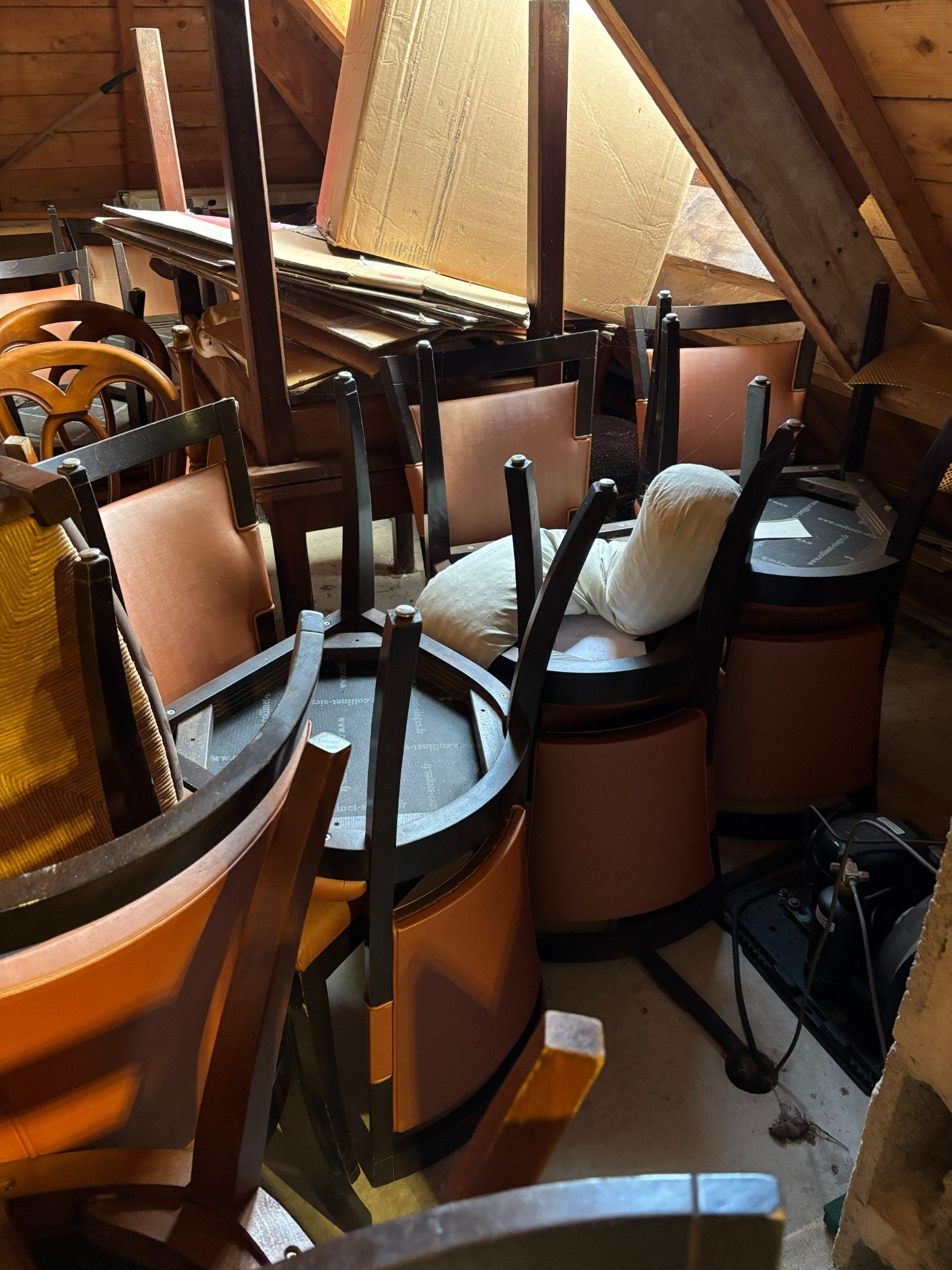 - approximately 15 chairs, brown imitation leather seat and back, wooden base