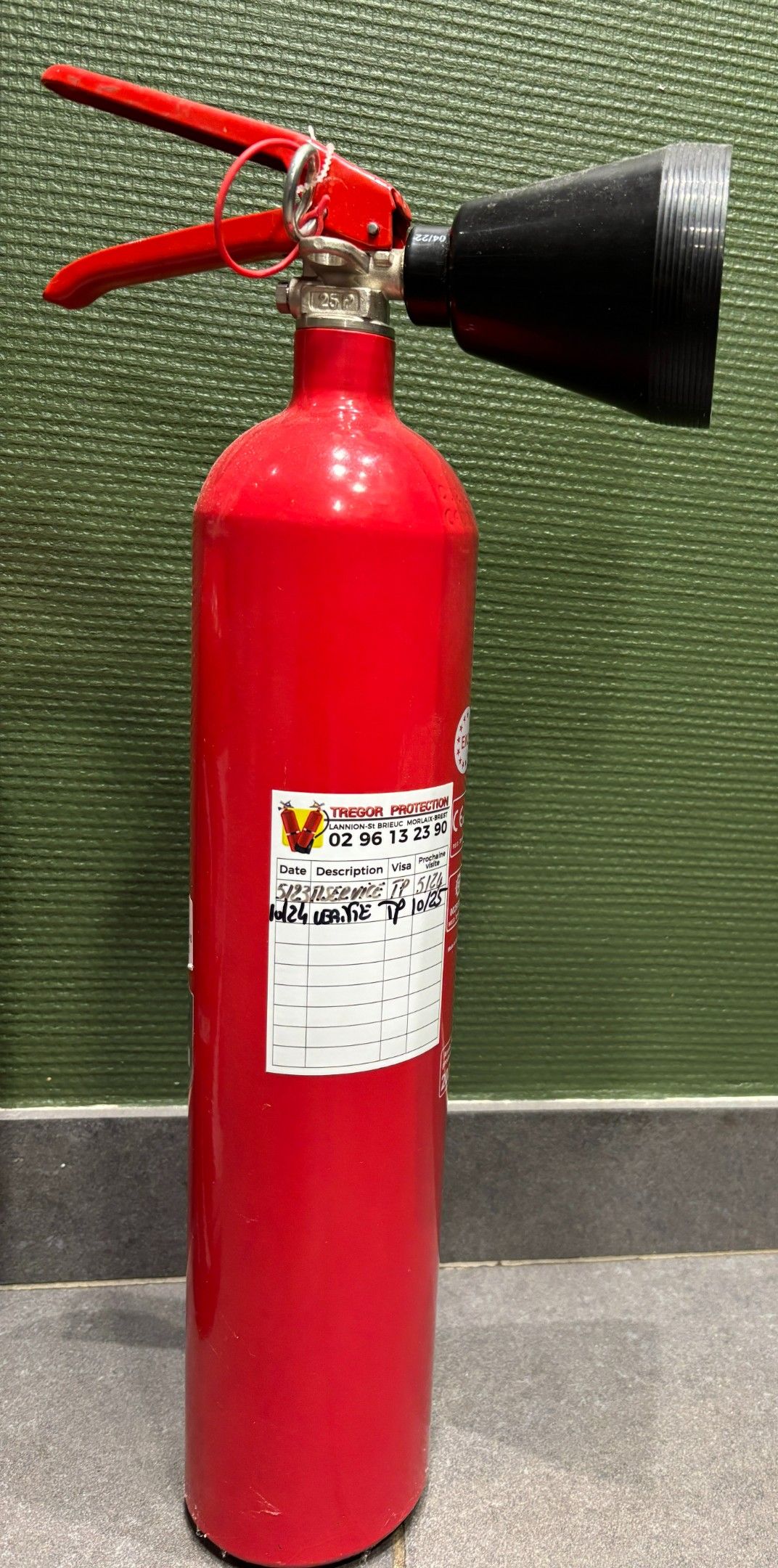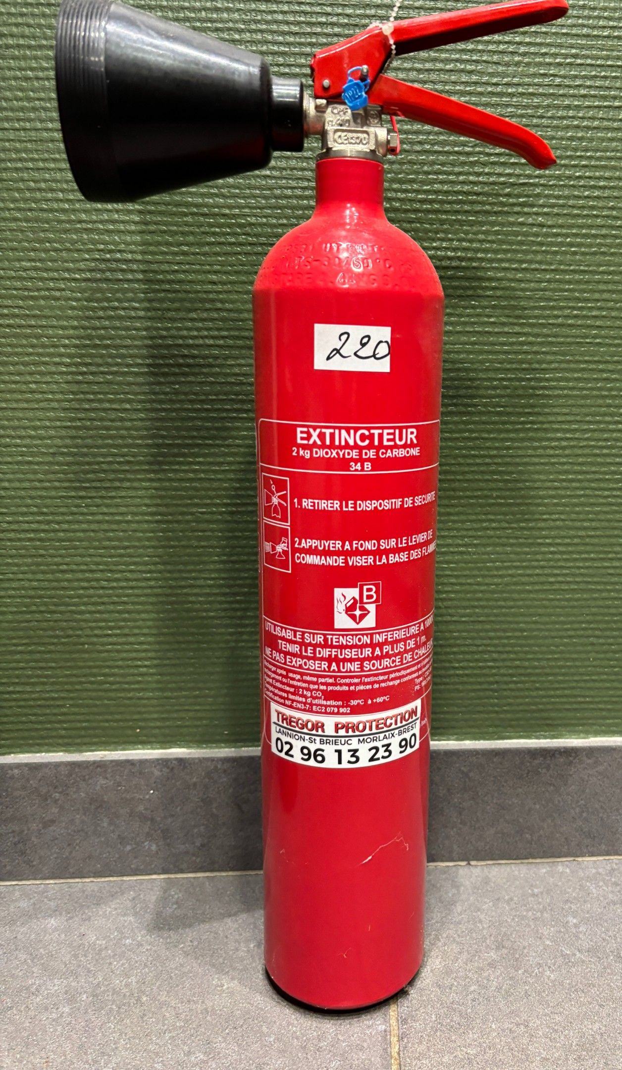 Two fire extinguishers: 6 litres water spray; 2kg carbon dioxide.