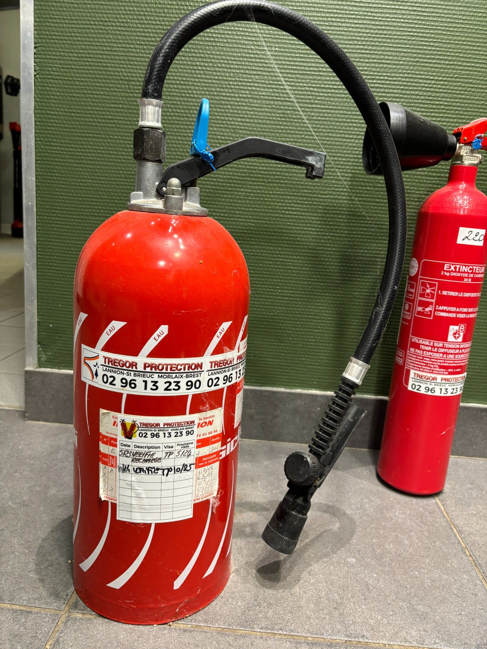 Two fire extinguishers: 6 litres water spray; 2kg carbon dio…