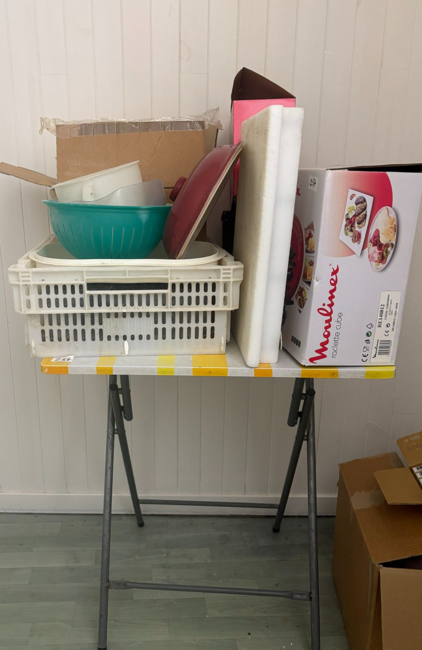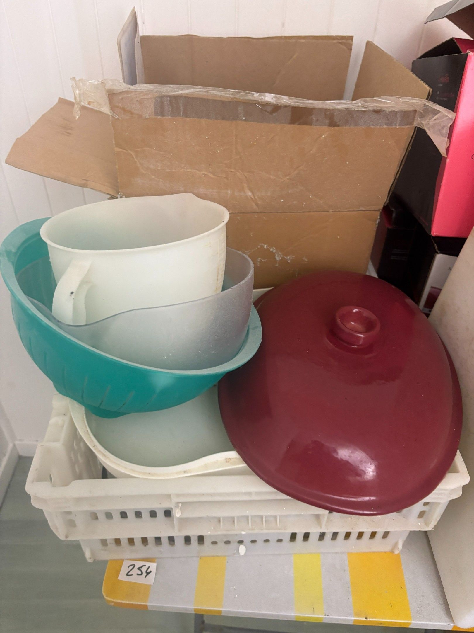 - several items including plastic salad bowl, plastic crate and miscellaneous.