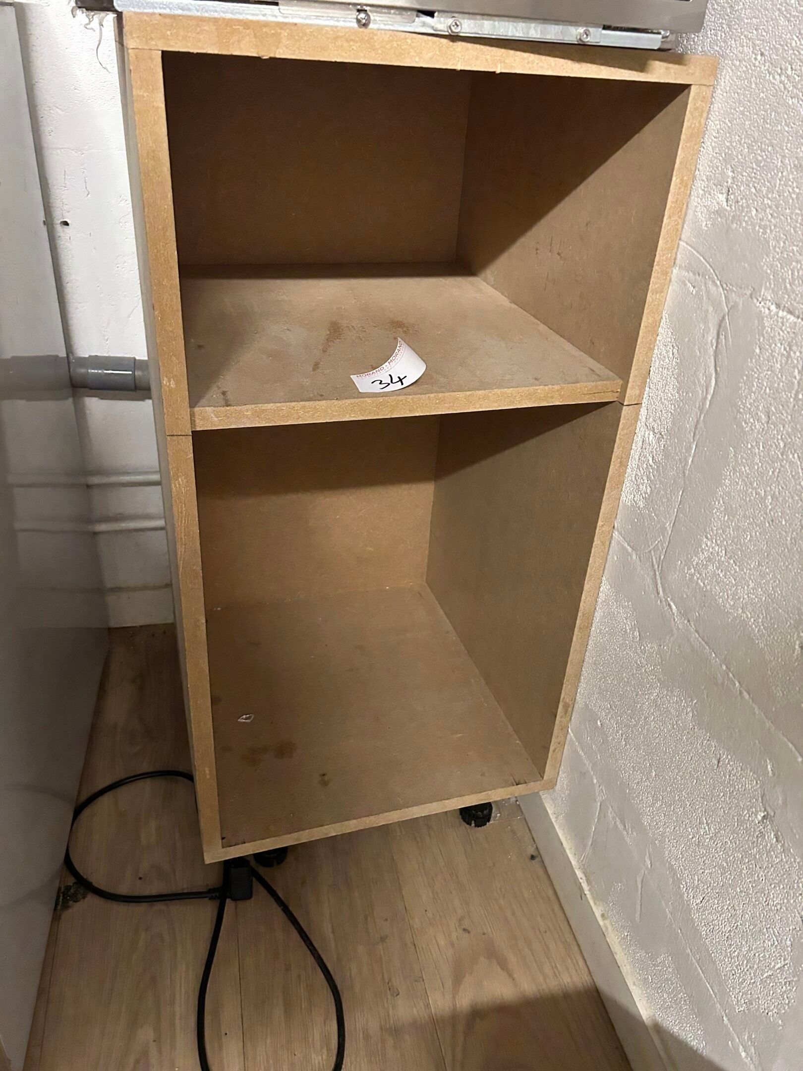 Small 2-level wooden cabinet with metal structure and 2-level chipboard column, 4-colour lockers and a small key-operated safe (door damaged) are also included.