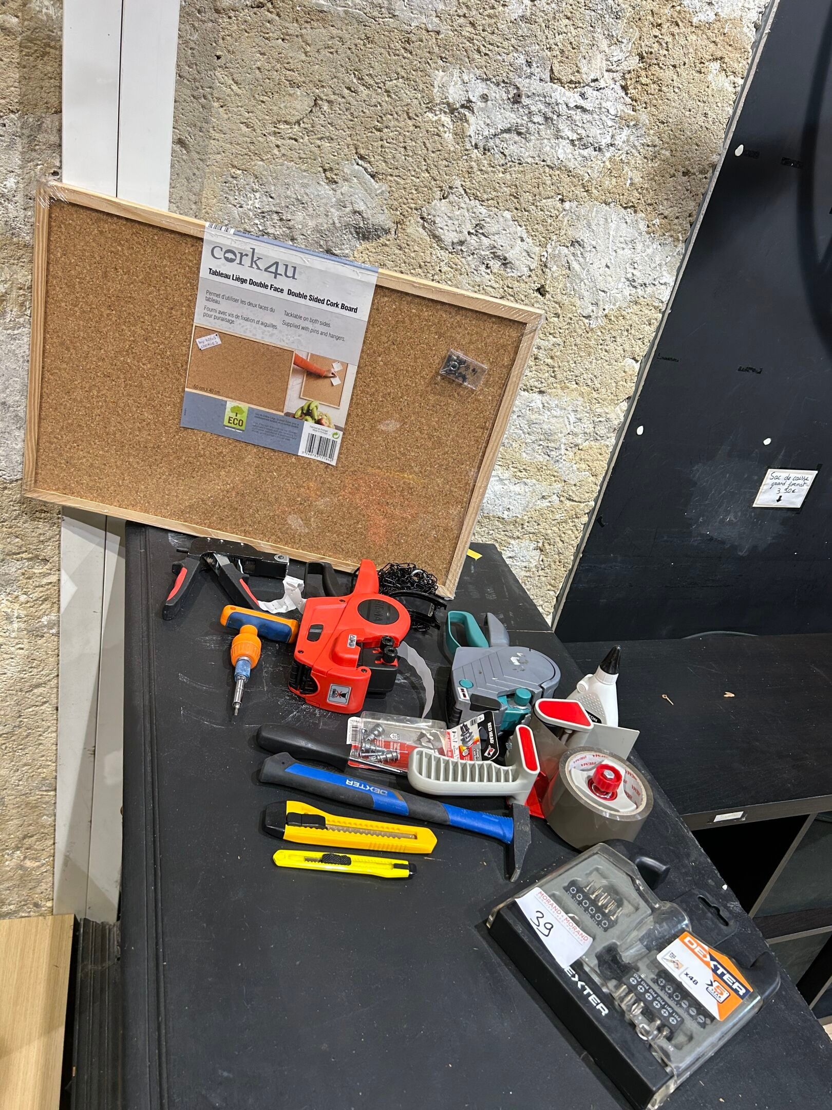 Includes 1 metal mobile display stand, 1 umbrella stand and 1 small set of miscellaneous tools (1 hammer, 1 screwdriver, 1 set of bits, 1 pair of pliers), 3 scotch tape machines.