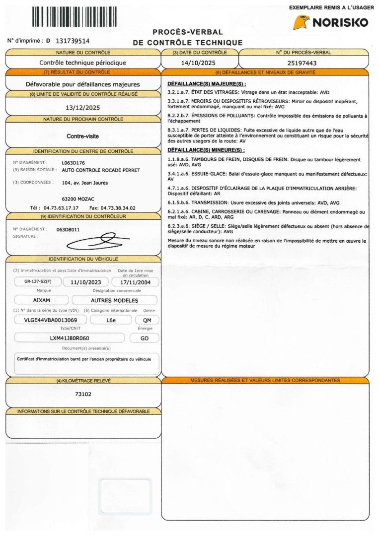 QM AIXAM AIXAM 500.4 PLUS - Type : QM - Body : QLEMP - Energy : GO - Odometer : 73102 - 1ere M.E.C : 17/11/2004 - Power : 1 - Type mines : LXM41J80R060 - 2 keys - With registration document - Chocs carrosserie - VEHICLE NON GAGE. Voluntary charges: 21.600% inc. VAT + €40 excl. VAT if purchased live. No recoverable VAT. EXHIBITION WEDNESDAY 26 NOVEMBER 2025 FROM 11AM TO NOON : 9 RUE BLAISE PASCAL 63200 MOZAC