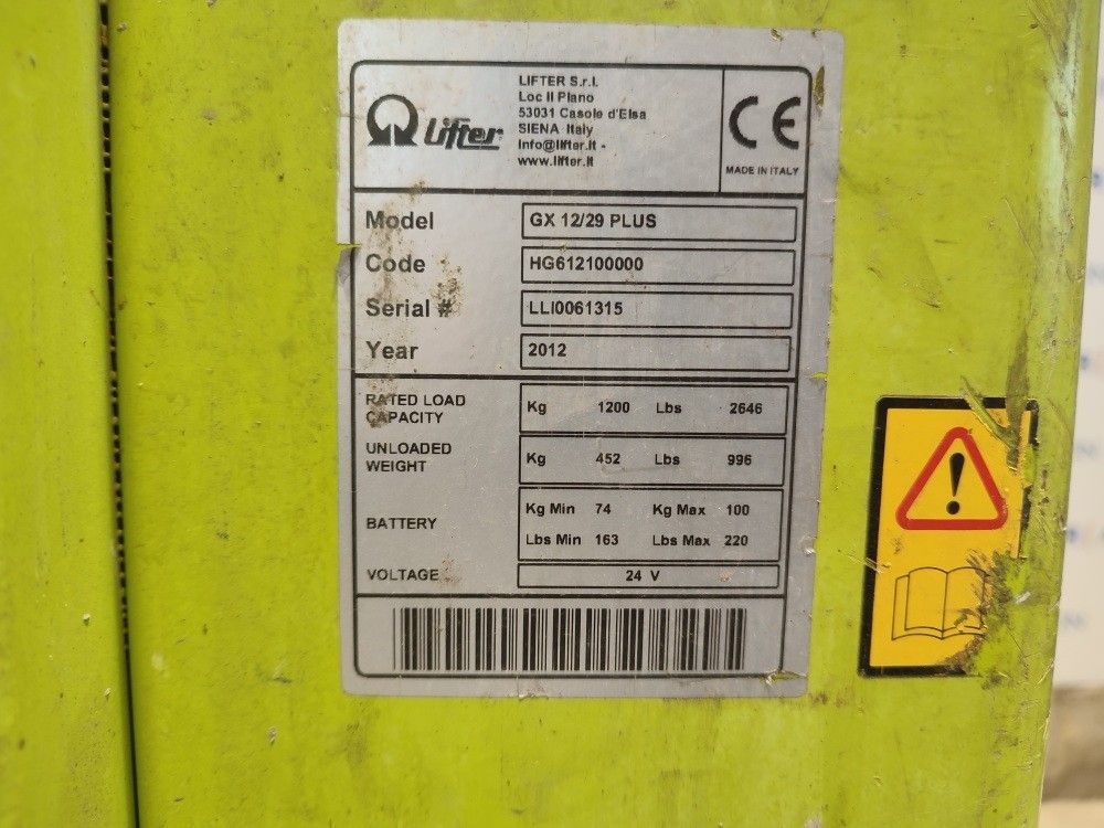 LIFTER - GERBEUR ELECTRIQUE 1T GX 12/29 PLUS - MISE EN SERVICE PLACE DE STOCKAGE : Rennes - LIFTER - GERBEUR ELECTRIQUE 1T GX 12/29 PLUS - - MISE EN SERVICE Numéros de série : - Descriptif : 2012 - Fonctionne - Capacité maximale : 1200 KG
