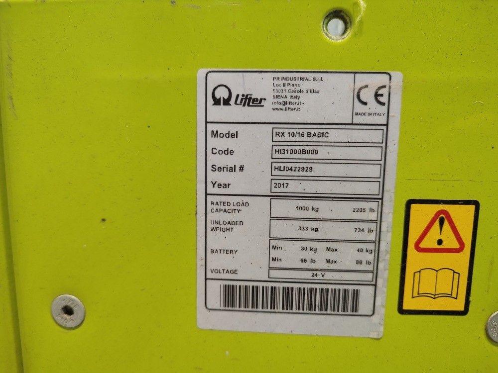 LIFTER - ELECTRIC LIFTER - RX 10/16 BASIC - COMMISSIONING STORAGE LOCATION: Rennes - LIFTER - ELECTRIC LIFTER - RX 10/16 BASIC - - COMMISSIONING Serial numbers: - Description: 2017 - Capacity 1 000 Kg - Batteries not included - Incomplete - Not tested - Year: 2017 - Empty weight: 0