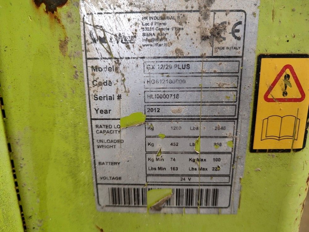 LIFTER - GERBEUR ÉLECTRIQUE 1T GX 12/29 - MISE EN SERVICE PLACE DE STOCKAGE: Rennes - LIFTER - GERBEUR ÉLECTRIQUE 1T GX 12/29 - - MISE EN SERVICE Serial numbers: - Description: 2012 - Capacity 1200 kg at 2.45m - Battery cover missing - Batteries out of order - Plexiglass broken - Does not work - Year: 2012 - Empty weight: 0
