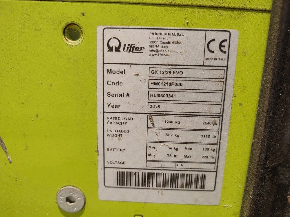 LIFTER - ELECTRIC LIFTER - GX 12/29 EVO - COMMISSIONING STORAGE LOCATION: Rennes - LIFTER - ELECTRIC LIFTER - GX 12/29 EVO - - COMMISSIONING Serial numbers: - Description: 2018 - Incomplete - Capacity 1 200 Kg - Serial number: HLI0500341 - Does not work - Year: - Empty weight: 0