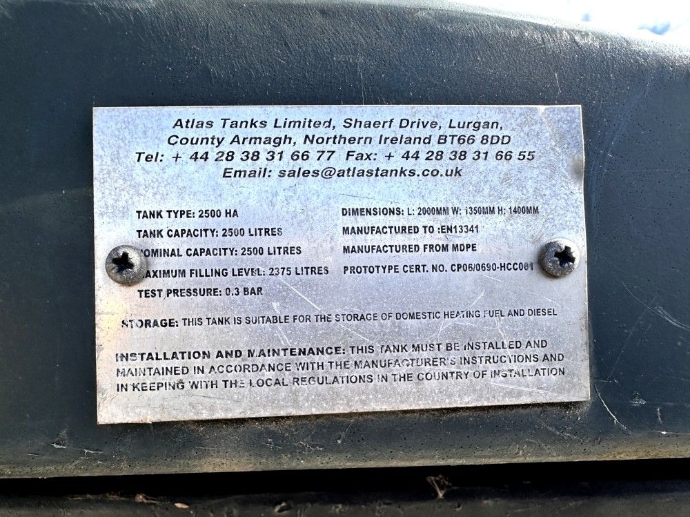 ATLAS TANK - CUVE A CARBURANT 2500 LITRES AVEC POMPE DOUBLE PAROIE 2500HA - MISE EN SERVICE PLACE DE STOCKAGE : Rennes - ATLAS TANK - CUVE A CARBURANT 2500 LITRES AVEC POMPE DOUBLE PAROIE 2500HA - - MISE EN SERVICE Numéros de série : - Descriptif : Pompe 220 volts POLARIS - Totaliseur : 130288 litres - Manque pistolet de distribution - Année : - Poids à vide : 0