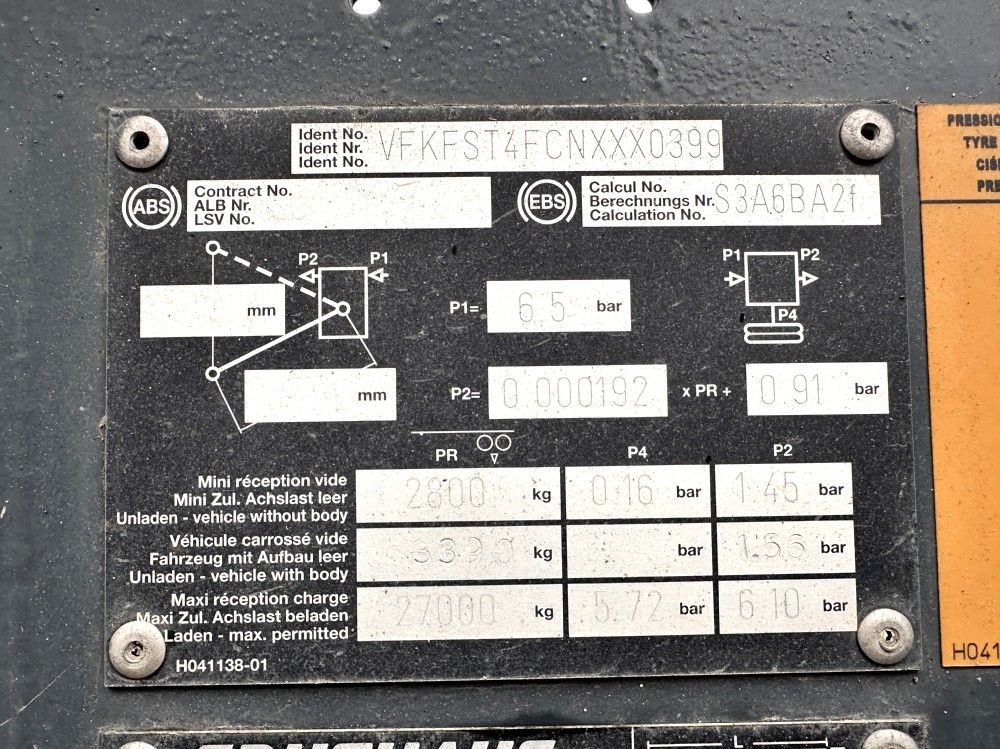 FRUEHAUF - SEMI-TRUCK 3 AXLES CONTAINER TRANSPORT - - KM : 0 (non certifié) - DATE MEC : 2022-10-03 - Sold without registration but with an identification sheet - Non exportable - Air suspension - Axle SAF - PV : 3.94 tonnes - PTAC : 38 tonnes - Length : 13.80 metres - Width : 2.50 metres - Surface : 34.50 m2 - Tyres: 385/65R22 - 5 - Single wheel + Container lock + Disc brakes + Fire extinguisher + ABS + Bicycle guard - Remote inflation - Container size 40 feet - Missing 1 mudguard + 1 brokenSTORAGE PLACE : Rennes - FRUEHAUF - SEMI TRUCK CARRIER 3 AXLES - - KM : 0 (non certifié) - DATE MEC : 2022-10-03 - Vendu sans carte grise mais avec une fiche d'identification - Non exportable - Suspension pneumatique - Axieu SAF - PV : 3.94 tonnes - GVWR: 38 tonnes - Length: 13.80 metres - Width: 2.50 metres - Surface area: 34.50 m2 - Tyres: 385/65R22 - 5 - Single wheel + Container lock + Disc brakes + Fire extinguisher + ABS + Cycle guard - Remote inflation - Container size 40 feet - Missing 1 mudguard + 1 broken Serial numbers: VFKFST4FCNXXX0399 - Description: - Year: - Unladen weight: 3940