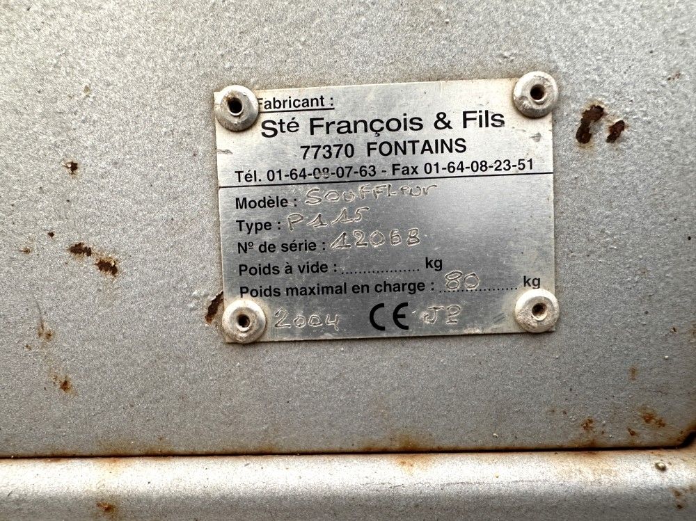 L. FRANCOIS ET FILS - LEAF BLOWER FOR P115 TRACTOR - COMMISSIONING PLACE OF STORAGE: Rennes - L. FRANCOIS ET FILS - LEAF BLOWER FOR P115 TRACTOR - - COMMISSIONING Serial numbers: 12068 - Description: Grey - 3-point linkage - PTO shaft present - Equipment not tested - Year: 2004 - Empty weight: 80