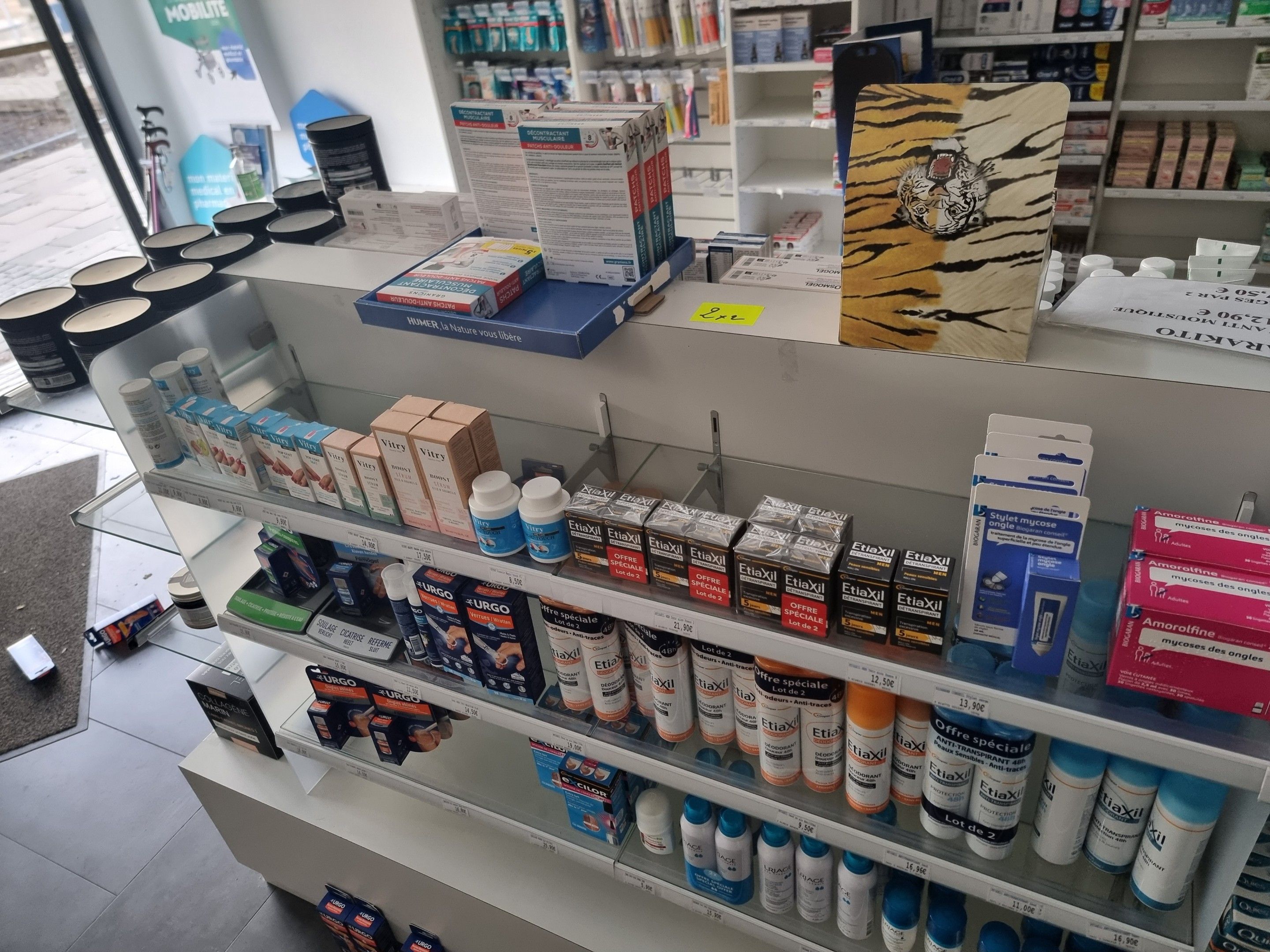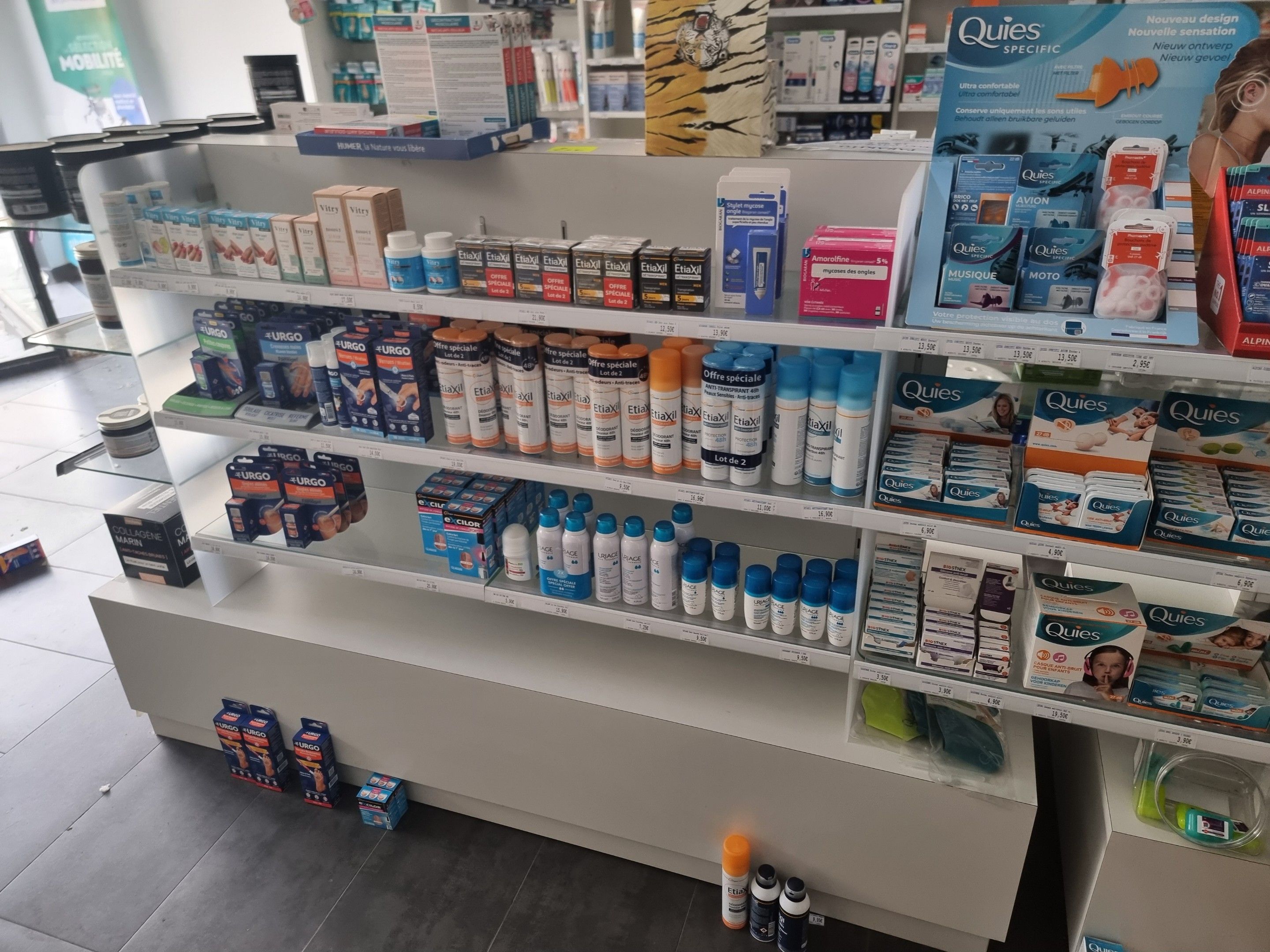 2 double gondolas in white laminate and glass shelves, 3 levels, approx. 4 x 0.80 m