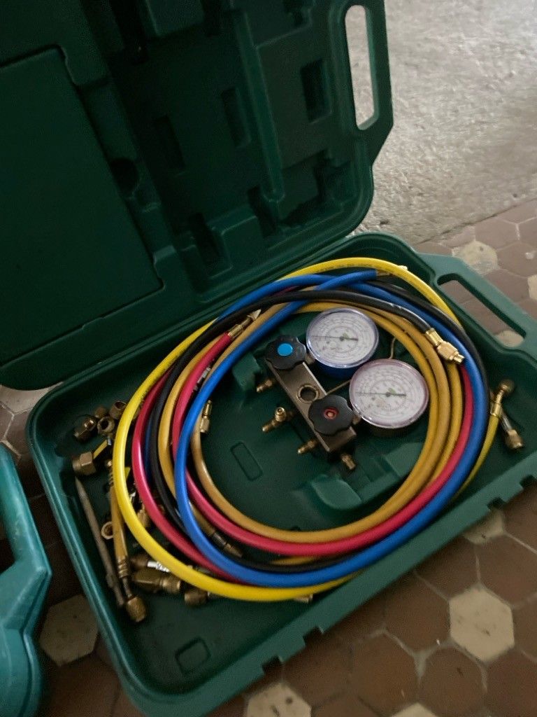 REFCO 3-way refrigeration charging station with pressure gauges and hoses, in carrying case.