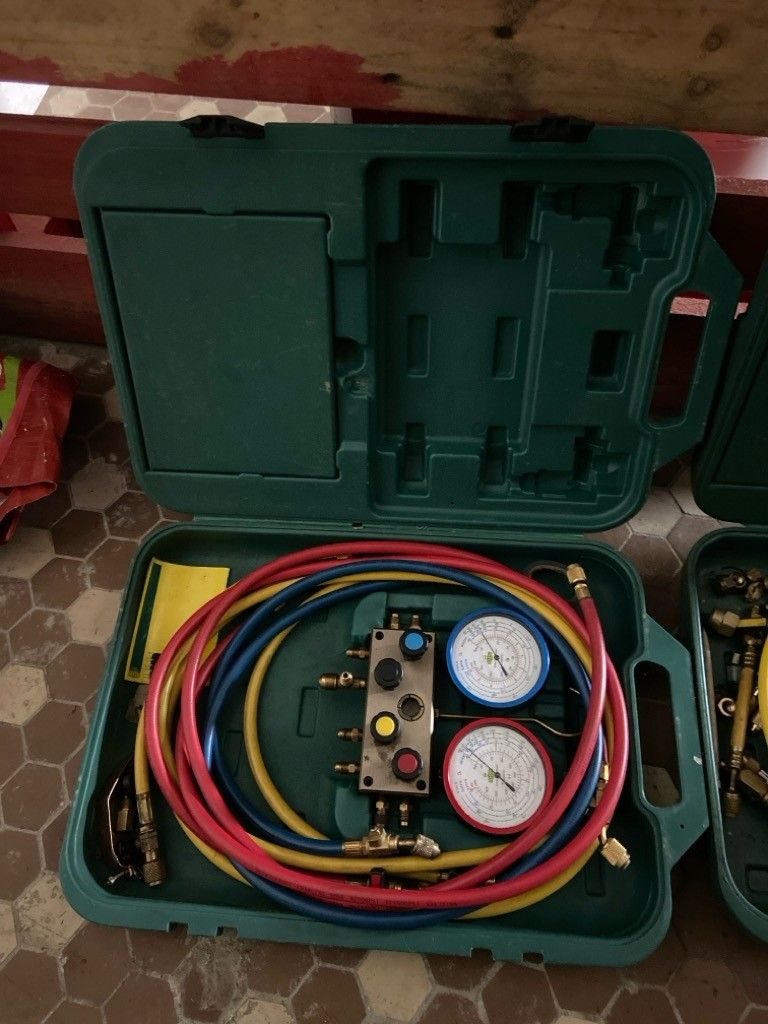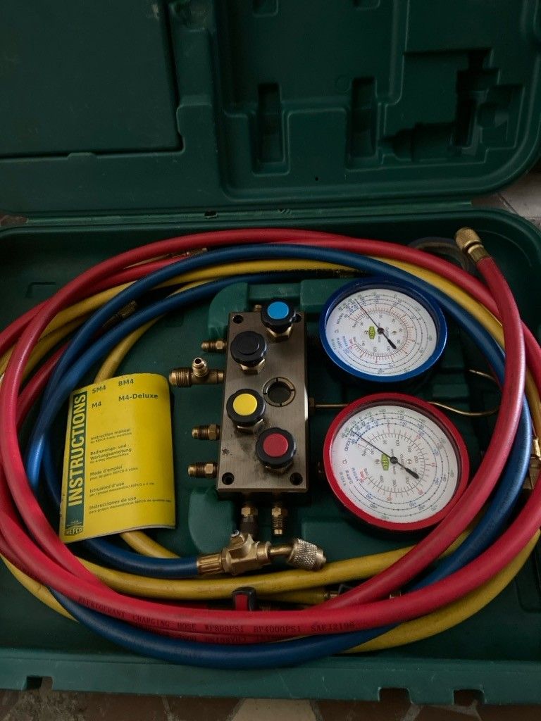 REFCO 4-way refrigeration charging station with pressure gauges and hoses, in carrying case.